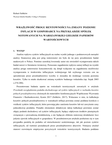 Robert Sobków Wyższa Szkoła Handlu i Usług w Poznaniu WRAŻLIWOŚĆ PROGU RENTOWNOŚCI NA ZMIANY POZIOMU INFLACJI W GOSPODARCE NA PRZYKŁADZIE SPÓŁEK NOTOWANYCH NA WARSZAWSKIEJ GIEŁDZIE PAPIERÓW WARTOŚCIOWYCH 1. WSTĘP Analiza wpływu zysków inflacyjnych na realne wyniki jednego z podstawowych narzędzi analizy finansowej jaką jest próg rentowności nie była do tej pory przedmiotem badań naukowych w Polsce. Pomimo szerokiej kwerendy autor nie stwierdził występowania takich badań nawet w literaturze światowej. Poruszane zagadnienia wpływu samej inflacji na wyniki analizy progu rentowności koncentrowały się dotąd wyłącznie na zagadnieniu możliwości występowania w środowisku inflacyjnym wolniejszego lub szybszego wzrostu cen na sprzedawane przez przedsiębiorstwo wyroby w stosunku do średniego wzrostu poziomu kosztów. Tylko to miało skutkować zmianą wyników badanego wskaźnika (np. Sojak 2003 s.274-280). Prezentowane badania oparto na wnioskach teoretycznych zawartych w artykule Przesłanki uwzględnienia podatku dochodowego od zysków inflacyjnych w rachunku kosztów pełnych przedsiębiorstwa złożonych do materiałów konferencyjnych Współczesne Wyzwania Finansów i Rachunkowości, Konin 2017 (Sobków, 2017). Wskazano w nim, że kalkulacja kosztów pełnych przedsiębiorstwa w warunkach inflacji powinna zostać poddana korekcie o wielkość zysków inflacyjnych, które powstają jako zaniżenie kosztów lub też zawyżenie ceny jednostkowej produktu. Ponadto elementem składowym takiej kalkulacji powinien zostać objęty podatek dochodowy od zysków inflacyjnych, będący odpływem środków pieniężnych związanym z prowadzoną działalnością, a nie będącym efektem rentownej działalności lecz jedynie zjawisk inflacyjnych w gospodarce. W przedmiotowym artykule posłużono się w tym przypadku paralelą do podatku od nieruchomości uzależnionego, tak jak poziom zysków inflacyjnych, od wartości posiadanych przez przedsiębiorstwo aktywów. Niniejszy artykuł stanowi rozwinięcie empiryczne powyższych wniosków teoretycznych. Badaniu poddano 1 wpływ na wyniki obliczeń progu rentowności przy uwzględnieniu w kalkulacji zysków inflacyjnych i płaconego od nich podatku dochodowego, a przeprowadzono je na podstawie dwóch przedsiębiorstw notowanych na Warszawskiej Giełdzie Papierów Wartościowych, objętych indeksem WIG-20: PKN ORLEN S.A. oraz PGE S.A. Praca została podzielona na pięć części, z których pierwszą stanowi wstęp. W rozdziale drugim przedstawiono czynniki korygujące poziom progu rentowności w warunkach inflacyjnych wobec warunków bezinflacyjnych. W rozdziale trzecim wyprowadzono wzór na próg rentowności w warunkach inflacji, uwzględniający konieczne modyfikacje wskazane w rozdziale drugim. W rozdziale czwartym dokonano analizy wrażliwości progu rentowności obu badanych spółek na zmiany poziomu inflacji w gospodarce. Część piąta jest podsumowaniem wyników badań zaprezentowanych w niniejszym artykule. 2. CZYNNIKI KORYGUJĄCE POZIOM PROGU RENTOWNOŚCI W WARUNKACH INFLACYJNYCH WOBEC WARUNKÓW BEZINFLACYJNYCH Próg rentowności (Break Even Point – BEP) określa zgodnie z definicją taki wymiar działalności przedsiębiorstwa, przy którym następuje zrównanie przychodów z ponoszonymi kosztami. Rozdziela on całą działalność przedsiębiorstwa na dwie strefy tj. strefę straty i strefę zysku (Gabrusewicz 1994, s.103). Próg rentowności może zostać określony jako: a) ilość wytwarzanych produktów, b) wartość wytwarzanych produktów, c) stopień wykorzystania posiadanych mocy wytwórczych przedsiębiorstwa lub procent realizacji obecnego poziomu produkcji bądź sprzedaży (Pazio, 2002, s.125). W niniejszym artykule posłużono się trzecią formułą wyznaczania progu rentowności. Tak zdefiniowany poziom progu rentowności obliczyć można z poniższego równania: S * x = Ks + Kz * x gdzie: S - poziom sprzedaży przedsiębiorstwa, Ks - poziom kosztów stałych, Kz - poziom kosztów zmiennych, x - stopień realizacji obecnego poziomu sprzedaży (w %). 2 Z przekształcenia powyższego równania otrzymujemy wzór na próg rentowności w warunkach bezinflacyjnych: Ks x = S - Kz W przypadku uzyskiwania przez przedsiębiorstwo sprzedaży wyższej od obliczonego progu powinno ono odnotować zysk. W analizie progu rentowności za koszt przyjmuje się wszystkie wydatki ponoszone w związku z całokształtem działalności wytwórczej sprzedawanych dóbr lub usług. W warunkach gospodarki bezinflacyjnej wydatek związany z płatnością podatku dochodowego nie jest uznawany za koszt prowadzonej działalności. Wręcz przeciwnie – jest on konsekwencją działalności charakteryzującej się nadwyżką uzyskiwanej ceny nad kosztami wytworzenia dobra lub usługi i stanowi element podziału tej nadwyżki. Inaczej jednak na powyższe zagadnienie należy spojrzeć w warunkach inflacyjnych. Poziom odnotowywanego zysku nie jest bowiem w tych warunkach wynikiem wyłącznie nadwyżki uzyskiwanych przychodów nad kosztami ich uzyskania. W środowisku inflacyjnym przedsiębiorstwo odnotowuje oprócz takich zysków, które dla potrzeb tego artykułu nazwać możemy zwykłymi, również zyski fikcyjne, zwane też inflacyjnymi. Zyski inflacyjne nie są zaś wynikiem rentownej działalności, lecz jedynie skutkiem zjawisk inflacyjnych w gospodarce i podatności konkretnego przedsiębiorstwa na wpływ tych czynników na obliczany poziom wartości jego sprzedaży, czy księgowo naliczanych kosztów (Hasbrouck, 1983). Deformuje to realny wynik jaki osiąga przedsiębiorstwo na prowadzonej działalności. Źródła powstawania zysku inflacyjnego są związane z posiadaniem przez przedsiębiorstwo aktywów i pasywów. Posiadanie zaś aktywów i pasywów jest immanentną cechą prowadzonej działalności gospodarczej. Tak jak nie istnieje działalność gospodarcza niezwiązana z ponoszeniem kosztów, tak też nie ma ta