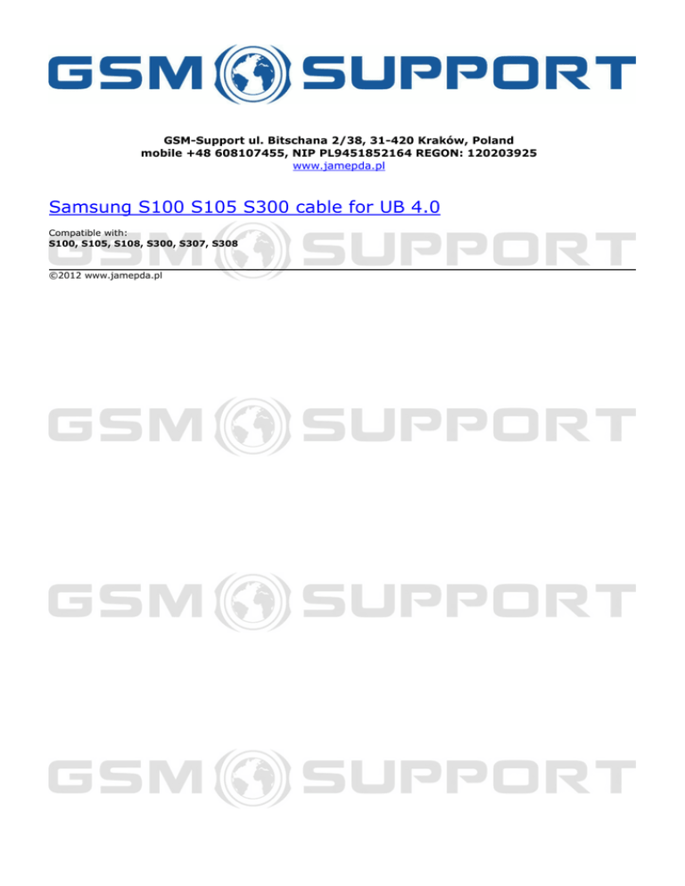 GSM-Support ul. Bitschana 2/38, 31-420 Kraków, Poland mobile +48 608107455, NIP PL9451852164 REGON: 120203925 www.jamepda.pl Samsung S100 S105 S300 cable for UB 4.0 Compatible with: S100, S105, S108, S300, S307, S308 ©2012 www.jamepda.pl Powered by TCPDF (www.tcpdf.org)
