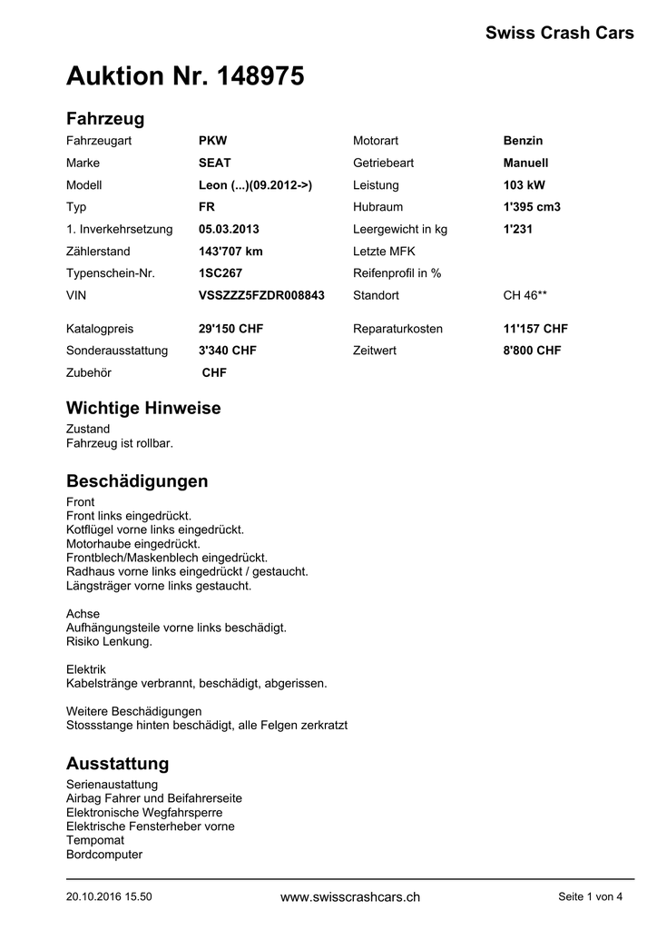 Swiss Crash Cars Auktion Nr. 148975 Fahrzeug Fahrzeugart PKW Motorart Benzin Marke SEAT Getriebeart Manuell Modell Leon (...)(09.2012->) Leistung 103 kW Typ FR Hubraum 1'395 cm3 1. Inverkehrsetzung 05.03.2013 Leergewicht in kg 1'231 Zählerstand 143'707 km Letzte MFK Typenschein-Nr. 1SC267 Reifenprofil in % VIN VSSZZZ5FZDR008843 Standort CH 46** Katalogpreis 29'150 CHF Reparaturkosten 11'157 CHF Sonderausstattung 3'340 CHF Zeitwert 8'800 CHF Zubehör CHF Wichtige Hinweise Zustand Fahrzeug ist rollbar. Beschädigungen Front Front links eingedrückt. Kotflügel vorne links eingedrückt. Motorhaube eingedrückt. Frontblech/Maskenblech eingedrückt. Radhaus vorne links eingedrückt / gestaucht. Längsträger vorne links gestaucht. Achse Aufhängungsteile vorne links beschädigt. Risiko Lenkung. Elektrik Kabelstränge verbrannt, beschädigt, abgerissen. Weitere Beschädigungen Stossstange hinten beschädigt, alle Felgen zerkratzt Ausstattung Serienaustattung Airbag Fahrer und Beifahrerseite Elektronische Wegfahrsperre Elektrische Fensterheber vorne Tempomat Bordcomputer 20.10.2016 15.50 www.swisscrashcars.ch Seite 1 von 4 Auktion Nr. 148975 Swiss Crash Cars Ausstattung TCS Elektronische Traktionskontrolle Sportfahrwerk Seitenairbag Fahrer und Beifahrerseite Zentralverriegelung mit Fernbedienung Kopfairbag vorne und hinten Multifunktionslenkrad ABS und EBV Elektr. Bremskraftverteilung Deaktivierung Beifahrerairbag Aussenspiegel elektrisch verstellbar/ heizbar und anklappbar Sportsitze inkl. Lordosen Radio/ CD/ MP3 Servolenkung geschwindigkeitsabhängig Knieairbag Fahrer Vordersitze höhenverstellbar Zwei Zonen-Klimaanlage Climatronic Kindersitzverankerung ISOFIX hinten Abgedunkelte Scheiben ab B-Säule Mobiltelefon Freisprechanlage/ Bluetooth Rücksitzlehne geteilt 1/3 oder 2/3 / umklappbar USB-Schnittstelle Nebelscheinwerfer mit Corner Funktion Berganfahrhilfe Reifen-Reparatur Set Start + Stopp Funktion ESP/ DSR/ EBA/ XDS/ RDK Keine Gewähr auf die Angaben der Serienausstattungen Seat Media System Color Pack Style Plus Sonderausstattung Sound-System Pack Winter Einparkhilfe vorne und hinten mit Anzeige Müdigkeitserkennung (Tiredness detection) Pack Komfort 2 Pack Fahrassistenz DAB+ Digital Audio Broadcast Navigationssystem Seat Media System Fotos 20.10.2016 15.50 www.swisscrashcars.ch Seite 2 von 4 Auktion Nr. 148975 20.10.2016 15.50 Swiss Crash Cars www.swisscrashcars.ch Seite 3 von 4 Auktion Nr. 148975 20.10.2016 15.50 Swiss Crash Cars www.swisscrashcars.ch Seite 4 von 4