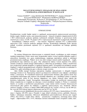 NEGATYWNE EFEKTY ZWIĄZANE ZE SPALANIEM I WSPÓŁSPALANIEM BIOMASY W KOTŁACH Tomasz HARDY*, Anna MUSIALIK-PIOTROWSKA**, Joanna CIOŁEK** Krzysztof MOŚCICKI*, Włodzimierz KORDYLEWSKI* Politechnika Wrocławska, Wybrzeże S. Wyspiańskiego 27, 50-370 Wrocław *Instytut Techniki Cieplnej i Mechaniki Płynów, **Instytut Inżynierii Ochrony Środowiska [email protected] STRESZCZENIE Przedstawiono wyniki badań stężeń w spalinach normowanych zanieczyszczeń powietrza, tlenku węgla i tlenków azotu, oraz nienormowanych – lotnych związków organicznych (LZO) i HCl emitowanych, podczas spalania wybranych rodzajów biomasy w grzewczym kotle retortowym o mocy 15 kW. W grupie LZO w najwyższych stężeniach występowały aldehydy – formaldehyd i aldehyd octowy – oraz benzen. Najniższe stężenia CO, a jednocześnie najwyższe LZO, wykryto podczas spalania drewna. Konstrukcja badanego kotła sprzyja jednak wysokim poziomom stężenia CO w spalinach niezależnie od rodzaju spalanej biomasy. 1. Wstęp Na zmiany klimatyczne obserwowane w ostatnich latach, wynikające ze stale rosnącej średniej temperatury Ziemi, może mieć bezpośredni wpływ wzrost stężenia ditlenku węgla w atmosferze ziemskiej, tzw. gazu cieplarnianego, mającego największy udział w absorpcji promieniowania cieplnego. Wpływ na to ma stale rosnące zużycie paliw kopalnych – węgla, pochodnych ropy naftowej czy gazu. Aby zahamować dalszy wzrost stężenia CO2 należy istotnie zwiększyć udział energii odnawialnej w całkowitej jej produkcji. Jedną z możliwości jest zwiększenie udziału biopaliw w ogólnym bilansie paliw, szczególnie do produkcji energii cieplnej w małych gospodarstwach wiejskich. Biopaliwa uważane są bowiem za neutralne w emisji CO2, gdyż asymilują ten gaz w okresie swego wzrostu. Jako źródło energii biomasa najczęściej znajduje zastosowanie w ubogich krajach trzeciego świata [1-3]. Najczęściej stanowi ją miejscowa roślinność oraz odpady z produkcji rolnej i zwierzęcej. W warunkach krajowych zastosowanie biomasy jako paliwa może być szczególnie interesujące gdy stanowi ona produkt odpadowy np. z produkcji rolnej w małych gospodarstwach; może to być drewno odpadowe, czy słomy różnych zbóż, takich jak pszenica, kukurydza, rzepak. Szczególnie interesująca wydaje się możliwość zastosowania słomy rzepakowej ze względu na znaczący wzrost produkcji rzepaku w Polsce w ostatnich latach, co wynika z możliwości pozyskiwania z jego ziarna estrów kwasów tłuszczowych stosowanych jako paliwo do silników o zapłonie samoczynnym, tzw. biodiesla. Obszar zasiewu rzepaku w Polsce w latach 2000-2006 podwoił się, wzrósł z 410 tys. ha do 840 tys. ha, a na rok 2010 obszar uprawy planowany jest na 975 tys. ha [4]. Podstawowymi składnikami drewna jest celuloza (45-55% mas.), hemiceluloza (12-20% mas.) i ligniny (20-30% mas.). Ponadto w jego skład wchodzą żywice, garbniki, tłuszcze, białka i substancje mineralne. Głównym składnikiem pierwiastkowym drewna jest węgiel (50%), tlen (43%) i wodór (6%). Słomy – pszeniczna i rzepakowa, zawierają nieco mniej węgla – odpowiednio 45% i 47%. Biomasa zawiera minimalne ilości związków siarki, max. 145 0,5% suchej masy; dla porównania jej zawartość w suchej masie węgla wynosi 0,5-7,5%. W popiele po spalaniu biomasy stwierdza się około dwukrotnie niższą zawartość Al2O3 i Fe2O3 natomiast zdecydowanie więcej K2O (4-48% mas.) w porównaniu z węglem (2-6% mas.) [5]. Biomasa zawiera również chlor – w drewnie jego zawartość jest nieznaczna (średnio 0,01% mas.) natomiast bardzo wysoka w słomie i wynosi 0,63 i 0,477% mas. odpowiednio dla słomy rzepakowej i pszenicznej. Wysoka zawartość związków chloru jest przyczyną istotnych problemów eksploatacyjnych kotłów zasilanych biomasą związanych ze zwiększonym zwykle zagrożeniem korozją chlorkową. Jeśli nawet biomasa nie zawiera chloru, to duży udział potasu w popiele z biomasy typu ligninoceluloza powoduje zwiększone żużlowanie, co może także intensyfikować zjawisko korozji i może utrudniać prawidłową pracę kotłów. Spalanie biomasy, podobnie jak innych paliw stałych można podzielić na etapy: suszenia i nagrzewania paliwa, pirolizy czyli etap odgazowania paliwa, zapłonu części lotnych i pozostałości stałej – smoły i koksu. Rozkład termiczny biomasy rozpoczyna się już powyżej 220oC, a poszczególne składniki – hemiceluloza w zakresie 220-320oC, celuloza w 320-380oC oraz lignina w 220-500oC. Schemat procesu spalania biomasy, w tym również drewna, przedstawiono na rys. 1 [6]. Paliwo BIOMASA Produkty pirolizy Odmiana spalania części lotne płomień smoła koks tlenie Rys. 1. Schemat procesu spalania biomasy Na skład zanieczyszczeń emitowanych podczas spalania drewna ma wpływ sposób prowadzenia procesu i warunki spalania, konstrukcja paleniska i jakość paliwa. Biomasa ma niższą wartość opałową (14-21 MJ/kg) niż węgiel (23-28 MJ/kg), co wynika z większej zawartości wilgoci, natomiast niższą temperaturę zapłonu (145-153oC oraz 217-223oC odpowiednio dla biomasy i węgla), co z kolei wynika z większej zwartości części organicznych [5]. Spalanie i współspalanie biomasy będzie powodowało niższą emisję CO, CO2, NOx and SO2 [7]. Jednak poza niższymi stężeniami normowanych zanieczyszczeń gazy ze spalania biomasy mogą zawierać lotne związki organiczne (LZO) oraz szczególnie niebezpieczne wielopierścieniowe węglowodory aromatyczne (WWA). Analiza źródeł emisji LZO w Finlandii wykazała, że w powietrzu w centrach miast ich głównym źródłem były spaliny silnikowe, podczas gdy na obszarach niskiej zabudowy mieszkalnej – spalanie drewna w celu pozyskania ciepła [8]. Biomasa, a zwłaszcza słoma, w celu wykorzystania energetycznego musi być poddana procesowi zagęszczenia, poprzez prasowanie, brykietowanie czy granulowanie. Oferowane handlowo niewielkie kotły na biopa