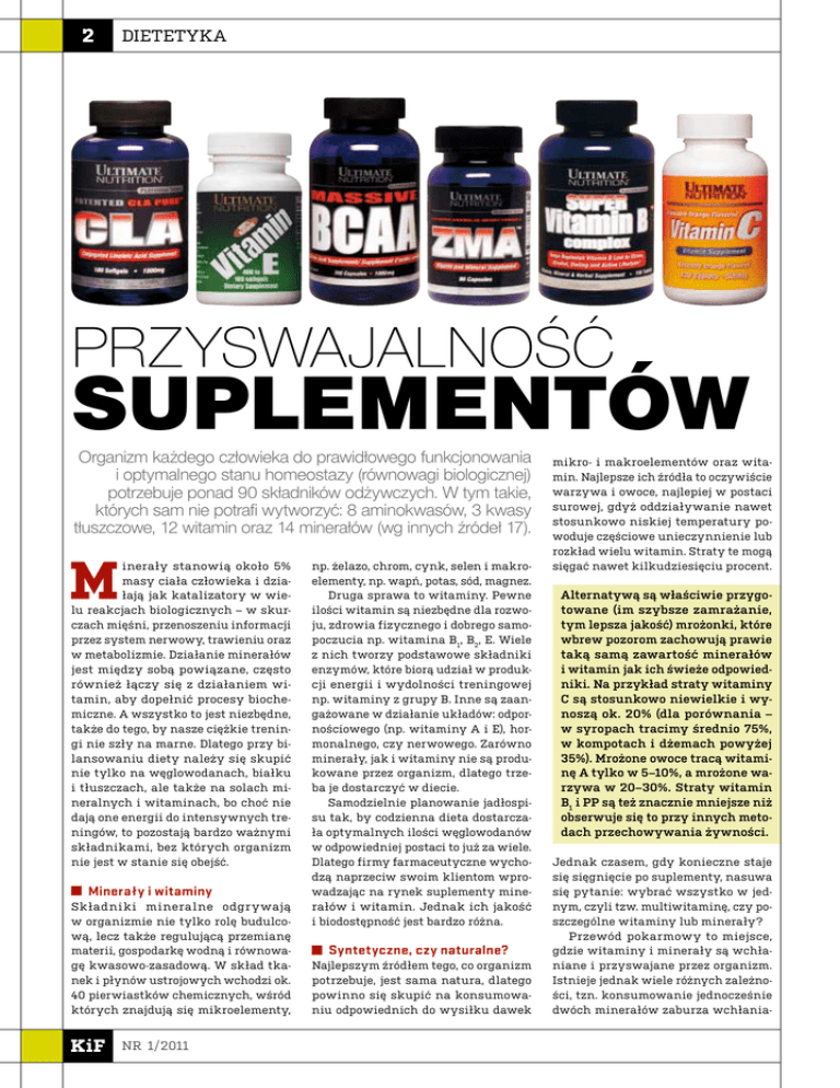 2 DIETETYKA PRZYSWAJALNOŚĆ SUPLEMENTÓW Organizm każdego człowieka do prawidłowego funkcjonowania i optymalnego stanu homeostazy (równowagi biologicznej) potrzebuje ponad 90 składników odżywczych. W tym takie, których sam nie potrafi wytworzyć: 8 aminokwasów, 3 kwasy tłuszczowe, 12 witamin oraz 14 minerałów (wg innych źródeł 17). M inerały stanowią około 5% masy ciała człowieka i działają jak katalizatory w wielu reakcjach biologicznych – w skurczach mięśni, przenoszeniu informacji przez system nerwowy, trawieniu oraz w metabolizmie. Działanie minerałów jest między sobą powiązane, często również łączy się z działaniem witamin, aby dopełnić procesy biochemiczne. A wszystko to jest niezbędne, także do tego, by nasze ciężkie treningi nie szły na marne. Dlatego przy bilansowaniu diety należy się skupić nie tylko na węglowodanach, białku i tłuszczach, ale także na solach mineralnych i witaminach, bo choć nie dają one energii do intensywnych treningów, to pozostają bardzo ważnymi składnikami, bez których organizm nie jest w stanie się obejść. JJ Minerały i witaminy Składniki mineralne odgrywają w organizmie nie tylko rolę budulcową, lecz także regulującą przemianę materii, gospodarkę wodną i równowagę kwasowo-zasadową. W skład tkanek i płynów ustrojowych wchodzi ok. 40 pierwiastków chemicznych, wśród których znajdują się mikroelementy, KiF nr 1 / 2011 np. żelazo, chrom, cynk, selen i makroelementy, np. wapń, potas, sód, magnez. Druga sprawa to witaminy. Pewne ilości witamin są niezbędne dla rozwoju, zdrowia fizycznego i dobrego samopoczucia np. witamina B1, B2, E. Wiele z nich tworzy podstawowe składniki enzymów, które biorą udział w produkcji energii i wydolności treningowej np. witaminy z grupy B. Inne są zaangażowane w działanie układów: odpornościowego (np. witaminy A i E), hormonalnego, czy nerwowego. Zarówno minerały, jak i witaminy nie są produkowane przez organizm, dlatego trzeba je dostarczyć w diecie. Samodzielnie planowanie jadłospisu tak, by codzienna dieta dostarczała optymalnych ilości węglowodanów w odpowiedniej postaci to już za wiele. Dlatego firmy farmaceutyczne wychodzą naprzeciw swoim klientom wprowadzając na rynek suplementy minerałów i witamin. Jednak ich jakość i biodostępność jest bardzo różna. JJ Syntetyczne, czy naturalne? Najlepszym źródłem tego, co organizm potrzebuje, jest sama natura, dlatego powinno się skupić na konsumowaniu odpowiednich do wysiłku dawek mikro- i makroelementów oraz witamin. Najlepsze ich źródła to oczywiście warzywa i owoce, najlepiej w postaci surowej, gdyż oddziaływanie nawet stosunkowo niskiej temperatury powoduje częściowe unieczynnienie lub rozkład wielu witamin. Straty te mogą sięgać nawet kilkudziesięciu procent. Alternatywą są właściwie przygotowane (im szybsze zamrażanie, tym lepsza jakość) mrożonki, które wbrew pozorom zachowują prawie taką samą zawartość minerałów i witamin jak ich świeże odpowiedniki. Na przykład straty witaminy C są stosunkowo niewielkie i wynoszą ok. 20% (dla porównania – w syropach tracimy średnio 75%, w kompotach i dżemach powyżej 35%). Mrożone owoce tracą witaminę A tylko w 5–10%, a mrożone warzywa w 20–30%. Straty witamin B1 i PP są też znacznie mniejsze niż obserwuje się to przy innych metodach przechowywania żywności. Jednak czasem, gdy konieczne staje się sięgnięcie po suplementy, nasuwa się pytanie: wybrać wszystko w jednym, czyli tzw. multiwitaminę, czy poszczególne witaminy lub minerały? Przewód pokarmowy to miejsce, gdzie witaminy i minerały są wchłaniane i przyswajane przez organizm. Istnieje jednak wiele różnych zależności, tzn. konsumowanie jednocześnie dwóch minerałów zaburza wchłania- DIETETYKA nie zarówno jednego, jak i drugiego. Np. multiwitamina zawierająca wapń i żelazo powoduje, że ani jeden z tych pierwiastków nie zostanie przyswojony i wykorzystany przez organizm, gdyż pierwiastki te są antagonistami i należy je przyjmować przynajmniej w dwugodzinnych odstępach. Tak samo wygląda to w przypadku czerpania tych minerałów z naturalnego pożywienia. Zatem jedząc mięso, czy warzywa zielone, można dopiero w odstępie dwóch godzin spożyć jogurt, czy koktajl mleczny, aby minerały zawarte w obu tych posiłkach zostały należycie przyswojone i wykorzystane przez organizm. Podobnie wygląda sytuacja z witaminami. Jednak jeśli decydujemy się na uzupełnienie diety suplementami witaminowo-mineralnymi to warto wiedzieć, na co zwrócić szczególną uwagę. JJ Kłopoty z wchłanianiem Większość sprzedawanych na rynku preparatów występuje w postaci soli mineralnych typu: siarczan żelaza, węglan wapnia, siarczan cynku, które charakteryzują się jedynie znikomą przyswajalnością przez organizm. Po rozbiciu tego kompleksu w przewodzie pokarmowym, minerał przyjmuje formę elektrycznie naładowanego jonu i wchodzi w reakcje z innymi składnikami pożywienia, stając się mało użyteczny. Jeżeli uświadomimy sobie fakt, że organizm potrafi wchłonąć tylko niewielką część składników mineralnych, z czego znaczna część ulega jeszcze wydaleniu, zrozumiemy, jak ważne jest przyjmowanie związków mineralnych pod postacią łatwo przyswajalną, np. w formie chelatów. JJ Zalety chelatów Niedawno na polskim rynku pojawiły się minerały i witaminy tzw. chelatowane. Są to minerały połączone z substancjami organicznymi (np. aminokwasy, mleczany, cytryniany, itd.). Słowo chelat pochodzi z języka greckiego i oznacza szpon. W wiązaniach proteinowych minerały otoczone są pierścieniem z aminokwasów, który niczym szpony drapieżnika trzymają je w środku. Podczas przyjmowania związków chelatowych przez organizm, pierścień z aminokwasów rozpuszcza się, a minerały zostają przez niego wchłonię- 3 te. Uwalniające się przy tym aminokwasy są tzw. orga