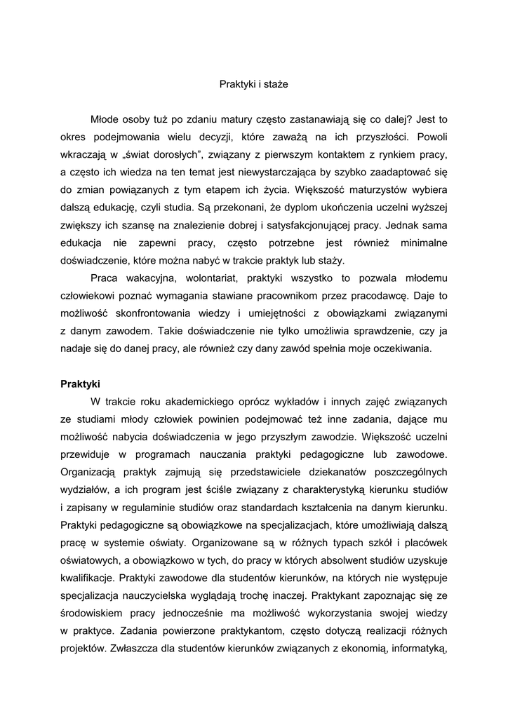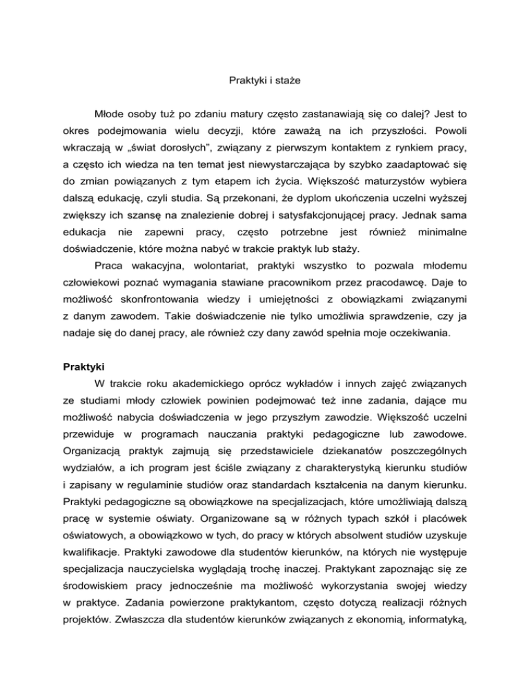 Praktyki i staŜe Młode osoby tuŜ po zdaniu matury często zastanawiają się co dalej? Jest to okres podejmowania wielu decyzji, które zawaŜą na ich przyszłości. Powoli wkraczają w „świat dorosłych”, związany z pierwszym kontaktem z rynkiem pracy, a często ich wiedza na ten temat jest niewystarczająca by szybko zaadaptować się do zmian powiązanych z tym etapem ich Ŝycia. Większość maturzystów wybiera dalszą edukację, czyli studia. Są przekonani, Ŝe dyplom ukończenia uczelni wyŜszej zwiększy ich szansę na znalezienie dobrej i satysfakcjonującej pracy. Jednak sama edukacja nie zapewni pracy, często potrzebne jest równieŜ minimalne doświadczenie, które moŜna nabyć w trakcie praktyk lub staŜy. Praca wakacyjna, wolontariat, praktyki wszystko to pozwala młodemu człowiekowi poznać wymagania stawiane pracownikom przez pracodawcę. Daje to moŜliwość skonfrontowania wiedzy i umiejętności z obowiązkami związanymi z danym zawodem. Takie doświadczenie nie tylko umoŜliwia sprawdzenie, czy ja nadaje się do danej pracy, ale równieŜ czy dany zawód spełnia moje oczekiwania. Praktyki W trakcie roku akademickiego oprócz wykładów i innych zajęć związanych ze studiami młody człowiek powinien podejmować teŜ inne zadania, dające mu moŜliwość nabycia doświadczenia w jego przyszłym zawodzie. Większość uczelni przewiduje w programach nauczania praktyki pedagogiczne lub zawodowe. Organizacją praktyk zajmują się przedstawiciele dziekanatów poszczególnych wydziałów, a ich program jest ściśle związany z charakterystyką kierunku studiów i zapisany w regulaminie studiów oraz standardach kształcenia na danym kierunku. Praktyki pedagogiczne są obowiązkowe na specjalizacjach, które umoŜliwiają dalszą pracę w systemie oświaty. Organizowane są w róŜnych typach szkół i placówek oświatowych, a obowiązkowo w tych, do pracy w których absolwent studiów uzyskuje kwalifikacje. Praktyki zawodowe dla studentów kierunków, na których nie występuje specjalizacja nauczycielska wyglądają trochę inaczej. Praktykant zapoznając się ze środowiskiem pracy jednocześnie ma moŜliwość wykorzystania swojej wiedzy w praktyce. Zadania powierzone praktykantom, często dotyczą realizacji róŜnych projektów. Zwłaszcza dla studentów kierunków związanych z ekonomią, informatyką, czy zarządzaniem. Decyzję dotyczącą wyboru miejsca praktyk podejmuje student. Oprócz instytucji i firm, które podpisały umowy z uczelnią moŜliwe jest odbywanie praktyk w innych firmach, jednak w tym przypadku student jest zobowiązany do samodzielnego załatwienia wszelkich formalności. NaleŜy pamiętać, Ŝe praktyki są zawsze bezpłatne. StaŜ Praktyki są jedną z podstawowych form nabywania doświadczenia zawodowego, która jest dostępna dla wszystkich. Kolejną moŜliwością zdobycia doświadczenia zawodowego jest staŜ. Jest moŜliwość z korzystania dwóch form staŜy. Pierwsza jest oferowane przez firmy prywatne, które są nastawione na rozwój i utrwalenie swojej pozycji na rynku. Drugą formą są staŜe absolwenckie oferowane przez powiatowe urzędy pracy. Obie formy mają wiele wspólnego, róŜnią je jednak choćby źródła finansowania, czy zakres osób, do których są adresowane. StaŜe w prywatnych firmach odbywają się bez skierowania z państwowej instytucji ( urząd pracy) oraz stanowią interesującą propozycję dla osób uczących się, zwłaszcza studentów. Często określane są konkretne granice wiekowe, najczęściej do 26 roku Ŝycia, ale czasem nawet i do 30 lat. MoŜna je porównać z praktykami jakie odbywają adepci niektórych zawodów, jak lekarze czy pedagodzy. Z punktu widzenia studenta chodzi bowiem o to, by prócz teoretycznej szkolnej wiedzy, nauczył się takŜe swojej przyszłej profesji w praktyce, poznał zasady funkcjonowania firm, wdroŜył się do pracy w organizacji. Bardzo waŜnym czynnikiem jest takŜe moŜliwość zdobycia doświadczenia zawodowego tak przydatnego w konstruowaniu CV w przyszłości. Zazwyczaj studenci przyjmowani są na okres od jednego do trzech miesięcy, często w dogodnym dla nich okresie wakacji, tak by nie musieli godzić pracy z nauką. Dzięki temu pracodawca ma moŜliwość wypełnienia braków kadrowych związanych z okresem letnim. Niewątpliwie jest to wyjątkowa szansa stworzona dla młodego człowieka. ZaangaŜowanie i dobra wola z jego strony pozwolą mu sprawdzić się, nabyć praktyczne umiejętności, stopniowo wdraŜać się do zawodu, zdobyć doświadczenie, a czasem nawet zarobić. Rola staŜysty w firmie zaleŜy oczywiście wyłącznie od woli stron zawierających umowę o staŜ oraz branŜy w jakiej działa firma. Zazwyczaj jednak są to wszelkiego rodzaju prace pomocnicze. Wśród głównych zadań znajduje się zbieranie danych, przygotowywanie projektów, załatwianie spraw bieŜących, wykonywanie telefonów, archiwizacja. Pracodawca ma moŜliwość obserwowania potencjalnego pracownika przez miesiąc lub dłuŜej, poznając tym samym jego umiejętności, zaangaŜowanie, osobowość. Decydując się zatem na zatrudnienie nowej osoby w przyszłości nie przyjmuje do pracy autora najlepszego listu motywacyjnego czy CV, lecz człowieka bezpośrednio sprawdzonego w warunkach bardziej wiarygodnych, niŜ poszczególne, nawet najbardziej profesjonalne etapy rekrutacyjne. Warto teŜ zauwaŜyć, Ŝe zatrudniając staŜystę pracodawca zyskuje pracownika, który po tygodniu pracy nie będzie rozczarowany zakresem powierzonych mu obowiązków czy atmosferą panującą w firmie. Decydując się bowiem na pozostanie, staŜysta doskonale zna realia, w jakich przyjdzie mu funkcjonować, jest wdroŜony w swoje obowiązki, wie jakie obowiązują procedury. Pracodawca zdaje sobie sprawę, Ŝe osoba bez Ŝadnego doświadczenia zawodowego będzie wymagała wsparcia, dlatego zazwyczaj ustanawia opiekuna odpowiedzialnego za wszelkie działania staŜysty, kier