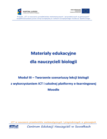P ro j e kt „ I CT w n au c z an i u p rz ed mi o t ó w mate mat yc z nyc h i p rz yro d n i c z yc h w g i mn az j ac h ” w s p ó łf i n an s o w an y p rz e z Un i ę E u ro p e j s ką w ramac h Eu ro p e j s ki e g o Fu n d u s zu Sp o łe c z n e g o Materiały edukacyjne dla nauczycieli biologii Moduł III – Tworzenie scenariuszy lekcji biologii z wykorzystaniem ICT i szkolnej platformy e-learningowej Moodle I C T w na u cz a n i u p r z e d m i o t ó w m a t e m a t y c z n y ch i p r z y r o d ni c z y ch w g i m na z j a c h Centrum Edukacji Nauczycieli w Suwałkach Centrum Edukacji Nauczycieli w Suwałkach, ul. Mikołaja Reja 67 B, 16-400 Suwałki tel./fax (87) 5670328; e-mail: [email protected] www.cen.suwalki.pl platforma: ict.suwalki.pl Autorzy: Joanna Raczyło Redakcja, skład i opracowanie graficzne: Jarosław Cezary Słabiński Publikacja współfinansowana przez Unię Europejską w ramach Europejskiego Funduszu Społecznego. Egzemplarz bezpłatny. Suwałki 2013 Zasoby edukacyjne dostępne w Internecie Nazwa portalu, strony Adres BioCEN http://www.biocen.edu.pl/ Scholaris http://www.scholaris.pl Globe http://www.gridw.pl/globe/ Interklasa http://www.interklasa.pl/ http://eduseek.interklasa.pl/przedmi oty/biologia/ http://eduplansze.pl/demo/Demo,0. html Wydawnictwa Szkolne i Pedagogiczne Wydawnictwo Edukacyjne Wiking Muzeum geologiczne Charakterystyka zasobów Zawiera nowoczesne pomoce edukacyjne: protokoły doświadczeń i scenariusze lekcji, ofertę warsztatów laboratoryjnych dla młodzieży, wykłady z biologii, linki do źródeł informacji biologicznych Internetowe Centrum Zasobów Edukacyjnych MEN. Zawiera: e-lekcje, ćwiczenia interaktywne, prezentacje multimedialne, symulacje zjawisk i procesów, filmy, zdjęcia itp. Internetowy badawczy program edukacyjny umożliwia poznawanie globalnych problemów środowiska Zawiera scenariusze lekcji, lekcje online, ciekawostki biologiczne, testy, gry, krzyżówki Serwis oświatowy, prowadzony przez Wydawnictwa Szkolne i Pedagogiczne. Znajdują się tam obudowy internetowe podręczników: informacje tekstowe, testy, zadania, ćwiczenia, animacje, interakcje Wersja demonstracyjna – plansze interaktywne http://www.wiking.edu.pl/ Zawiera wizualizacje procesów biologicznych i tablice edukacyjne http://geoportal.pgi.gov.pl/portal/pa Zawiera lekcje internetowe oraz zdjęcia ge/portal/muzeum/ okazów skamieniałości Biolog Naukowy portal informacyjny Alzheimer's Association DirectAnatomy.com http://www.biolog.pl/filmyprzyrodnicze.html Zawiera filmy przyrodnicze, naukowe, multimedia, zdjęcia przyrodnicze http://www.alz.org/brain_polish/link s.asp http://www.directanatomy.com/ Podróż w głąb mózgu Wirtualny wszechświat http://www.wiw.pl/biologia/ Życie Bałtyku http://hel.univ.gda.pl/jurek/index.ht m Bio.edu http://bio.edu.ee/ http://bio.edu.ee/models/pl/ Encyklopedia Klimatologiczna ESPERE http://www.espere.net/Aboutus/Pol ish/mater-eduk.html Atlas anatomiczny człowieka w języku angielskim Serwis popularnonaukowy i edukacyjny. Źródło wiedzy z zakresu genetyki, ewolucjonizmu, ekologii. Biologia w obrazkach Atlas organizmów i biotopów bałtyckich. Zawiera zdjęcia i filmy Świat komórek jest narzędziem nauczania wprowadzającym w zagadnienia procesów biologicznych komórek eukariotycznych za pomocą modeli Encyklopedia Klimatologiczna składa się z 10 działów tematycznych. Każdy dział jest podzielony na 6-8 pakietów edukacyjnych, Pakiet edukacyjny e-Bug http://www.e-bug.eu http://www.ebug.eu/senior_pack.aspx?cc=pl&ss= 1&t=Pakiet Edukacyjny e-Bug Polski portal telemedyczny http://www.telezdrowie.pl/ Abc Zdrowie http://abczdrowie.pl/ Infografiki http://infografiki.pl/fullscreen/e89aa 2eaf36290938b3dd84ecc524056.jpg Nasz Bałtyk http://www.naszbaltyk.pl/index.php Szkolnictwo.pl http://www.szkolnictwo.pl/nauka,1, Platforma_edukacyjna ZDROWIE.med.pl Internetowa encyklopedia zdrowia http://www.zdrowie.med.pl/ ZielonaLekcja.pl http://www.zielonalekcja.pl/ http://www.zielonalekcja.pl/index.p hp?mod=materialylista opracowanych osobno dla poziomu gimnazjum (podstawy) i liceum (więcej). Pakiet edukacyjny zawiera określona liczbę 2-4 tekstów naukowych oraz 2-3 ćwiczeń Zawiera szereg gier i materiałów edukacyjnych przybliżających świat drobnoustrojów, a także problemy szerzenia sie infekcji, zapobiegania im i ich leczenia. Kolejne rozdziały pakietu edukacyjnego zawierają szczegółowe scenariusze lekcji dla nauczycieli oraz materiały i karty pracy dla uczniów. Na stronie umieszczono również różne dodatkowe pomoce dydaktyczne tj. animacje, zdjęcia, filmy, prezentacje Portal oferuje interaktywne serwisy diagnostyczno-rehabilitacyjne w dziedzinach związanych ze zmysłami odpowiedzialnymi za komunikowanie się Zawiera informacje z zakresu edukacji zdrowotnej Infografika - Krew Strona przygotowana przez Morski Instytut Rybacki w ramach programu edukacyjnego „Chrońmy nasz Bałtyk” Zawiera scenariusze lekcji różnych przedmiotów, prezentacje, testy do lekcji Zawiera wiadomości z zakresu anatomii i fizjologii człowieka Przedstawia podstawowe objawy najczęstszych schorzeń, badania poszczególnych narządów oraz leczenie Zawiera materiały edukacyjne dotyczące edukacji ekologicznej. W bazie znajdują się filmy, artykuły, łamigłówki, konkursy, plakaty i scenariusze lekcyjne Przykłady multimediów Adres i data pobrania http://www.dailymotion.pl/video/xbpzna_serce-i-ukyadkryyenia_tech (pobrano 29.11.2010) http://www.dailymotion.pl/video/xboq9g_pracaserca_tech (pobrano 29.11.2010) http://www.dailymotion.pl/video/xbpy7m_naczyniaobwodowe_tech (pobrano 29.11.2010) http://www.dailymotion.pl/video/xbvdr6_uklad-ruchuczowieka_tech (pobrano 29.11.2010) http://www.dailymotion.pl/video/xbvctu_budowakoyci_tech (pobrano 29.11.2010) http://www.dailymotion.pl/video/xbvdyi_mechanizmskurczu-wlokna-miyynioweg_tech (pobrano 29.11.2010) http://www.youtube.com/watch?v=AcpGIh1zAe0&feature =related (pobrano