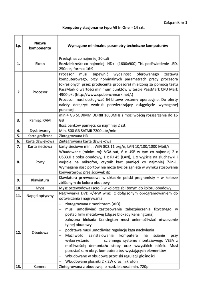 Komputery stacjonarne typu All In One - 14 szt. Lp. Nazwa komponentu 1. Ekran 2 Procesor 3. Pamięć RAM 4. 5. 6. 7. Dysk twardy Karta graficzna Karta dźwiękowa Karta sieciowa 8. Porty 9. Klawiatura 10. Mysz 11. Napęd optyczny 12. Obudowa 13. Kamera Załącznik nr 1 Wymagane minimalne parametry techniczne komputerów Przekątna: co najmniej 20 cali Rozdzielczość: co najmniej HD+ (1600x900) TN, podświetlenie LED, 250nits, format 16:9 Procesor musi zapewnić wydajność oferowanego zestawu komputerowego, przy nominalnych parametrach pracy procesora (określonych przez producenta procesora) mierzoną za pomocą testu PassMark o wartości minimum punktów w teście PassMark CPU Mark 4900 pkt (http://www.cpubenchmark.net/.) Procesor musi obsługiwać 64-bitowe systemy operacyjne. Do oferty należy dołączyć wydruk potwierdzający osiągnięcie wymaganej punktacji. min.4 GB SODIMM DDRIII 1600MHz z możliwością rozszerzenia do 16 GB Ilość banków pamięci: co najmniej 2 szt. Min. 500 GB SATAIII 7200 obr/min Zintegrowana HD Zintegrowana karta dźwiękowa karty sieciowe min. : WiFi 802.11 b/g/n, LAN 10/100/1000 Mbit/s Wbudowane (minimum): VGA-out, 6 x USB w tym co najmniej 2 x USB3.0 z boku obudowy, 1 x RJ 45 (LAN), 1 x wyjście na słuchawki i wejście na mikrofon, czytnik kart pamięci co najmniej 7-in-1. Wymagana ilość portów nie może być osiągnięta w wyniku stosowania konwerterów, przejściówek itp. Klawiatura przewodowa w układzie polski programisty – w kolorze zbliżonym do koloru obudowy. Mysz przewodowa (scroll) w kolorze zbliżonym do koloru obudowy Nagrywarka DVD +/-RW wraz z dołączonym oprogramowaniem do odtwarzania i nagrywania zintegrowana z monitorem (AIO) musi umożliwiać zastosowanie zabezpieczenia fizycznego w postaci linki metalowej (złącze blokady Kensingtona) założona blokada Kensington musi uniemożliwiać otworzenie tylnej obudowy podstawa musi umożliwiać regulację kąta nachylenia Możliwość zainstalowania komputera na ścianie przy wykorzystaniu ściennego systemu montażowego VESA z możliwością demontażu stopy oraz wszystkich nóżek. Musi pozostać sam obrys komputera bez wystających elementów Wbudowane w obudowę przyciski regulacji głośności Wbudowane głośniki 2 x 2W oraz mikrofon Zintegrowana z obudową, o rozdzielczości min. 720p 14. 15. Waga Zasilacz Masa nie większa niż 7 kg Maksymalna moc zasilacza nie większa niż 150 W 85% sprawności Microsoft Windows 7 Professional (64-bit) lub równoważny z możliwością bezpłatnej aktualizacji do Microsoft Windows 8.1 Pro. Przez równoważność rozumie się min: wbudowany mechanizm ochrony przed programami szpiegującymi i innym niepożądanym oprogramowaniem wbudowaną zaporę firewall 16. System operacyjny możliwość obsługi wielu monitorów wbudowany system obsługi faksów system automatycznej aktualizacji systemu i zabezpieczeń obsługę architektury 64-bitowej wbudowany system przywracania systemu w przypadku awarii wbudowany system tworzenia i przywracania kopii zapasowej systemu - Możliwość odczytania z BIOS: o Modelu komputera, numeru seryjnego, o Daty wydania oraz wersji BIOS, o Modelu procesora wraz z informacjami o ilości rdzeni, o Informacji o ilości pamięci RAM i taktowaniu, 17. o Informacji o dysku twardym (model), Bios o Informacji o napędzie optycznym (model), - Możliwość blokowania portów USB z poziomu BIOS - Możliwość ustawienia portów USB, sieci, napędu DVD w tryb „noboot” - Możliwość wyłączenia portów SATA1 i SATA2 18. Dodatkowe - Możliwość zdefiniowania tygodniowej lub dziennej zmiany planu oprogramowanie zasilania komputera w celu oszczędzania energii - Oprogramowanie producenta aktualizujące sterowniki oraz inne dodatkowe oprogramowanie producenta z możliwością automatycznego wyzwalania oraz historią instalowanych aktualizacji - Możliwość cyklicznego skanowania sprzętu w celu wykrycia potencjalnych usterek - Zintegrowany pakiet biurowy zawierający co najmniej oprogramowanie do edycji tekstów, arkusz kalkulacyjny, klient poczty elektronicznej, oprogramowanie do tworzenia prezentacji multimedialnych oraz program do tworzenia notatek graficznych. całkowicie zlokalizowany w języku polskim system komunikatów i podręcznej pomocy technicznej w pakiecie, możliwość prowadzenia dyskusji i subskrypcji dokumentów w sieci z automatycznym powiadomieniem o zmianach w dokumentach, w systemach pocztowych - możliwość delegacji uprawnień do otwierania, drukowania, modyfikowania i czytania załączanych dokumentów i informacji, możliwość blokowania niebezpiecznej lub niechcianej poczty, współpraca z systemem MS Exchange, w tym odbiór poczty, możliwość udostępniania kalendarza dla innych użytkowników wsparcie dla formatu XML w podstawowych aplikacjach, możliwość nadawania uprawnień do modyfikacji i formatowania dokumentów lub ich fragmentów, automatyczne przesyłanie poczty na podstawie reguł, automatyczne odpowiedzi, automatyczne wypisywanie hyperlinków, możliwość dodawania do dokumentów i arkuszy kalkulacyjnych podpisów cyfrowych, pozwalających na stwierdzenie czy dany dokument/arkusz pochodzi z bezpiecznego źródła i nie został w żaden sposób zmieniony, możliwość automatycznego odzyskiwania dokumentów i arkuszy kalkulacyjnych w wypadku odcięcia dopływu prądu. prawidłowe odczytywanie i zapisywanie danych w dokumentach w formatach: .DOC, .DOCX, XLS, .XLSX, w tym obsługa formatowania, makr, formuł, formularzy w plikach wytworzonych w MS Office 2010 pełna obsługa wszystkie ich istniejące dokumenty bez utraty jakichkolwiek ich parametrów i cech użytkowych (korespondencja seryjna, arkusze kalkulacyjne zawierające makra i formularze, itp.) 19. Zgodność z systemami operacyjnymi i standardami 20. Wsparcie techniczne producenta 21. Gwarancja - Oferowane modele komputerów muszą posiadać certyfikat Microsoft, potwierdzający poprawną współpracę oferowanych modeli k