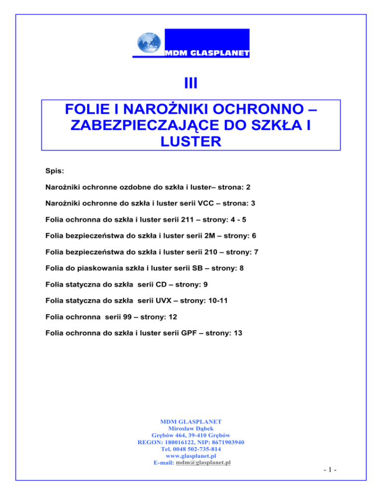 MDM GLASPLANET III FOLIE I NAROŻNIKI OCHRONNO – ZABEZPIECZAJĄCE DO SZKŁA I LUSTER Spis: Narożniki ochronne ozdobne do szkła i luster– strona: 2 Narożniki ochronne do szkła i luster serii VCC – strona: 3 Folia ochronna do szkła i luster serii 211 – strony: 4 - 5 Folia bezpieczeństwa do szkła i luster serii 2M – strony: 6 Folia bezpieczeństwa do szkła i luster serii 210 – strony: 7 Folia do piaskowania szkła i luster serii SB – strony: 8 Folia statyczna do szkła serii CD – strony: 9 Folia statyczna do szkła serii UVX – strony: 10-11 Folia ochronna serii 99 – strony: 12 Folia ochronna do szkła i luster serii GPF – strony: 13 MDM GLASPLANET Mirosław Dąbek Grębów 464, 39-410 Grębów REGON: 180016122, NIP: 8671903940 Tel. 0048 502-735-814 www.glasplanet.pl E-mail: [email protected] -1- MDM GLASPLANET Narożniki ochronne ozdobne . Corner Protectors Glass. Numer artykułu Opis Ilosc sztuk C6050 Muchselmuster 6-19mm Blumenmuster 6-19mm Soutwestmuster 6-19mm Contempomuster -19mm 4 4 4 4 C6060 C6070 C6080 Cena Netto w EUR 4,70 4,70 4,70 4,70 Minimalna ilość zamówienia: - 1 Karton. MDM GLASPLANET Mirosław Dąbek Grębów 464, 39-410 Grębów REGON: 180016122, NIP: 8671903940 Tel. 0048 502-735-814 www.glasplanet.pl E-mail: [email protected] -2- MDM GLASPLANET Narożniki ochronne - CRL Vinyl Eckenschutz . These CRL Vinyl Corner Covers are designed to protect mirror and glass edges during shipping, handling or storing. These Edge Protector Covers, made of soft vinyl, will not scratch or damage mirror or glass surfaces. They help protect large cutoffs from breakage or becoming scrap. Vinyl Corners are re-usable, and simply slide on and off. Color-coded for easy recognition and selection. A great way to ensure your customers are getting a quality piece of glass when you protect the corners with these CRL Vinyl Corner Covers. Numer Artykułu Opis VCC14 CRL 1/4" Vinyl Corner Covers VCC18 CRL 1/8" Vinyl Corner Covers VCC34 CRL 3/4" Vinyl Corner Covers Wymiary: Grubość szkła Opening Dimension: 1/4 in (6 mm) Opening Dimension: 1/8 in (3 mm) Opening Dimension: 3/4 in (19 mm) Ilość sztuk Cena w EUR Carton 17,00 100 Carton 18,00 100 Carton 100 20,90 Minimalna ilość zamówienia: - 1 Karton . MDM GLASPLANET Mirosław Dąbek Grębów 464, 39-410 Grębów REGON: 180016122, NIP: 8671903940 Tel. 0048 502-735-814 www.glasplanet.pl E-mail: [email protected] -3- MDM GLASPLANET Folia ochronna. Oberflächen-Schutzfilm . Folia ochronna – szczególnie przydatna do zabezpieczania różnego rodzaju szkła na czas transportu –dostępna w różnych szerokościach. Clear Protection Film. Klarer Schutzfilm. Schutzfilm für Glas während dem Transport. CRL Vitrobor Oberflächenschutzfilm Polyester-Sicherheitsfilm für die Laminierung, 500 mm x 50 m, mit gelbem Papierstreifen.CRL Vitrobor Surface Protection Film. Numer Artykułu Opis 21112B CRL Vitrobor Oberflächenschutzfilm 600 mm x 850 m CRL Vitrobor Oberflächenschutzfilm 1200 mm x 1050 m CRL Vitrobor Oberflächenschutzfilm 1000 mm x 1050 m CRL Vitrobor Surface Protection Film 1800 mm x 920 mtr CRL 'Vitrobor' Schutzfilm für Oberflächen 1500mm x 850 m Blau 40mc CRL 'Vitrobor' Schutzfilm für Oberflächen 1200mm x 850 m Grün 40mc CRL 'Vitrobor' Schutzfilm für Oberflächen 1200mm x 850 m Blau 40mc CRL Clear Protection Film 1800 mm x 600 mtr 21118B 21117B 21120G 21115B 21114G 21114B 21110B Wymiary Długość rolki Width : Feet per (600 mm) Roll: (850 m) Width : Feet per (1200 Roll: mm) (1050 m) Width : Feet per (1000 Roll: mm) (1050 m) Width : Feet per (1800 Roll: mm) (920 m) Width : Feet per (1500 Roll: mm) (850 m) Width : Feet per (1200 Roll: (850 mm) m) Width : Feet per (1200 Roll: mm) (850 m) Width : Feet per (1800 Roll: Cena netto EUR 132,00 224,90 185,30 369,00 299,00 261,00 261,00 271,20 MDM GLASPLANET Mirosław Dąbek Grębów 464, 39-410 Grębów REGON: 180016122, NIP: 8671903940 Tel. 0048 502-735-814 www.glasplanet.pl E-mail: [email protected] -4- MDM GLASPLANET 210755 211075 21073 CRL Polyester-Sicherheitsfilm für die Laminierung, 600 mm x 50 m CRL Polinierende Schutzfolie 500 mm x 50 m Polyester-Sicherheitsfilm für die Laminierung, 500 mm x 50 m mm) (600 m) Width : Feet per (600 mm) Roll: (50 m) Width : Feet per (500 mm) Roll: (50 m) Width : Feet per (500 mm) Roll: (50 m) 113,00 97,00 89,00 Minimalna ilość zamówienia: - 1 rolka. MDM GLASPLANET Mirosław Dąbek Grębów 464, 39-410 Grębów REGON: 180016122, NIP: 8671903940 Tel. 0048 502-735-814 www.glasplanet.pl E-mail: [email protected] -5- MDM GLASPLANET Folia bezpieczeństwa – zabezpieczająca przed odłamkami szkła. CRL Bruchsicheres Sicherheitsklebeband für Spiegel. Wytrzymała folia bezpieczeństwa - samoprzylepna, mająca za zadanie wzmacniać np. lustro czy szybę a następnie chronić przed odłamkami szkła w przypadku ich zbicia . Szczególnie polecana do naklejania no spodnią stronę luster montowanych np. jako drzwi garderoby. Dieses druckempfindliche mit Klebstoff beschichtete Band ist vor allem für verspiegelte Garderobentüren zu empfehlen, die eine CRL Sicherheitsrückseite für Spiegel der Kategorie II benötigen. Ein in den Film eingebetteter Gitterstoff für hohe Zugkraft und Schlagfestigkeit verhindert zudem den Einschluss von Feuchtigkeit und Ablösen des Gewebes. Der Klebstoff mit hoher Leistung ist leicht abzurollen, bietet aber dennoch eine hohe Haftkraft auf einer breiten Vielzahl von Spiegelrückseiten. Beim Test auf Schlagfestigkeit nach 16 CFR1201 traten keine Fehler auf. Numer Artykułu Opis Wymiary 2MT24 CRL Bruchsicheres Sicherheitsklebeband für Spiegel, Kategorie II, 610 mm (24") CRL Bruchsichere Sicherheitsklebebänder für Spiegel, Kategorie II, 914 mm (36") Width : 24" (610 mm) CRL Bruchsicheres Sicherheitsklebeband für Spiegel, Kategorie II, 1.219 mm (48") CRL Bruchsicheres Sicherheitsklebeband für Spiegel, Kategorie II, 1.524 mm (60") Width : 48" (1219 mm) 2MT36 2MT48 2MT60 Width : 36" (914 mm) Width : 60" (1