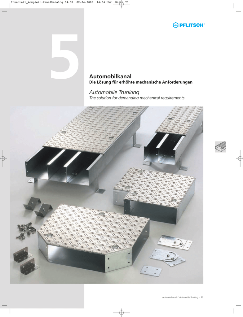 Innenteil_komplett:Kanalkatalog 04.08 02.04.2008 5 14:04 Uhr Seite 73 Automobilkanal Die Lösung für erhöhte mechanische Anforderungen Automobile Trunking The solution for demanding mechanical requirements Automobilkanal / Automobile Trunking · 73 Innenteil_komplett:Kanalkatalog 04.08 31.03.2008 15:51 Uhr Seite 74 Begehbar mit Trittlast bis 1200 N Passable up to 1200 N load resistance 3 1 4 2 5 74 · Automobilkanal / Automobile Trunking Innenteil_komplett:Kanalkatalog 04.08 31.03.2008 Der PFLITSCH Automobilkanal ist die Schwerlast-Variante des bewährten Industriekanals für die hohen Anforderungen der Automobilhersteller und entspricht den Werksnormen zahlreicher europäischer Automobilhersteller. 15:51 Uhr Seite 75 The PFLITSCH Automobile Trunking is the heavy-duty variant of the time-proven Industrial Trunking designed for the high requirements of automotive manufacturers and complying with the in-house standards of numerous European automotive manufacturers. Der Automobilkanal wird vorwiegend als begehbarer Bodenkanal eingesetzt. Er kann Trittlasten (Abb. 1) bis 1200 N sicher aufnehmen. Auch in allen anderen Bereichen, wo erhöhte statische Belastungen oder besonders große Stützabstände gefordert werden, kommt er zum Einsatz. Für die Bodeninstallation stehen Riffelblechabdeckungen (Abb. 2) zur Verfügung, die für mehr Rutschfestigkeit sorgen und Unfallgefahren vorbeugen. Er unterscheidet sich durch die höhere Blechstärke von 2 mm bzw. 2,5 mm und ist in der Standardausführung 100 mm hoch, so dass er bei Bodenmontage inklusive 90 mm Stützfüßen (Abb. 3) und Riffelblechabdeckung ein Stufenmaß von 200 mm nicht überschreitet. This Automobile Trunking is predominantly used as a walkable floor duct. It will take load resistances (Fig. 1) of up to 1,200 N with no difficulties. It is also put to good use in all other areas, where elevated static loads or particularly great support distances are called for. Channelled sheet covering is available for floor installation, making for increased skid resistance (Fig. 2) and preventing risk of accidents. It is different in its greater sheet thickness of 2 mm and 2.5 mm and as standard comes 100 mm high, so that with floor installation including 90 mm supports (Fig. 3) and channelled sheet covering a step dimension of 200 mm is not exceeded. Vielfalt und Flexibilität Der Automobilkanal ist in sieben praxisgerechten Querschnitten von 100 bis 600 mm Breite und 100 mm Höhe und in drei Ausführungen erhältlich: - Stahl verzinkt blank - Stahl verzinkt grundiert - Stahl pulverbeschichtet in einer RAL-Farbe nach Wahl Versatility and flexibility The PFLITSCH Automobile Trunking is available in six practical cross sections of 100 to 600 mm wide and 100 mm high and in three executions: - Steel galvanised - Stahl galvanised primed - Steel powder-coated in a RAL colour as selected Kanäle mit Trennstegen (Abb. 4) ermöglichen die vorschriften- und EMV-gerechte Trennung von Leistungs-, Steuer- und Datenleitungen mit bis zu drei Kammern. Kanäle mit Trennstegen eignen sich auch für die Verlegung elektrischer Leitungen mit Fluid- oder Druckluftleitungen. Trunkings with separating web (Fig. 4) enable power, control and data lines to be separated – falling in line with rules and regulations as well as being EMC-correct – with up to three chambers. The ducts with separating web are also suitable for jointly laying electric cables with fluid or compressed-air lines. Mit den variablen Winkeln läßt sich die Kanalführung vertikal zwischen 70° und 90° lückenlos einstellen. Auch möglich: Die Integration des PFLITSCH PIK-Kanal für die EMV-gerechte separate Verlegung von Daten und Steuerleitungen in einem rundum geschlossenen System. Ein breites Sortiment an perfekt abgestimmten Bearbeitungswerkzeugen von der Lochzange über die Muldenstanze bis zur Ausklinkstanze MaxiCut erleichtert die individuelle Anpassung auf der Baustelle. (Abb. 6) Die Werkzeuge arbeiten geräuscharm, so dass direkt am Montageplatz gearbeitet werden kann. Variable angles adjust the cable routing between 70° and 90° vertical. What will also work: Integration of the PFLITSCH PIK Trunking for EMC-correct separate laying of data and control lines in one totally closed system. A wide range of perfectly matched working tools from punch pliers and the recess punch right up to the notching punch MaxiCut simplifies individual adjustment at the site. (Fig. 6) Since these tools work quietly, any adjustments can be made directly on the spot, thus saving time as well. 6 Automobilkanal / Automobile Trunking · 75 Innenteil_komplett:Kanalkatalog 04.08 31.03.2008 15:51 Uhr Seite 76 Zeitersparnis und Kostenminimierung Time saving and coast minimization 2 3 1 76 · Automobilkanal / Automobile Trunking 4 Innenteil_komplett:Kanalkatalog 04.08 31.03.2008 Installation, Wartung und Erweiterung sind schnell durchführbar, da der Automobilkanal auf der gesamten Länge geöffnet werden kann. (Abb.1) So lassen sich auch mit Steckern, Aktoren oder Sensoren konfektionierte Leitungen einfach und schnell einlegen oder herausnehmen. Planung und Konfektionierung PFLITSCH steht Ihnen bereits in der Planungsphase beratend zur Seite und übernimmt auf Wunsch die Planung und Konfektionierung. (Abb. 2) Auf der Basis langjähriger Erfahrung entwickelt PFLITSCH auch komplexe Problemlösungen jenseits der Standards. Für eine leichtere und schnellere Montage vor Ort liefert PFLITSCH die maßgenau gefertigten Teile exakt vorbereitet und eindeutig gekennzeichnet für alle räumlichen Streckenführungen. Auf Wunsch werden sie einbaufertig in Baugruppen konfektioniert, einschließlich der Montage vor Ort und der zugehörigen Dokumentation. Das bedeutet für den Auftraggeber Kostentransparenz. Details die überzeugen Viele praxisgerechte Detaillösungen machen den Unterschied. Der PFLITSCH Automobilkanal überzeugt als professionelle Systemlösung mit - Robuster, gratarmer Konstruktion (Abb.3+4) - Maßgefertigten Bau