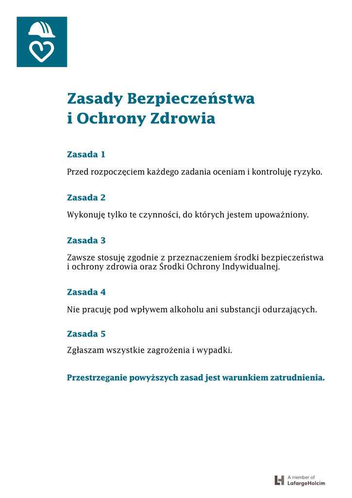 Zasady Bezpieczeństwa i Ochrony Zdrowia Zasada 1 Przed rozpoczęciem każdego zadania oceniam i kontroluję ryzyko. Zasada 2 Wykonuję tylko te czynności, do których jestem upoważniony. Zasada 3 Zawsze stosuję zgodnie z przeznaczeniem środki bezpieczeństwa i ochrony zdrowia oraz Środki Ochrony Indywidualnej. Zasada 4 Nie pracuję pod wpływem alkoholu ani substancji odurzających. Zasada 5 Zgłaszam wszystkie zagrożenia i wypadki. Przestrzeganie powyższych zasad jest warunkiem zatrudnienia.