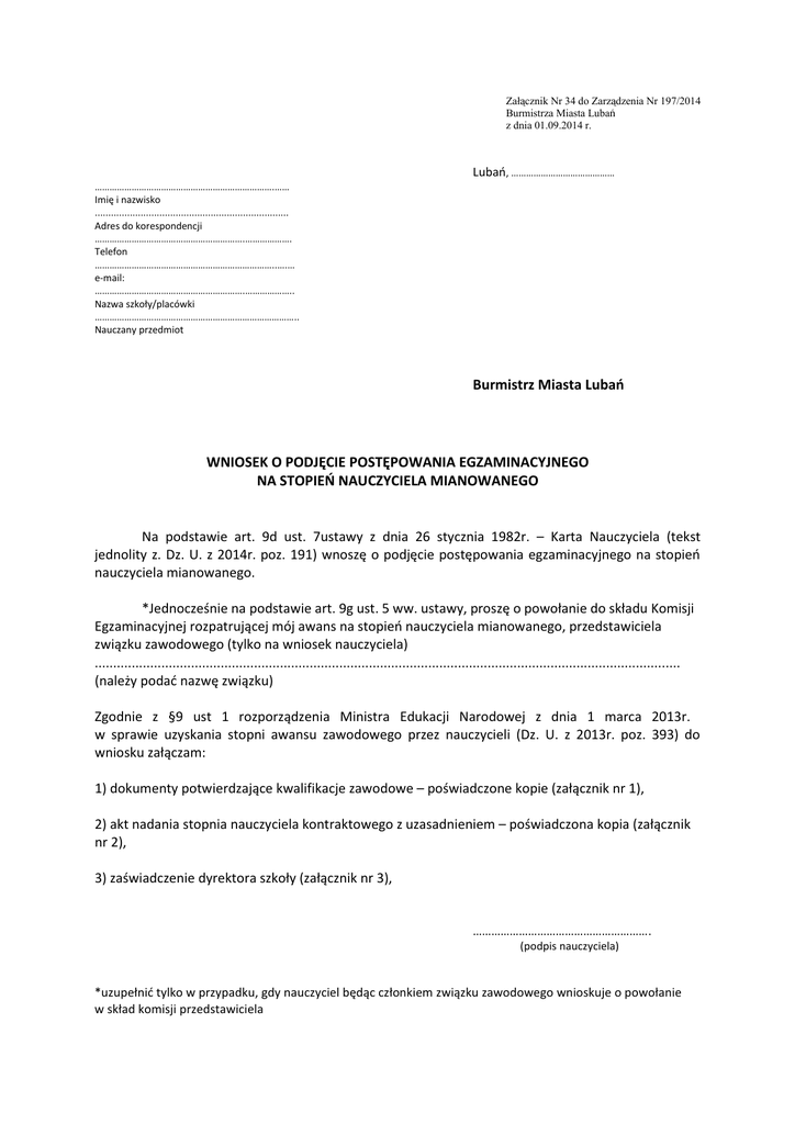 Załącznik Nr 34 do Zarządzenia Nr 197/2014 Burmistrza Miasta Lubań z dnia 01.09.2014 r. Lubań, …………………………………… ……………………………………………………………….…… Imię i nazwisko ........................................................................ Adres do korespondencji …………………………………………………….………………. Telefon ………………………………………………………………..….… e-mail: …………………………………………………….……………….. Nazwa szkoły/placówki ……………………………………………………………………….. Nauczany przedmiot Burmistrz Miasta Lubań WNIOSEK O PODJĘCIE POSTĘPOWANIA EGZAMINACYJNEGO NA STOPIEŃ NAUCZYCIELA MIANOWANEGO Na podstawie art. 9d ust. 7ustawy z dnia 26 stycznia 1982r. – Karta Nauczyciela (tekst jednolity z. Dz. U. z 2014r. poz. 191) wnoszę o podjęcie postępowania egzaminacyjnego na stopień nauczyciela mianowanego. *Jednocześnie na podstawie art. 9g ust. 5 ww. ustawy, proszę o powołanie do składu Komisji Egzaminacyjnej rozpatrującej mój awans na stopień nauczyciela mianowanego, przedstawiciela związku zawodowego (tylko na wniosek nauczyciela) .............................................................................................................................................................. (należy podać nazwę związku) Zgodnie z §9 ust 1 rozporządzenia Ministra Edukacji Narodowej z dnia 1 marca 2013r. w sprawie uzyskania stopni awansu zawodowego przez nauczycieli (Dz. U. z 2013r. poz. 393) do wniosku załączam: 1) dokumenty potwierdzające kwalifikacje zawodowe – poświadczone kopie (załącznik nr 1), 2) akt nadania stopnia nauczyciela kontraktowego z uzasadnieniem – poświadczona kopia (załącznik nr 2), 3) zaświadczenie dyrektora szkoły (załącznik nr 3), …………………………………………………. (podpis nauczyciela) *uzupełnić tylko w przypadku, gdy nauczyciel będąc członkiem związku zawodowego wnioskuje o powołanie w skład komisji przedstawiciela OŚWIADCZENIE Ja niżej podpisany/a wyrażam zgodę na przetwarzanie moich danych osobowych zawartych w przedstawionych przeze mnie dokumentach dla potrzeb niezbędnych do realizacji postępowania egzaminacyjnego na stopień nauczyciela mianowanego zgodnie z ustawą z dnia 29 sierpnia 1997r. o ochronie danych osobowych (Dz. U. z 2002r. nr 101 poz. 926 ze zm.) i oświadczam, iż zostałem poinformowany/a, że administratorem danych jest Urząd Miasta Lubań oraz że podanie danych osobowych jest dobrowolne, jednak ich niepodanie skutkuje odmową dokonania czynności prawnej. …………………………..………… data czytelny podpis UWAGI! Wniosek o podjęcie postępowania egzaminacyjnego należy złożyć w roku kalendarzowym, w którym uzyskano pozytywną ocenę dorobku zawodowego za okres stażu. W przypadku realizacji stażu w kilku szkołach/placówkach należy załączyć zaświadczenia ze wszystkich szkół/placówek. Formularz zaświadczenia jest załącznikiem do wniosku o podjęcie postępowania egzaminacyjnego na stopień nauczyciela mianowanego. Prawidłowo potwierdzony dokument zawiera: - pieczęć placówki potwierdzającej dokument, - pieczęć „za zgodność z oryginałem”, - pieczątkę imienna osoby potwierdzającej, - podpis osoby potwierdzającej, - datę. Przewidywany czas trwania egzaminu – około 45 min. I część egzaminu – prezentacja – około 20 minut. W czasie prezentacji można posłużyć się materiałami, potwierdzającymi spełnienie wymagań egzaminacyjnych oraz realizację omawianych osiągnięć. II część egzaminu – odpowiedzi na pytania członków komisji, dotyczące wymagań określonych w § 7 ust. 2 rozporządzenia MEN z dnia 1 marca 2013r. w sprawie uzyskiwania stopni awansu zawodowego przez nauczycieli (Dz. U. z 2013r. poz. 393). Wnioski należy składać w Urzędzie Miasta Lubań, ul. 7 Dywizji 14, Biuro Obsługi Interesanta. Lubań, …………......... ………………………….. (pieczęć szkoły) ZAŚWIADCZENIE Niniejszym zaświadczam, że Pan/Pani ………………………………………………………………………………………………… urodzony/a ……………………………………………………… w……………………………………………………………………………….………… w dniu wydania zaświadczenia jest zatrudniony(a) w ……………………………………………………………………………………… na stanowisku nauczyciela ……………………………………………..………… w wymiarze ………………………….………… na czas określony/nieokreślony. W okresie stażu trwającego od dnia ………………………………………….……. do dnia …………..……………………………..……. zatrudniony(a) był/a w …………………………………………………………………………………………………………………………..……….. na stanowisku nauczyciela .……………………………………………………………………………………………………………………..………. w wymiarze ……………………………………………………. Staż został przedłużony o ………….. dni z powodu …………………………………………………………………………………………….. ……………………………………………………………………………………………………………………………………………………………………….…… ………………………………………………………………………………………………………………………………………………………………………. ………………