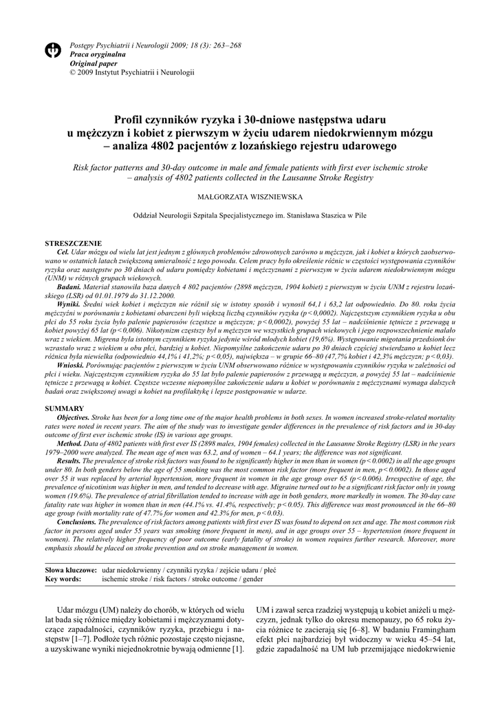 Postêpy Psychiatrii i Neurologii 2009; 18 (3): 263268 Praca oryginalna Original paper © 2009 Instytut Psychiatrii i Neurologii Profil czynników ryzyka i 30-dniowe nastêpstwa udaru u mê¿czyzn i kobiet z pierwszym w ¿yciu udarem niedokrwiennym mózgu analiza 4802 pacjentów z lozañskiego rejestru udarowego Risk factor patterns and 30-day outcome in male and female patients with first ever ischemic stroke analysis of 4802 patients collected in the Lausanne Stroke Registry MA£GORZATA WISZNIEWSKA Oddzia³ Neurologii Szpitala Specjalistycznego im. Stanis³awa Staszica w Pile STRESZCZENIE Cel. Udar mózgu od wielu lat jest jednym z g³ównych problemów zdrowotnych zarówno u mê¿czyzn, jak i kobiet u których zaobserwowano w ostatnich latach zwiêkszon¹ umieralnoæ z tego powodu. Celem pracy by³o okrelenie ró¿nic w czêstoci wystêpowania czynników ryzyka oraz nastêpstw po 30 dniach od udaru pomiêdzy kobietami i mê¿czyznami z pierwszym w ¿yciu udarem niedokrwiennym mózgu (UNM) w ró¿nych grupach wiekowych. Badani. Materia³ stanowi³a baza danych 4 802 pacjentów (2898 mê¿czyzn, 1904 kobiet) z pierwszym w ¿yciu UNM z rejestru lozañskiego (LSR) od 01.01.1979 do 31.12.2000. Wyniki. redni wiek kobiet i mê¿czyzn nie ró¿ni³ siê w istotny sposób i wynosi³ 64,1 i 63,2 lat odpowiednio. Do 80. roku ¿ycia mê¿czyni w porównaniu z kobietami obarczeni byli wiêksz¹ liczb¹ czynników ryzyka (p < 0,0002). Najczêstszym czynnikiem ryzyka u obu p³ci do 55 roku ¿ycia by³o palenie papierosów (czêstsze u mê¿czyzn; p < 0,0002), powy¿ej 55 lat nadcinienie têtnicze z przewag¹ u kobiet powy¿ej 65 lat (p < 0,006). Nikotynizm czêstszy by³ u mê¿czyzn we wszystkich grupach wiekowych i jego rozpowszechnienie mala³o wraz z wiekiem. Migrena by³a istotnym czynnikiem ryzyka jedynie wród m³odych kobiet (19,6%). Wystêpowanie migotania przedsionk ów wzrasta³o wraz z wiekiem u obu p³ci, bardziej u kobiet. Niepomylne zakoñczenie udaru po 30 dniach czêciej stwierdzano u kobiet lecz ró¿nica by³a niewielka (odpowiednio 44,1% i 41,2%; p < 0,05), najwiêksza w grupie 6680 (47,7% kobiet i 42,3% mê¿czyzn; p < 0,03). Wnioski. Porównuj¹c pacjentów z pierwszym w ¿yciu UNM obserwowano ró¿nice w wystêpowaniu czynników ryzyka w zale¿noci od p³ci i wieku. Najczêstszym czynnikiem ryzyka do 55 lat by³o palenie papierosów z przewag¹ u mê¿czyzn, a powy¿ej 55 lat nadcinienie têtnicze z przewag¹ u kobiet. Czêstsze wczesne niepomylne zakoñczenie udaru u kobiet w porównaniu z mê¿czyznami wymaga dalszych badañ oraz zwiêkszonej uwagi u kobiet na profilaktykê i lepsze postêpowanie w udarze. SUMMARY Objectives. Stroke has been for a long time one of the major health problems in both sexes. In women increased stroke-related mortality rates were noted in recent years. The aim of the study was to investigate gender differences in the prevalence of risk factors and in 30-day outcome of first ever ischemic stroke (IS) in various age groups. Method. Data of 4802 patients with first ever IS (2898 males, 1904 females) collected in the Lausanne Stroke Registry (LSR) in the years 19792000 were analyzed. The mean age of men was 63.2, and of women 64.1 years; the difference was not significant. Results. The prevalence of stroke risk factors was found to be significantly higher in men than in women (p< 0.0002) in all the age groups under 80. In both genders below the age of 55 smoking was the most common risk factor (more frequent in men, p< 0.0002). In those aged over 55 it was replaced by arterial hypertension, more frequent in women in the age group over 65 (p< 0.006). Irrespective of age, the prevalence of nicotinism was higher in men, and tended to decrease with age. Migraine turned out to be a significant risk factor only in young women (19.6%). The prevalence of atrial fibrillation tended to increase with age in both genders, more markedly in women. The 30-day case fatality rate was higher in women than in men (44.1% vs. 41.4%, respectively; p< 0.05). This difference was most pronounced in the 6680 age group (with mortality rate of 47.7% for women and 42.3% for men, p< 0.03). Conclusions. The prevalence of risk factors among patients with first ever IS was found to depend on sex and age. The most common risk factor in persons aged under 55 years was smoking (more frequent in men), and in age groups over 55 hypertension (more frequent in women). The relatively higher frequency of poor outcome (early fatality of stroke) in women requires further research. Moreover, more emphasis should be placed on stroke prevention and on stroke management in women. S³owa kluczowe: udar niedokrwienny / czynniki ryzyka / zejcie udaru / p³eæ Key words: ischemic stroke / risk factors / stroke outcome / gender Udar mózgu (UM) nale¿y do chorób, w których od wielu lat bada siê ró¿nice miêdzy kobietami i mê¿czyznami dotycz¹ce zapadalnoci, czynników ryzyka, przebiegu i nastêpstw [17]. Pod³o¿e tych ró¿nic pozostaje czêsto niejasne, a uzyskiwane wyniki niejednokrotnie bywaj¹ odmienne [1]. UM i zawa³ serca rzadziej wystêpuj¹ u kobiet ani¿eli u mê¿czyzn, jednak tylko do okresu menopauzy, po 65 roku ¿ycia ró¿nice te zacieraj¹ siê [68]. W badaniu Framingham efekt p³ci najbardziej by³ widoczny w wieku 4554 lat, gdzie zapadalnoæ na UM lub przemijaj¹ce niedokrwienie 264 mózgu (TIA) wynosi³a 2,1/1000 mê¿czyzn i 1,2/1000 kobiet [9]. Badanie kohortowe z 19992004 roku wykaza³o, ¿e kobiety w wieku 4554 lat dwukrotnie czêciej doznawa³y udaru w porównaniu z mê¿czyznami [10 ] i ponadto od 1979 do 1999 zanotowano spadek umieralnoci z przyczyn sercowo-naczyniowych u mê¿czyzn, a wzrost u kobiet [11]. Tendencja ta utrzymuje siê nadal, co potwierdzaj¹ informacje z roku 2009 [12]. Wa¿n¹ rolê w kszta³towaniu przebiegu i nastêpstw UM odgrywaj¹ czynniki ryzyka [9, 1315, 16]. Za nasilniejszy czynnik ryzyka udaru uwa¿ane jest nadcinienie têtnicze, które wyst