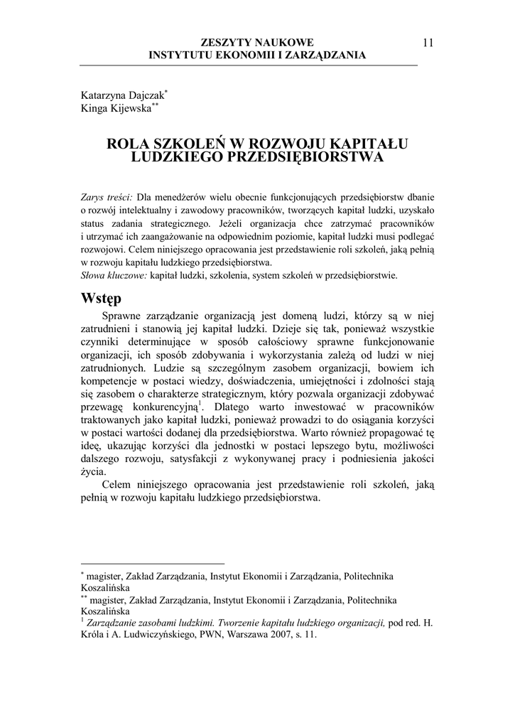 ZESZYTY NAUKOWE INSTYTUTU EKONOMII I ZARZĄDZANIA 11 Katarzyna Dajczak Kinga Kijewska ROLA SZKOLEŃ W ROZWOJU KAPITAŁU LUDZKIEGO PRZEDSIĘBIORSTWA Zarys treści: Dla menedżerów wielu obecnie funkcjonujących przedsiębiorstw dbanie o rozwój intelektualny i zawodowy pracowników, tworzących kapitał ludzki, uzyskało status zadania strategicznego. Jeżeli organizacja chce zatrzymać pracowników i utrzymać ich zaangażowanie na odpowiednim poziomie, kapitał ludzki musi podlegać rozwojowi. Celem niniejszego opracowania jest przedstawienie roli szkoleń, jaką pełnią w rozwoju kapitału ludzkiego przedsiębiorstwa. Słowa kluczowe: kapitał ludzki, szkolenia, system szkoleń w przedsiębiorstwie. Wstęp Sprawne zarządzanie organizacją jest domeną ludzi, którzy są w niej zatrudnieni i stanowią jej kapitał ludzki. Dzieje się tak, ponieważ wszystkie czynniki determinujące w sposób całościowy sprawne funkcjonowanie organizacji, ich sposób zdobywania i wykorzystania zależą od ludzi w niej zatrudnionych. Ludzie są szczególnym zasobem organizacji, bowiem ich kompetencje w postaci wiedzy, doświadczenia, umiejętności i zdolności stają się zasobem o charakterze strategicznym, który pozwala organizacji zdobywać przewagę konkurencyjną1. Dlatego warto inwestować w pracowników traktowanych jako kapitał ludzki, ponieważ prowadzi to do osiągania korzyści w postaci wartości dodanej dla przedsiębiorstwa. Warto również propagować tę ideę, ukazując korzyści dla jednostki w postaci lepszego bytu, możliwości dalszego rozwoju, satysfakcji z wykonywanej pracy i podniesienia jakości życia. Celem niniejszego opracowania jest przedstawienie roli szkoleń, jaką pełnią w rozwoju kapitału ludzkiego przedsiębiorstwa. magister, Zakład Zarządzania, Instytut Ekonomii i Zarządzania, Politechnika Koszalińska magister, Zakład Zarządzania, Instytut Ekonomii i Zarządzania, Politechnika Koszalińska 1 Zarządzanie zasobami ludzkimi. Tworzenie kapitału ludzkiego organizacji, pod red. H. Króla i A. Ludwiczyńskiego, PWN, Warszawa 2007, s. 11. Katarzyna Dajczak, Kinga Kijewska Istota i rozwój kapitału ludzkiego Analizując rolę czynnika ludzkiego w przedsiębiorstwach stosujących nowoczesne metody zarządzania, najłatwiej można zaobserwować proces przechodzenia od zarządzania zasobami ludzkimi, tj. zarządzania jednym z zasobów będących w dyspozycji przedsiębiorstwa, do zarządzania kapitałem ludzkim, tj. zarządzania zasobem dla firmy najważniejszym, bo w największym stopniu biorącym udział w tworzeniu wartości dodanej2. Jednak należy pamiętać, że kapitał ludzki może być analizowany na wielu różnych poziomach odniesienia – makro, mezzo i mikro3, czyli z kapitałem ludzkim mamy do czynienia nie tylko w organizacji, ale również w szerszych grupach społecznych, wychodzących poza ramy konkretnej organizacji. W wielu publikacjach wskazuje się na ogromny wpływ wielkości i struktury kapitału ludzkiego na rozwój społeczeństw, narodów, a nawet ludzkości. W szczególności podkreśla się, że kapitał ludzki4: wywiera poważny wpływ na innowacyjność gospodarek i społeczeństw, ich zdolności absorpcyjne w zakresie przyswajania i wdrażania światowych osiągnięć naukowych, technicznych, organizacyjnych, mentalnościowych itp.; wywiera wpływ na przemiany instytucjonalne i unowocześnienie struktur różnego rodzaju; sprzyja propagowaniu i upowszechnianiu nowoczesnych wzorców konsumpcji i jakości życia; kształtuje nowoczesną infrastrukturę techniczno-organizacyjną, informatyczną, socjalną. Natomiast zagrożenia wywołane niedoinwestowaniem kapitału ludzkiego przyczyniają się do powstania luki cywilizacyjnej i edukacyjnej, procesów alienacji wytwórców i społeczno-politycznej, grożą stagnacją gospodarczą, przyspieszają szkodliwą dla gospodarki danego kraju emigrację kapitału kwalifikacyjnego (strata renty z tytułu wykształcenia, pomijając inne skutki – biologiczne, społeczne itp.)5. Ludzie inwestują w siebie, a poprzez akumulację różnego typu nakładów podlegających kapitalizacji, takich jak: formalna edukacja, wiedza i doświadczenie, zwiększa się wartość pracownika na rynku oraz jego ogólna produktywność6. Tę zależność powinni zrozumieć również pracodawcy 2 Kształtowanie kapitału ludzkiego firmy, pod red. B. Kożuch, Wyd. Uniwersytetu w Białymstoku, Białystok 2000, s. 61. 3 Kapitał ludzki a kształtowanie przedsiębiorczości, pod red. M. Juchnowicz, Poltext, Warszawa 2004, s. 26. 4 Zarządzanie zasobami ludzkimi…,op.cit., s. 111. 5 Instrumentarium zarządzania zasobami ludzkimi, pod red. K. Makowskiego, Wyd. Szkoły Głównej Handlowej, Warszawa 2002, s. 181. 6 Zarządzanie zasobami ludzkimi…,op.cit., s. 112. 12 Rola szkoleń… i inwestować w swoich pracowników, którzy przyczynią się z biegiem czasu do sukcesu przedsiębiorstwa. Rozwój kapitału ludzkiego polega na umożliwieniu pracownikom uczenia się i rozwoju, organizowaniu i planowaniu szkoleń oraz organizowaniu i ocenie programów szkoleniowych7. Celem tego rozwoju jest uzyskanie przez przedsiębiorstwo cech pracowniczych gwarantujących osiąganie celów organizacji – efektywności, skuteczności, wydajności. Poprzez rozwój pracowników zapewnia się funkcjonowanie przedsiębiorstwa, kreatywność i innowacyjność, które są motorem rozwoju organizacji, wzrostu udziału w rynku, utrzymania i poszerzenia kręgu klientów, a tym samym wzrostu zysków. Możliwe to jest jednak tylko dzięki dopilnowaniu przez organizację, aby pracownicy posiadali odpowiednią wiedzę i umiejętności niezbędne do właściwego wykonywania zadań, aby następowało ciągłe ich doskonalenie i maksymalne wykorzystanie potencjału w nich tkwiącego. Teoria szkoleń w przedsiębiorstwie Rozwój kapitału ludzkiego obejmuje następujące elementy8: naukę – ciągłą zmianę zachowania na skutek praktyki lub doświadc
