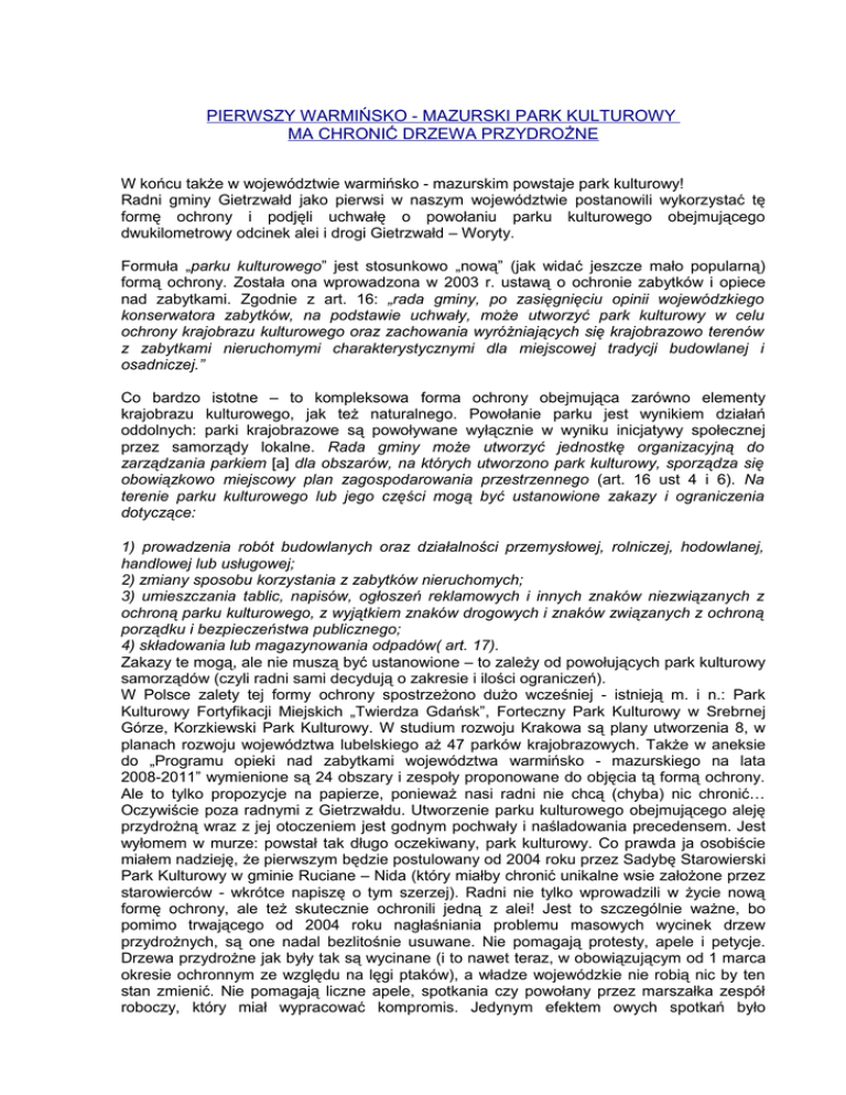 PIERWSZY WARMIŃSKO - MAZURSKI PARK KULTUROWY MA CHRONIĆ DRZEWA PRZYDROŻNE W końcu także w województwie warmińsko - mazurskim powstaje park kulturowy! Radni gminy Gietrzwałd jako pierwsi w naszym województwie postanowili wykorzystać tę formę ochrony i podjęli uchwałę o powołaniu parku kulturowego obejmującego dwukilometrowy odcinek alei i drogi Gietrzwałd – Woryty. Formuła „parku kulturowego” jest stosunkowo „nową” (jak widać jeszcze mało popularną) formą ochrony. Została ona wprowadzona w 2003 r. ustawą o ochronie zabytków i opiece nad zabytkami. Zgodnie z art. 16: „rada gminy, po zasięgnięciu opinii wojewódzkiego konserwatora zabytków, na podstawie uchwały, może utworzyć park kulturowy w celu ochrony krajobrazu kulturowego oraz zachowania wyróżniających się krajobrazowo terenów z zabytkami nieruchomymi charakterystycznymi dla miejscowej tradycji budowlanej i osadniczej.” Co bardzo istotne – to kompleksowa forma ochrony obejmująca zarówno elementy krajobrazu kulturowego, jak też naturalnego. Powołanie parku jest wynikiem działań oddolnych: parki krajobrazowe są powoływane wyłącznie w wyniku inicjatywy społecznej przez samorządy lokalne. Rada gminy może utworzyć jednostkę organizacyjną do zarządzania parkiem [a] dla obszarów, na których utworzono park kulturowy, sporządza się obowiązkowo miejscowy plan zagospodarowania przestrzennego (art. 16 ust 4 i 6). Na terenie parku kulturowego lub jego części mogą być ustanowione zakazy i ograniczenia dotyczące: 1) prowadzenia robót budowlanych oraz działalności przemysłowej, rolniczej, hodowlanej, handlowej lub usługowej; 2) zmiany sposobu korzystania z zabytków nieruchomych; 3) umieszczania tablic, napisów, ogłoszeń reklamowych i innych znaków niezwiązanych z ochroną parku kulturowego, z wyjątkiem znaków drogowych i znaków związanych z ochroną porządku i bezpieczeństwa publicznego; 4) składowania lub magazynowania odpadów( art. 17). Zakazy te mogą, ale nie muszą być ustanowione – to zależy od powołujących park kulturowy samorządów (czyli radni sami decydują o zakresie i ilości ograniczeń). W Polsce zalety tej formy ochrony spostrzeżono dużo wcześniej - istnieją m. i n.: Park Kulturowy Fortyfikacji Miejskich „Twierdza Gdańsk”, Forteczny Park Kulturowy w Srebrnej Górze, Korzkiewski Park Kulturowy. W studium rozwoju Krakowa są plany utworzenia 8, w planach rozwoju województwa lubelskiego aż 47 parków krajobrazowych. Także w aneksie do „Programu opieki nad zabytkami województwa warmińsko - mazurskiego na lata 2008-2011” wymienione są 24 obszary i zespoły proponowane do objęcia tą formą ochrony. Ale to tylko propozycje na papierze, ponieważ nasi radni nie chcą (chyba) nic chronić… Oczywiście poza radnymi z Gietrzwałdu. Utworzenie parku kulturowego obejmującego aleję przydrożną wraz z jej otoczeniem jest godnym pochwały i naśladowania precedensem. Jest wyłomem w murze: powstał tak długo oczekiwany, park kulturowy. Co prawda ja osobiście miałem nadzieję, że pierwszym będzie postulowany od 2004 roku przez Sadybę Starowierski Park Kulturowy w gminie Ruciane – Nida (który miałby chronić unikalne wsie założone przez starowierców - wkrótce napiszę o tym szerzej). Radni nie tylko wprowadzili w życie nową formę ochrony, ale też skutecznie ochronili jedną z alei! Jest to szczególnie ważne, bo pomimo trwającego od 2004 roku nagłaśniania problemu masowych wycinek drzew przydrożnych, są one nadal bezlitośnie usuwane. Nie pomagają protesty, apele i petycje. Drzewa przydrożne jak były tak są wycinane (i to nawet teraz, w obowiązującym od 1 marca okresie ochronnym ze względu na lęgi ptaków), a władze wojewódzkie nie robią nic by ten stan zmienić. Nie pomagają liczne apele, spotkania czy powołany przez marszałka zespół roboczy, który miał wypracować kompromis. Jedynym efektem owych spotkań było powstanie inwentaryzacji pt. „ Waloryzacja i ochrona alei przydrożnych na terenie województwa warmińsko - mazurskiego” sporządzonej w 2007 roku przez Regionalny Ośrodek Badań i Dokumentacji Zabytków w Olsztynie. To bardzo cenne opracowanie – sporządzone dużym nakładem pracy i kosztów – miało być narzędziem do dalszych działań…które niestety nie nastąpiły. W inwentaryzacji proponowano objęć najcenniejsze aleje ochroną poprzez wpis do rejestru zabytków, uznanie za pomnik przyrody lub stworzenie nowej kategorii ochrony „droga krajobrazowa”, lecz zapis ten nie stał się podstawą do objęcia ochroną choćby jednej alei! Aleja wzdłuż traktu pielgrzymkowego Reszel – Święta Lipka, jedyna w naszym województwie wpisana do rejestru zabytków (na wniosek Sadyby) czeka na rozpatrzenie odwołania Zarządu Dróg Wojewódzkich, który takiego zabytku nie chce (dla porównania: do rejestru zabytków wpisano w woj. łódzkim 16, w dolnośląskim 11 alei). A ponieważ piły i siekiery pracują nadal, niektóre z alei określone w nim jako cenne i godne ochrony już nie istnieją -zostały wycięte! W tej sytuacji w lutym br. Sadyba złożyła wniosek o wpisanie do rejestru zabytków 79 najcenniejszych alei (zgodnie z dokumentacją ROBiDZ-u). 31 marca br. brałem udział w oględzinach drzew przy drodze Jora Wielka – Faszcze w gminie Mikołajki, które chciałby wyciąć Zarząd Dróg Powiatowych w Mrągowie. Drzewa rosną przy bocznej drodze, po której w czasie trwania oględzin (od godz. 10 do 10.40) nie przejechał ani jeden samochód! Na dodatek droga przecina obszar chronionego krajobrazu, który jest przecież formą ochrony przyrody (choć słabą, ale jednak obowiązuje w niej zakaz niszczenia środowiska naturalnego). Po co więc wycinać prawie 100 drzew - głównie jesiony i lipy? Po to by położyć nowy asfalt ! Owszem, stara nawierzchnia jezdni wymaga pilnej naprawy, ale „modą” stało się wycinanie drzew przydrożnych przed