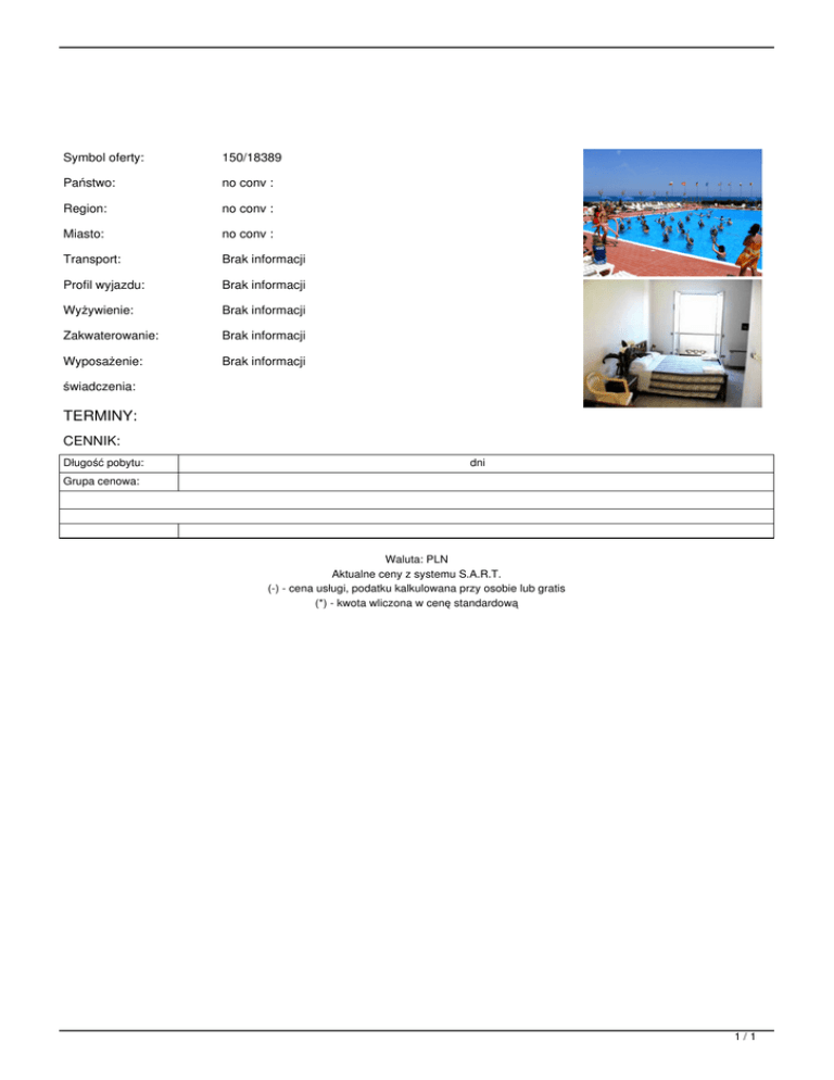 Symbol oferty: 150/18389 Państwo: no conv : Region: no conv : Miasto: no conv : Transport: Brak informacji Profil wyjazdu: Brak informacji Wyżywienie: Brak informacji Zakwaterowanie: Brak informacji Wyposażenie: Brak informacji świadczenia: TERMINY: CENNIK: Długość pobytu: dni Grupa cenowa: Waluta: PLN Aktualne ceny z systemu S.A.R.T. (-) - cena usługi, podatku kalkulowana przy osobie lub gratis (*) - kwota wliczona w cenę standardową 1/1