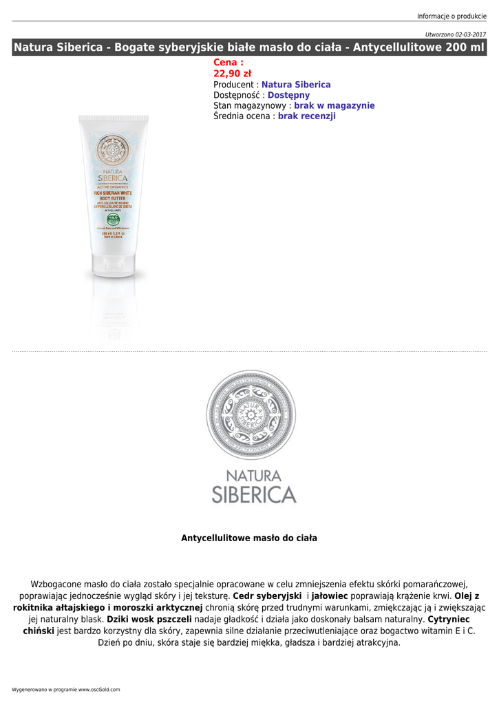 Informacje o produkcie Utworzono 02-03-2017 Natura Siberica - Bogate syberyjskie białe masło do ciała - Antycellulitowe 200 ml Cena : 22,90 zł Producent : Natura Siberica Dostępność : Dostępny Stan magazynowy : brak w magazynie Średnia ocena : brak recenzji Antycellulitowe masło do ciała Wzbogacone masło do ciała zostało specjalnie opracowane w celu zmniejszenia efektu skórki pomarańczowej, poprawiając jednocześnie wygląd skóry i jej teksturę. Cedr syberyjski i jałowiec poprawiają krążenie krwi. Olej z rokitnika ałtajskiego i moroszki arktycznej chronią skórę przed trudnymi warunkami, zmiękczając ją i zwiększając jej naturalny blask. Dziki wosk pszczeli nadaje gładkość i działa jako doskonały balsam naturalny. Cytryniec chiński jest bardzo korzystny dla skóry, zapewnia silne działanie przeciwutleniające oraz bogactwo witamin E i C. Dzień po dniu, skóra staje się bardziej miękka, gładsza i bardziej atrakcyjna. Wygenerowano w programie www.oscGold.com Unikalną bazę produktów Natura Siberica stanowi olej cedrowy, który jest 5 razy bogatszy w witaminę E niż oliwa z oliwek i 3 razy bogatszy w witaminę F niż wątroba dorsza. Dzięki tym właściwościom, działa ochronnie, wygładzająco i nawilżająco. Produkt nie zawiera: parabenów, SLS, PEG, SLES, olei mineralnych, silikonów, składników pochodzenia zwierzęcego. Stosowanie: wszystkie rodzaje skóry, codzienna pielęgnacja. Sposób użycia: wmasować w czystą skórę, zwracając szczególną uwagę na problemowe miejsca. Pojemność: 200 ml Certyfikat ICEA ICEA (Istituto per la Certificazione Etica ed Ambientale włoski Instytut certyfikujący produkty wg etyki środowiskowej). Jeden z najważniejszych organów certyfikujących produkty naturalne oraz organiczne we Włoszech i Europie. Uznany przez Ministerstwo Rolnictwa i Leśnictwa kontroluje pochodzenie zastosowanych surowców roślinnych, a w szczególności proweniencję ekstraktów i olejków eterycznych pochodzących z upraw ekologicznych (zgodnie z rozporządzeniem EWG 2092/91). Instytut we współpracy z różnymi producentami, opracował standardy dla kosmetyków przyjaznych środowisku. Zajmuje się nie tylko listą certyfikowanych produktów, ale także samych składników. Kosmetyki certyfikowane przez ICEA spełniają oczekiwania klientów w odniesieniu do zdrowych, bezpiecznych produktów o bezpiecznym wpływie na środowisko. Aby kosmetyk mógł otrzymać certyfikat ICEA: - nie może zawierać substancji modyfikowanych genetycznie; - nie może zawierać komponentów zawartych na liście niedozwolonych składników; - nie może być testowany na zwierzętach; - nie może być poddany promieniowaniu jonizującemu; - musi zawierać certyfikowane, ekologiczne składniki; - jasno określone i łatwo weryfikowalne zasady korelacji między surowcami naturalnymi a produktem końcowym, czyli kosmetykiem; Informacje o produkcie - produkty i procesy produkcji muszą być przyjazne dla środowiska i ludzkiego zdrowia; - musi być stworzony wg zasady zrównoważonego rozwoju środowiska; - musi być wytworzony wyłącznie z surowców pochodzących z upraw ekologicznych; - powinien mieć minimalnie negatywny wpływ na środowisko poprzez stosowanie opakowań nadających się do recyklingu (promowane są opakowania z odnawialnych surowców, materiałów nadających się do recyklingu lub otrzymane ze zwrotu pustych opakowań); - musi być przebadany dermatologicznie. Kosmetyki nie zawierają sztucznych tłuszczy, olejów, silikonów, parafiny, syntetycznych składników chemicznych, parabenów i innych substancji uzyskiwanych przy destylacji ropy naftowej. Certyfikat ICEA jest akredytowany na arenie międzynarodowej i jest równoważny z najważniejszymi europejskimi markami kosmetyków BIO. Rygorystyczne testy dermatologiczne i mikrobiologiczne gwarantują czystość składników odpowiednich dla skóry wrażliwej i alergicznej. Niedozwolone jest stosowanie substancji z roślin modyfikowanych genetycznie GMO. Siberian Friendly: Wspieramy nieliczne narody Syberii. Przy zakupie dzikich ziół syberyjskich staramy się wspierać styl życia ludów w Syberii i na Dalekim Wschodzie. Liczba niektórych ludów jest mniejsza niż 1000 osób ( na przykład 540 Aleutów i 276 Tazów. Dlatego jesteśmy głęboko przekonani, że nasza pomoc jest istotnym krokiem w zachowaniu unikalnych kultur i tradycji narodów Syberii. Wysoko opłacając pracę osób zbierających zioła i rośliny ręcznie, staramy się wspierać małe ludy syberyjskie nie tylko po to, żeby mogli oni godnie opiekować się swoimi rodzinami , ale również żyli zgodnie z dzisiejszymi normami społecznymi i wymogami współczesnego społeczeństwa . Wybierając produkty Natura Siberica, wspierasz ludy Syberii, ich rodziny i pomagasz zachować unikalne zasoby naturalne dalekiego wschodu. Wild Harvested: Ze względu na swój surowy klimat, Syberia jest pełna unikalnych roślin, niezbędnych dla zdrowia i urody. Aby Wygenerowano w programie www.oscGold.com przetrwać na mrozie do –50C i wytrzymać silne wiatry, syberyjskie zioła i rośliny syntetyzują ochronne składniki aktywne i mają niewiarygodne właściwości przeciwutleniające. W naszej firmie czcimy technikę zbierania dzikich ziół. Niezwykle ważne jest, aby zebrać rośliny w odpowiednim wieku i wielkości, w czasie najwyższego stężenia głównych składników potrzebnych dla zdrowia i urody. Właśnie dlatego wszystkie dzikie rośliny w Syberii są zbierane ręcznie przez lokalnych mieszkańców.