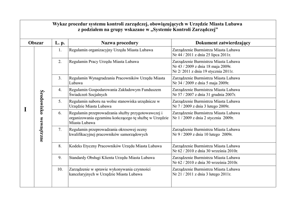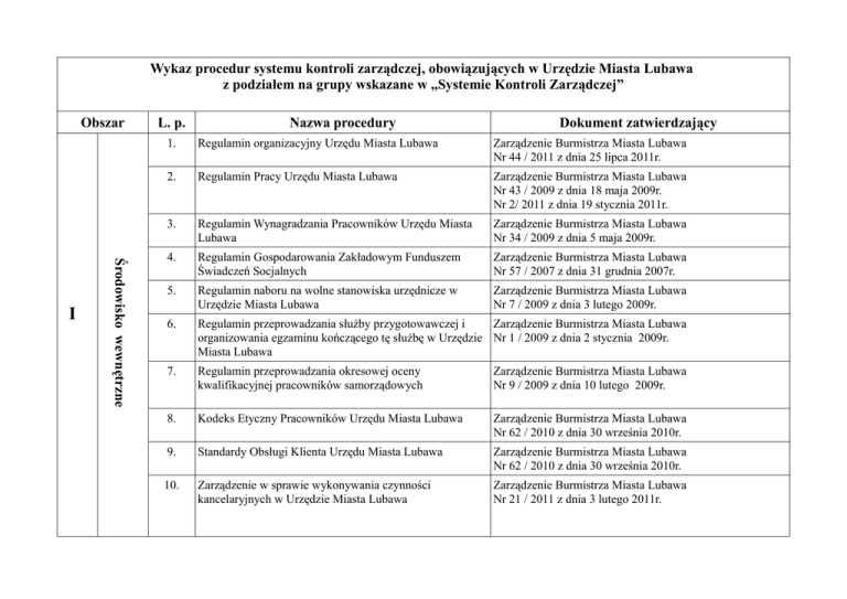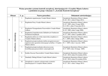 Wykaz procedur systemu kontroli zarządczej, obowiązujących w Urzędzie Miasta Lubawa z podziałem na grupy wskazane w „Systemie Kontroli Zarządczej” Obszar Środowisko wewnętrzne I L. p. Nazwa procedury Dokument zatwierdzający 1. Regulamin organizacyjny Urzędu Miasta Lubawa Zarządzenie Burmistrza Miasta Lubawa Nr 44 / 2011 z dnia 25 lipca 2011r. 2. Regulamin Pracy Urzędu Miasta Lubawa Zarządzenie Burmistrza Miasta Lubawa Nr 43 / 2009 z dnia 18 maja 2009r. Nr 2/ 2011 z dnia 19 stycznia 2011r. 3. Regulamin Wynagradzania Pracowników Urzędu Miasta Lubawa Zarządzenie Burmistrza Miasta Lubawa Nr 34 / 2009 z dnia 5 maja 2009r. 4. Regulamin Gospodarowania Zakładowym Funduszem Świadczeń Socjalnych Zarządzenie Burmistrza Miasta Lubawa Nr 57 / 2007 z dnia 31 grudnia 2007r. 5. Regulamin naboru na wolne stanowiska urzędnicze w Urzędzie Miasta Lubawa Zarządzenie Burmistrza Miasta Lubawa Nr 7 / 2009 z dnia 3 lutego 2009r. 6. Regulamin przeprowadzania służby przygotowawczej i Zarządzenie Burmistrza Miasta Lubawa organizowania egzaminu kończącego tę służbę w Urzędzie Nr 1 / 2009 z dnia 2 stycznia 2009r. Miasta Lubawa 7. Regulamin przeprowadzania okresowej oceny kwalifikacyjnej pracowników samorządowych Zarządzenie Burmistrza Miasta Lubawa Nr 9 / 2009 z dnia 10 lutego 2009r. 8. Kodeks Etyczny Pracowników Urzędu Miasta Lubawa Zarządzenie Burmistrza Miasta Lubawa Nr 62 / 2010 z dnia 30 września 2010r. 9. Standardy Obsługi Klienta Urzędu Miasta Lubawa Zarządzenie Burmistrza Miasta Lubawa Nr 62 / 2010 z dnia 30 września 2010r. 10. Zarządzenie w sprawie wykonywania czynności kancelaryjnych w Urzędzie Miasta Lubawa Zarządzenie Burmistrza Miasta Lubawa Nr 21 / 2011 z dnia 3 lutego 2011r. Mechanizmy kontroli III Cele i zarządzanie ryzykiem II 1. Statut Miasta Lubawa Uchwała Nr VI / 38 / 2003 Rady Miasta Lubawa z dnia 30 kwietnia 2004r. ( Dz. Urz. WM Nr 82, poz 1187 z dnia 12 czerwca 2003r. ) Uchwała Nr VIII / 88 / 2011 Rady Miasta Lubawa z dnia 5 lipca 2011r. ( Dz. Urz. WM Nr 105, poz. 1765 z dnia 29 lipca 2011r. ) 2. Budżet Miasta Lubawa Coroczna uchwała Rady Miasta Lubawa 3. Wieloletnia Prognoza Finansowa Miasta Lubawa na lata 2012 – 2020 Uchwała rady Miasta Lubawa nr XIII/ 124 / 2011 z dnia 21 grudnia 2011r. 4. Procedury zarządzania ryzykiem w Urzędzie Miasta Lubawa Zarządzenie Burmistrza Miasta Lubawa Nr 78 / 2011 z dnia 29 grudnia 2011r. 1. Polityka rachunkowości Zarządzenie Burmistrza Miasta Lubawa Nr 60 / 2008 z dnia 31 grudnia 2008r. 2. Instrukcja ewidencji i poboru podatków i opłat w mieście Lubawa Zarządzenie Burmistrza Miasta Lubawa Nr 9 / 2006 z dnia 23 marca 2006r. Zarządzenie Burmistrza Miasta Lubawa Nr 36/ 2009 z dnia 18 maja 2009r. 3. Sposób prowadzenia ksiąg rachunkowych Zarządzenie Burmistrza Miasta Lubawa Nr 14/ 2006 z dnia 31 maja 2006r. 4. W sprawie procedur kontroli finansowej w Urzędzie Miasta Zarządzenie Burmistrza Miasta Lubawa Lubawa Nr 32/ 2009 z dnia 11 maja 2009r. 5. Zakładowy plan kont Zarządzenie Burmistrza Miasta Lubawa Nr 1/ 2002 z dnia 15 stycznia 2002r. Zarządzenie Burmistrza Miasta Lubawa Nr 5/ 2003 z dnia 12 luty 2003r. Zarządzenie Burmistrza Miasta Lubawa Nr 34/ 2004 z dnia 31 grudnia 2004r. Zarządzenie Burmistrza Miasta Lubawa Nr 42/ 2005 z dnia 30 grudnia 2005r. 6. W sprawie zasad przeprowadzenia i rozliczenia inwentaryzacji Zarządzenie Burmistrza Miasta Lubawa Nr 5/ 2002 z dnia 23 grudnia 2002r. 7. Instrukcja w sprawie przeciwdziałania wprowadzaniu do Zarządzenie Burmistrza Miasta Lubawa obrotu finansowego wartości majątkowych pochodzących z Nr 50/ 2008 z dnia 15 grudnia 2008r. nielegalnych lub nieujawnionych źródeł oraz przeciwdziałania finansowaniu terroryzmu 8. Regulamin udzielania zamówień publicznych przez Gminę Zarządzenie Burmistrza Miasta Lubawa Miejską Lubawa Nr 20/ 2010 z dnia 22 marca 2010r. 9. Sposób i zasady ewidencjonowania wydatków na realizację Zarządzenie Burmistrza Miasta Lubawa projektów korzystających ze środków Unii Europejskiej Nr 33/ 2004 z dnia 31 grudnia 2004r. 10. Sposób i zasady ewidencjonowania i finansowania wydatków na realizację projektu „ Rewitalizacja centrumStarego Rynku miasta Lubawa – etap I” współfinansowanego z Europejskiego Funduszu Rozwoju Regionalnego Zarządzenie Burmistrza Miasta Lubawa Nr 84/ 2010 z dnia 31 grudnia 2010r. 11. W sprawie ustalenia wysokości opłaty za udostępnianie informacji publicznej w Urzędzie Miasta Lubawa Zarządzenie Burmistrza Miasta Lubawa Nr 42/ 2011 z dnia 13 lipca 2011r. 12. Komisja Socjalna jako Organ stanowiący kontrole nad funkcjonowaniem ZFŚS w Urzędzie Miasta Lubawa Zarządzenie Burmistrza Miasta Lubawa Nr 55/ 2011 z dnia 6 września 2011r. 13. Polityka bezpieczeństwa danych osobowych Zarządzenie Burmistrza Miasta Lubawa Nr 60/ 2010 z dnia 28 września 2010r. 14. Instrukcja zarządzania systemem informatycznym służącym do przetwarzania danych osobowych Zarządzenie Burmistrza Miasta Lubawa Nr 60/ 2010 z dnia 28 września 2010r. 15. System Pierwszej Pomocy Zarządzenie Burmistrza Miasta Lubawa Nr 1/ 2008 z dnia 2 stycznia 2008r. 16. Instrukcja Bezpieczeństwa Pożarowego Urzędu Miasta Lubawa Zatwierdzona 2010r. 17. W sprawie zasad gospodarowania nieruchomościami stanowiącymi własność Gminy Miejskiej Lubawa Uchwała Rady Miasta Lubawa Nr IV/ 27 / 2007 z dnia 31 stycznia 2007r. 18. Regulamin organizacyjny Urzędu Miasta Lubawa na czas wojny Zarządzenie Burmistrza Miasta Lubawa Nr 46 / 2005 z dnia 30 grudnia 2005r. 19. Organizacja służby „Stałego Dyżuru” na czas zagrożenia bezpieczeństwa państwa i wojny w Mieście Lubawa Zarządzenie Burmistrza Miasta Lubawa Nr 49 / 2007 z dnia 9 października 2007r. 20. W sprawie wprowadzenia Planu Ochrony Informacji Niejawnych Zarządzenie Burmistrza Miasta Lubawa w Urzędzie Miasta Lubawa Nr 13 / 2007 z dnia 19 lutego 2007r. 21. W sprawie organizacji systemu wczesnego ostrzegania o zagrożeniach Zarządzenie Burmistrza Miasta Lu