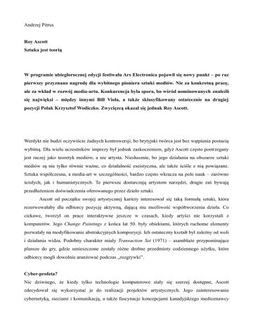 Andrzej Pitrus Roy Ascott Sztuka jest teorią W programie ubiegłorocznej edycji festiwalu Ars Electronica pojawił się nowy punkt – po raz pierwszy przyznano nagrodę dla wybitnego pioniera sztuki mediów. Nie za konkretną pracę, ale za wkład w rozwój media-artu. Konkurencja była spora, bo wśród nominowanych znaleźli się najwięksi – między innymi Bill Viola, a także sklasyfikowany ostatecznie na drugiej pozycji Polak Krzysztof Wodiczko. Zwycięzcą okazał się jednak Roy Ascott. Werdykt nie budzi oczywiście żadnych kontrowersji, bo brytyjski twórca jest bez wątpienia postacią wybitną. Dla wielu uczestników imprezy był jednak zaskoczeniem, gdyż Ascott często postrzegany jest raczej jako teoretyk mediów, a nie artysta. Niesłusznie, bo jego działania na obszarze sztuki mediów są nie tylko równie ważne, co działalność eseistyczna, ale także ściśle z nią powiązane. Sztuka współczesna, a media-art w szczególności, bardzo często wkracza na pole nauk – zarówno ścisłych, jak i humanistycznych. Te pierwsze dostarczają artystom narzędzi, drugie zaś bywają przedłużeniem doświadczenia oferowanego przez dzieło sztuki. Ascott od początku swojej artystycznej kariery interesował się taką formułą sztuki, która rezerwowałaby dla odbiorcy pozycję aktywną, dającą mu możliwość współtworzenia dzieła. Co ciekawe, tworzył on prace interaktywne jeszcze w czasach, kiedy artyści nie korzystali z komputerów. Jego Change Paintings z końca lat 50. były obiektami, których ruchome elementy pozwalały na modyfikowanie abstrakcyjnych kompozycji. Ich ostateczny kształt był zależny od woli i działania widza. Podobny charakter miały Transaction Set (1971) – asamblaże przypominające plansze do gry, gdzie umieszczone zostały różne drobne przedmioty codziennego użytku, które odbiorcy mogli dowolnie aranżować podczas „rozgrywki”. Cyber-profeta? Nic dziwnego, że kiedy tylko technologie komputerowe stały się szerzej dostępne, Ascott zdecydował się wykorzystać je do realizacji projektów artystycznych. Jego zainteresowania cybernetyką, sieciami i komunikacją, a także fascynacje koncepcjami kanadyjskiego medioznawcy Marshalla McLuhana doprowadziły go do sformułowania projektu sztuki telematycznej, do którego odwoływał się zarówno w tekstach teoretycznych, jak i w wielu kolejnych pracach. Jeszcze w latach 60. opublikował tekst Behaviourist Art and the Cybernetic Vision, będący wizjonerską zapowiedzią net artu. Jego projekt artystycznych działań, realizowanych przez wielu użytkowników sieci znajdujących się w różnych częściach świata, nie od razu mógł zostać wdrożony. Należy bowiem pamiętać, że dopiero w 1969 roku powstała sieć ARPANET, będąca zapowiedzią dzisiejszego Internetu. Jednak przez długie lata miała do niej dostęp stosunkowo niewielka liczba użytkowników związanych z wojskiem i środowiskami naukowymi. Ascott już w 1978 roku uzyskał dostęp do sieci, co pozwoliło mu podjąć nad nią badania zakończone realizacją projektu Terminal Art (1980), dzięki któremu zorganizowana została konferencja w przestrzeni wirtualnej. Wzięli w niej udział uczestnicy ze Stanów Zjednoczonych i Wielkiej Brytanii. Rozwinięciem idei Terminal Art była praca Ten Wings (1982), również oparta na pomyśle stworzenia wspólnego środowiska dla uczestników znajdujących się w różnych przestrzeniach. Tym razem jednak artystę zainspirowała księga I Ching, będąca nie tylko zapisem chińskiej kosmologii, ale także instrumentem służącym do wróżenia. To właśnie ten aspekt został zrekonstruowany w realizacji Ascotta, pozwalającej generować wróżby dla świata na podstawie rzutów monetami dokonywanych przez użytkowników systemu. Emergentny tekst Najważniejszym dziełem Roya Ascotta jest jednak realizacja nieco późniejsza, w większym zakresie skupiona na aspekcie artystycznym. Twórca zatytułował ją La Plissure du Texte (1983), nawiązując do słynnego eseju Rolanda Barthes’a. Rola Ascotta polegała tu na skonstruowaniu informatycznego systemu służącego do tworzenia tak zwanej narracji emergentnej, której twórcami byli użytkownicy sieci. Uzyskując dostęp do bazy danych, mogli oni przetwarzać fragmenty powstającego tekstu, dodawać własne elementy i rekonfigurować już istniejące. Praca Ascotta nie tylko stała się ucieleśnieniem jego teoretycznych projektów, ale zwróciła także uwagę na konieczność przewartościowania pozycji artysty, który z twórcy gotowego i zamkniętego dzieła stał się dostarczycielem narzędzi pozwalających użytkownikom kreować jego zawartość. Pierwsza odsłona La Plissure du Texte trwała 12 dni, ale realizacje tego typu mogą mieć również charakter work in progress – niekończącego się procesu, w którym treść utworu jest wypadkową decyzji użytkowników systemu i możliwości interfejsu. Praca z 1983 roku opierała się na prymitywnym z dzisiejszej perspektywy systemie ARTEX, wykorzystującym sieć skrzynek pocztowych, które pozwalają wymieniać informacje. Sama idea została jednak później unowocześniona, kiedy Ascott zrealizował podobny projekt umieszczony tym razem w środowisku gry sieciowej Second Life (LPDT2, 2010). W stronę wizualności Wczesne realizacje Roya Ascotta nie miały rozbudowanego interfejsu wizualnego. Przyczyny były oczywiste: ograniczenia transferu danych pozwalały jedynie posługiwać się tekstem lub tworzyć proste obrazy – jak w La Plissure du Texte – w kodzie ASCII. Brytyjski artysta wiedział jednak, że włączenie obrazów do jego eksperymentów jest tylko kwestią czasu. Przełomowy charakter miała instalacja zaprezentowana podczas Ars Electronica w 1989 roku. Została ona zamontowana na pierwszym piętrze Brucknerhaus – sali koncertowej, w której odbywa się wiele imprez festiwalu, i przyniosła artyście Grand Prix – Złotą Nicę. Twórca zatytu