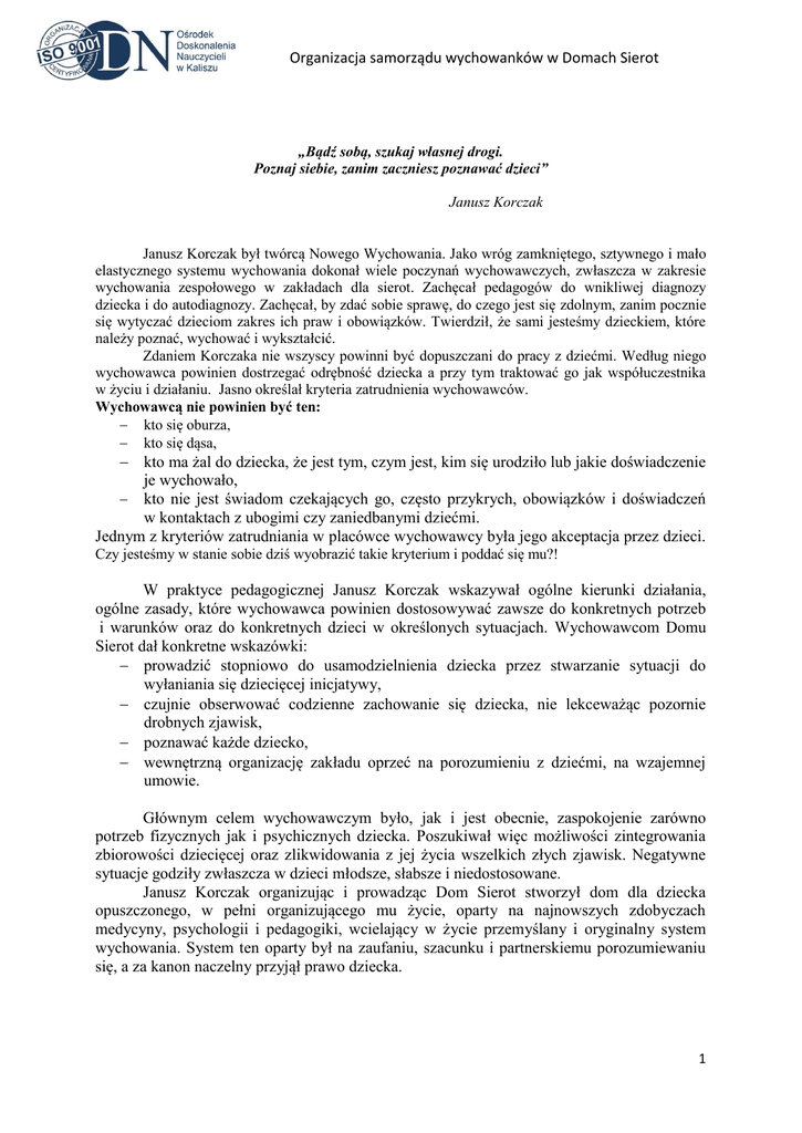 Organizacja samorządu wychowanków w Domach Sierot „Bądź sobą, szukaj własnej drogi. Poznaj siebie, zanim zaczniesz poznawać dzieci” Janusz Korczak Janusz Korczak był twórcą Nowego Wychowania. Jako wróg zamkniętego, sztywnego i mało elastycznego systemu wychowania dokonał wiele poczynań wychowawczych, zwłaszcza w zakresie wychowania zespołowego w zakładach dla sierot. Zachęcał pedagogów do wnikliwej diagnozy dziecka i do autodiagnozy. Zachęcał, by zdać sobie sprawę, do czego jest się zdolnym, zanim pocznie się wytyczać dzieciom zakres ich praw i obowiązków. Twierdził, że sami jesteśmy dzieckiem, które należy poznać, wychować i wykształcić. Zdaniem Korczaka nie wszyscy powinni być dopuszczani do pracy z dziećmi. Według niego wychowawca powinien dostrzegać odrębność dziecka a przy tym traktować go jak współuczestnika w życiu i działaniu. Jasno określał kryteria zatrudnienia wychowawców. Wychowawcą nie powinien być ten: kto się oburza, kto się dąsa, kto ma żal do dziecka, że jest tym, czym jest, kim się urodziło lub jakie doświadczenie je wychowało, kto nie jest świadom czekających go, często przykrych, obowiązków i doświadczeń w kontaktach z ubogimi czy zaniedbanymi dziećmi. Jednym z kryteriów zatrudniania w placówce wychowawcy była jego akceptacja przez dzieci. Czy jesteśmy w stanie sobie dziś wyobrazić takie kryterium i poddać się mu?! W praktyce pedagogicznej Janusz Korczak wskazywał ogólne kierunki działania, ogólne zasady, które wychowawca powinien dostosowywać zawsze do konkretnych potrzeb i warunków oraz do konkretnych dzieci w określonych sytuacjach. Wychowawcom Domu Sierot dał konkretne wskazówki: prowadzić stopniowo do usamodzielnienia dziecka przez stwarzanie sytuacji do wyłaniania się dziecięcej inicjatywy, czujnie obserwować codzienne zachowanie się dziecka, nie lekceważąc pozornie drobnych zjawisk, poznawać każde dziecko, wewnętrzną organizację zakładu oprzeć na porozumieniu z dziećmi, na wzajemnej umowie. Głównym celem wychowawczym było, jak i jest obecnie, zaspokojenie zarówno potrzeb fizycznych jak i psychicznych dziecka. Poszukiwał więc możliwości zintegrowania zbiorowości dziecięcej oraz zlikwidowania z jej życia wszelkich złych zjawisk. Negatywne sytuacje godziły zwłaszcza w dzieci młodsze, słabsze i niedostosowane. Janusz Korczak organizując i prowadząc Dom Sierot stworzył dom dla dziecka opuszczonego, w pełni organizującego mu życie, oparty na najnowszych zdobyczach medycyny, psychologii i pedagogiki, wcielający w życie przemyślany i oryginalny system wychowania. System ten oparty był na zaufaniu, szacunku i partnerskiemu porozumiewaniu się, a za kanon naczelny przyjął prawo dziecka. 1 Organizacja samorządu wychowanków w Domach Sierot Głównym narzędziem w walce o prawa dziecka było stworzenie Samorządu Wychowawczego. Działalność samorządu ukierunkowana była na trzy zasadnicze cele: wypełnianie zadań przejściowych, konkretnych (organizowanie wycieczek, przedstawień, dbałość o czystość i estetykę pomieszczeń), podejmowanie zadań stałych o charakterze podstawowym (pilnowanie porządku wykonywania obowiązków, opieka nad własnością, organizacja pracy), realizacja zadań stałych o charakterze rozwojowym (samodoskonalenie się wychowanków, uczenie form współżycia i współdziałania, pobudzanie społecznej aktywności). Najważniejsze organy samorządu to Sąd Koleżeński, Rada Samorządowa i Sejm Dziecięcy. Sąd Koleżeński odgrywał w samorządzie Korczakowskim wiodącą rolę. W skład sądu wchodziło 5 wychowanków, tworząc zespół sędziowski, i wychowawca, pełniący rolę sekretarza. Zespół sędziowski w wyrokowaniu spraw, jakie wpływały do sądu, opierał się na specjalnym kodeksie opracowanym przez Korczaka. Kodeks składał się ze 100 paragrafów, z których większość stanowiły paragrafy uniewinniające i przebaczające; tylko niektóre z nich dotyczyły "wyroków skazujących". Sąd zbierał się raz w tygodniu, i to bez udziału stron zainteresowanych. Sędziami mogli być tylko wychowankowie, którzy w ostatnim tygodniu nie byli zapisani na "sprawę" czy też nie podali nikogo do sądu. Wybierano ich drogą losowania. Podczas jednego posiedzenia sędziowie rozpatrywali kilkanaście lub więcej spraw zapisanych uprzednio na tablicy - "liście spraw" lub składanych ustnie wychowawcy, sprawującemu funkcję sekretarza. Skargi można było podawać również na siebie samego i dorosłych. Ostateczną decyzję co do osądu każdej ze "spraw" podejmowano w wyniku głosowania. Prawo takie przysługiwało wyłącznie zespołowi sędziowskiemu. Wydane "wyroki" ogłaszano na tablicy i w gazetce. Dokonywano też okresowych zestawień w postaci wykresów uwzględniających liczby poszczególnych paragrafów, czym na ogół zajmował się sekretarz. Sąd Koleżeński był powołany z myślą o tym by: usunąć zależność dziecka od woli i humoru wychowawcy, wprowadzić zasady, normy, które obowiązywały w życiu gromady i regulowały atmosferę zakładu, zainteresować wychowanka własnym postępowaniem, obudzić refleksję nad swoimi czynami, uczyć samokrytycyzmu i tolerancji wobec drugiego człowieka, kształtować mocny fundament wzorowej postawy etycznej wychowanka. Sąd miał prawo sądzenia nie tylko dzieci, ale i dorosłych, a funkcje sędziów pełniły dzieci. Sąd Koleżeński posiadał specjalny kodeks, w którym czytamy: „Jeżeli ktoś zrobił coś złego, najlepiej mu przebaczyć, jeżeli zrobił coś złego nieumyślnie, będzie w przyszłości ostrożniejszy [...] Jeżeli zrobił coś złego, bo go namówili, już się nie będzie słuchał. Jeżeli zrobi coś złego lepiej mu przebaczyć, czekać aż się poprawi. Ale sąd musi bronić cichych, by ich nie krzywdzili zaczepni i natrętni, sąd musi bronić słabszych, by im nie dokuczali silni, sąd musi bronić sum