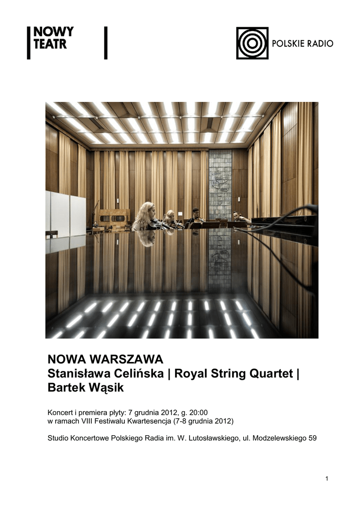 NOWA WARSZAWA Stanisława Celińska | Royal String Quartet | Bartek Wąsik Koncert i premiera płyty: 7 grudnia 2012, g. 20:00 w ramach VIII Festiwalu Kwartesencja (7-8 grudnia 2012) Studio Koncertowe Polskiego Radia im. W. Lutosławskiego, ul. Modzelewskiego 59 1 Wykonanawcy: Stanisława Celińska (wokal), Bartek Wąsik (fortepian), Royal String Quartet w składzie: Izabella Szałaj-Zimak (I skrzypce), Elwira Przybyłowska (II skrzypce), Marek Czech (altówka), Michał Pepol (wiolonczela), Aranżacje: Bartek Wąsik Nowa Warszawa to wyjątkowy projekt muzyczny sygnowany przez Nowy Teatr Krzysztofa Warlikowskiego. Zestaw piosenek zaproponowany przez Stanisławę Celińską i Royal String Quartet jest muzycznym niezbędnikiem każdego mieszkańca i miłośnika Stolicy, jest podróżą przez jej liryczne, heroiczne i sentymentalne zakamarki. Na płycie Nowa Warszawa – i podczas koncertu promującego jej wydanie – usłyszymy szlagiery dawnej Warszawy, popularnie piosenki autorstwa takich wykonawców jak Czesław Niemen, T.Love i Bajm, a nawet motyw muzyczny stworzony przez Davida Bowie pod wpływem krótkiego spaceru po Warszawie. Wszystko to w nowatorskich aranżacjach Bartka Wąsika, wyśpiewane hipnotycznym głosem Stanisławy Celińskiej, którą publiczność pokochała nie tylko za jej kreacje aktorskie, ale również doskonałe recitale wokalne („Domofon, czyli śpiewniczek domowy Stanisławy C.”, „Piękny świat”). Podczas koncertu i na płycie Nowa Warszawa artyści zaprezentują dwanaście utworów: 1. WARSZAWA (utwór instrumentalny) muzyka: David Bowie, Brian Eno 2. WARSZAWA muzyka: Janek Benedek, tekst: Zygmunt Staszczyk 3. ZNAJDZIESZ TO W WARSZAWIE muzyka: Jerzy Matuszkiewicz, tekst: Wojciech Młynarski 4. CAŁA WARSZAWA muzyka: Zygmunt Karasiński, tekst: Andrzej Włast 5. BAL NA GNOJNEJ muzyka: Fanny Gordon, tekst: Julian Krzewiński, Leopold Brodziński 6. WARSZAWO MA! muzyka: Casmir Georges Oberfeld, tekst: Andrzej Włast 7. TANGO WARSZAWO muzyka: Stanisław Sojka, tekst: Agnieszka Osiecka 8. DESZCZ muzyka: Władysław Szpilman, tekst: Konstanty Ildefons Gałczyński 9. POKOIK NA HOŻEJ muzyka: Władysław Daniłowski, tekst: Julian Tuwim 10. TAKA WARSZAWA muzyka: Adam Abramek i Paweł Sot, tekst: Beata Kozidrak 11. SEN O WARSZAWIE muzyka: Czesław Niemen, tekst: Czesław Gaszyński 12. WARSZAWO PIĘKNA WARSZAWO muzyka: Zygmunt Karasiński, tekst: Andrzej Włast Pomysłodawca projektu: Mike Urbaniak Realizacja nagrania i mastering: Leszek Kamiński Projekt graficzny: Justyna Kosińska Temperowka.pl Fotografie: Magda Hueckel Produkcja: Nowy Teatr Koprodukcja: Polskie Radio SA Patroni medialni: Polskie Radio, Gazeta Wyborcza, Księgarnia Traffic Club 2 Royal String Quartet jest pomysłodawcą i organizatorem własnego, wyjątkowego festiwalu muzyki kameralnej Kwartesencja, którego dotychczasowe odsłony zyskały liczne grono słuchaczy, przychylne recenzje prasy i tytuł Wydarzenia Kulturalnego Roku 2004 przyznany przez miesięcznik Wprost. „To niewątpliwie akt odwagi, ale i dowód na nieskostnienie i otwartą głowę. Na duszę oddaną muzyce, a nie stereotypom” – tak o Kwartesencji mówi Kayah, jedna z gwiazd poprzedniej edycji festiwalu. Mieszać style i gatunki, schodzić z utartych ścieżek, łączyć fantastycznych artystów światowego formatu, którzy na co dzień nie spotykają się na scenie, ani nawet na antenie tej samej stacji radiowej. To wszystko jest kwintesencją Kwartesencji – jedynego takiego cyklu koncertów w Polsce, który zyskał ważne miejsce w kalendarzu kulturalnym stolicy i zdobył specyficzną publiczność. Specyficzną, bo niezwykle różnorodną, jak różnorodny jest program każdej edycji festiwalu. Gospodarze Kwartesencji, muzycy Royal String Quartet, festiwal wymyślili i od 2004 roku organizują, prezentując medium kwartetu smyczkowego w najrozmaitszych ujęciach. Obok klasyki ważne miejsce zajmuje tu także nowa muzyka: dużym echem odbiły się prezentowane na festiwalu interpretacje utworów Henryka Mikołaja Góreckiego czy George’a Crumba, a z myślą o RSQ nowe utwory piszą Paweł Szymański, Wojciech Blecharz czy Andrzej Kwieciński. Z muzykami z RSQ spotkali się już na warszawskiej scenie m.in. legendarny Stephen Kovacevich, jedna z najciekawszych współczesnych pianistek Angela Hewitt, wspaniały Mark Padmore, ale także Kayah, Smolik, DJ Lenar, czy Kapela ze wsi Warszawa. Gwiazdy najlepszych filharmonii i gwiazdy muzycznej alternatywy koncertujące razem – to jest możliwe tylko na Kwartesencji! Dzięki gościom z drugiej strony muzycznej „barykady” festiwal zyskuje dodatkowy wymiar i luźny, nieformalny charakter spotkania towarzyskiego. Do tej pory na Festiwalu Kwartesencja wystąpili (w porządku alfabetycznym): Klaudiusz Baran, Andrzej Bauer, Kwartet Camerata, Martin Fröst, Krzysztof Herdzin, Angela Hewitt, Hob-beats Duo, Kapela Ze Wsi Warszawa, Kayah, Cezary Konrad, Stephen Kovacevich, Urszula Kryger, Michał Kulenty, Kwadrofonik, DJ Lenar, Simon Lepper, Lutosławski Piano Duo, Marcin Murawski, Michał Nagy, Mark Padmore, Quartet New Generation, Smolik, Tomasz Strahl, Kwartet Skampa, Kwartet Śląski, Wojciech Świtała, Antoine Tamestit oraz Monika Wolińska. 3 STANISŁAWA CELIŃSKA Jedna z największych polskich osobowości aktorskich. Absolwentka PWST w Warszawie. Debiutowała na deskach Teatru Współczesnego w 1968 roku, w latach późniejszych związana z Teatrem Nowym w Warszawie, Dramatycznym, Nowym w Poznaniu, Studio i Rozmaitości. Występowała w spektaklach Erwina Axera, Tadeusza Łomnickiego, Zygmunta Hübnera. Od premiery Zachodniego wybrzeża w 1998 roku regularnie współpracuje z Krzysztofem Warlikowskim. Grała między innymi w Hamlecie, Oczyszczonych (nagroda im. Zelwerowicza oraz Feliks Warszawski za rolę Kobiety), Burzy, Krumie, Aniołach w Ameryce, Końcu i Opowieściach afrykańskich wg Szekspira. Jest również cenioną aktorką filmową. Wystąpiła w wielu film