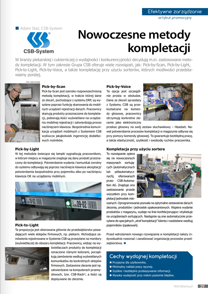 Efektywne zarządzanie artykuł promocyjny Adam Steć, CSB-System CSB-System Nowoczesne metody kompletacji W branży piekarskiej i cukierniczej o wydajności i konkurencyjności decydują m.in. zastosowane metody kompletacji. W tym zakresie Grupa CSB oferuje wiele rozwiązań, jak: Pick-by-Scan, Pick-by-Light, Pick-to-Light, Pick-by-Voice, a także kompletację przy użyciu sorterów, których możliwości przedstawiamy poniżej. FOT. CSB-System Pick-by-Scan Pick-by-Voice Pick-by-Scan jest szeroko rozpowszechnioną metodą kompletacji, w trakcie której dane ze zleceń, pochodzące z systemu ERP, są wysyłane poprzez funkcję skanowania do mobilnych urządzeń rejestracji danych. Pracownicy skanują produkty przeznaczone do kompletacji, pobierają ilości wyświetlane na urządzeniu mobilnej rejestracji i zatwierdzają proces naciśnięciem klawisza. Bezpośrednia komunikacja urządzeń mobilnych z Systemem CSB wyklucza jakąkolwiek ingerencję dodatkowych nośników. Ta opcja jest szczególnie prosta w obsłudze. Dane ze zleceń sprzedaży z Systemu CSB są przekształcane na komendy głosowe, pracownicy otrzymują konkretne zlecenie jako elektroniczny przekaz głosowy na swój zestaw słuchawkowy – Headset. Nawet potwierdzenie procesów kompletacji w magazynie odbywa się przy pomocy komendy głosowej. To gwarantuje bezbłędną pracę, a także elastyczność, szybkość i swobodę ruchów pracownika. Pick-by-Light Kompletacja przy użyciu sortera W tej metodzie świecące się lampki sygnalizują pracownikom, w którym miejscu w magazynie znajduje się dany produkt przeznaczony do kompletacji. Potwierdzenie wydania i komunikat zwrotny do systemu odbywają się poprzez naciśnięcie klawisza akceptacji/ potwierdzenia bezpośrednio przy pojemniku albo po naciśnięciu klawisza OK na urządzeniu mobilnym. To rozwiązanie opiera się na nowoczesnych maszynach sortujących (automatycznych lub półautomatycznych), oferowanych przez CSB-Automation AG. Znajduje ono zastosowanie przede wszystkim przy kompletacji jednostek mieszanych. Oprogramowanie pozwala na optymalne zestawienie danych zlecenia, produktów i jednostek opakowaniowych. Wspiera wydanie produktów z magazynu, wydaje na linie konfekcjonujące i etykietuje na urządzeniach sortujących. Następnie są one automatycznie przesyłane do specjalnych „stref kompletacji” klienta i rozdzielane według pojemników (opakowań). Pick-to-Light Ta propozycja jest skierowana głównie do przedsiębiorstw posiadających wiele sklepów firmowych, np. piekarni. Wchodzące zamówienia rejestrowane w Systemie CSB są przesyłane na monitory (wyświetlacze) do obszaru kompletacji. Pracownicy, widząc na wyświetlaczach produkty do kompletacji oznaczone różnymi kolorami, porządkują zamówienie według wyświetlanych komunikatów do konkretnych sklepów firmowych. Zestawione zlecenie jest np. zatwierdzane na komputerach przemysłowych, tzw. CSB-Rack®, a ilości są dopisywane do zlecenia. Przed wdrożeniem nowego rozwiązania w kompletacji należy indywidualnie rozeznać i zanalizować organizację procesów przedsiębiorstwa. n Cechy wydajnej kompletacji Przyjazna dla użytkownika. Minimalny nakład pracy ręcznej. Szybkie i bezbłędne przekazywanie informacji. Wysoka wydajność przy niskim poziomie błędów. MistrzBranzy.pl 29