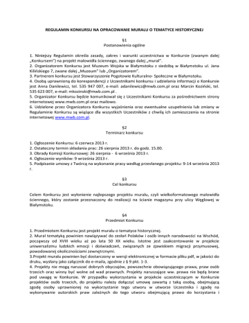 REGULAMIN KONKURSU NA OPRACOWANIE MURALU O TEMATYCE HISTORYCZNEJ §1 Postanowienia ogólne 1. Niniejszy Regulamin określa zasady, zakres i warunki uczestnictwa w Konkursie (zwanym dalej „Konkursem”) na projekt malowidła ściennego, zwanego dalej „mural”. 2. Organizatorem Konkursu jest Muzeum Wojska w Białymstoku z siedzibą w Białymstoku ul. Jana Kilińskiego 7, zwane dalej „Muzeum” lub „Organizatorem”. 3. Partnerem konkursu jest Stowarzyszenie Pogotowie Kulturalno- Społeczne w Białymstoku. 4. Osobą uprawnioną do korespondencji z Uczestnikami konkursu i udzielania informacji o Konkursie jest Anna Danilewicz, tel. 535 947 007, e-mail: [email protected] oraz Marcin Koziński, tel. 535 623 007, e-mail: [email protected] . 5. Organizator Konkursu będzie komunikował się z Uczestnikami Konkursu za pośrednictwem strony internetowej www.mwb.com.pl oraz mailowo. 6. Udzielone przez Organizatora Konkursu wyjaśnienia oraz ewentualne uzupełnienia lub zmiany w Regulaminie Konkursu są wiążące dla wszystkich Uczestników z chwilą ich zamieszczenia na stronie internetowej www.mwb.com.pl. §2 Terminarz konkursu 1. Ogłoszenie Konkursu: 6 czerwca 2013 r. 2. Ostateczny termin składania prac: 26 sierpnia 2013 r. do godz. 15.00. 3. Obrady Komisji Konkursowej: 26 sierpnia - 6 września 2013 r. 4. Ogłoszenie wyników: 9 września 2013 r. 5. Podpisanie umowy z Twórcą na wykonanie pracy według przesłanego projektu: 9-14 września 2013 r. §3 Cel konkursu Celem Konkursu jest wyłonienie najlepszego projektu muralu, czyli wielkoformatowego malowidła ściennego, który zostanie przeznaczony do realizacji na ścianie magazynu przy ulicy Węglowej w Białymstoku. §4 Przedmiot Konkursu 1. Przedmiotem Konkursu jest projekt muralu o tematyce historycznej. 2. Mural tematyką powinien nawiązywać do zesłań Polaków i osób innych narodowości na Wschód, począwszy od XVIII wieku aż po lata 50 XX wieku. Istotne jest zaakcentowanie w projekcie uniwersalizmu ludzkich emocji i doświadczeń, związanych ze zjawiskiem migracji przymusowej, powodowanej okolicznościami zewnętrznymi. 3.Projekt muralu powinien być dostarczony w wersji elektronicznej w formacie pliku pdf, w jakości do druku, wysłany jako załącznik do e-maila, zgodnie z § 9 pkt. 1-3. 4. Projekty nie mogą naruszać dobrych obyczajów, powszechnie obowiązującego prawa, praw osób trzecich oraz winny być wolne od wad prawnych. Projekty naruszające ww. prawa nie będą brane pod uwagę w Konkursie. W przypadku wykorzystania w projekcie uczestniczącym w Konkursie projektów osób trzecich, do projektu należy dołączyć umowę zawartą z taką osobą, obejmującą zgodę osoby uprawnionej na wykorzystanie tego utworu w utworze Uczestnika i zgodę na wykonywanie autorskich praw zależnych do tego utworu obejmującą prawo do korzystania i rozporządzania utworem Uczestnika w zakresie nie mniejszym niż korzystanie ze zwycięskiego projektu. 5. W Konkursie nie mogą brać udziału projekty, które w całości lub w części były zgłaszane na inny konkurs, otrzymały nagrodę lub były publikowane w jakiejkolwiek postaci. 6. Laureat konkursu następnie będzie zobowiązany do wykonania muralu według zwycięskiego projektu na magazynie przy ulicy Węglowej w Białymstoku w dniu 28 września 2013 r. w czasie trwania festiwalu „Inny wymiar” od godziny 10.00. 7. Zwycięski projekt muralu będzie wykonany na ścianie znajdującej się we wskazanej w pkt 6 lokalizacji. 8. Mural powinien być wykonany w technice wielkoformatowej grafiki wykonywanej na bazie farb akrylowych lub innych farb dostosowanych do malarstwa na elewacji budynku. 9. Koszty realizacji projektu, o którym mowa w §4 pkt 5 pokrywa Organizator do wysokości 2 000 zł. §5 Charakter i uczestnicy konkursu 1. Konkurs ma charakter otwarty. 2. Konkurs odbywa się jednoetapowo. 3. Uczestnikiem Konkursu może być każda pełnoletnia osoba fizyczna i osoba prawna, która zapozna się z Regulaminem i zaakceptuje jego postanowienia przesyłając na Konkurs prace. 4. Każdy uczestnik Konkursu może zgłosić maksymalnie 3 projekty muralu. 5. Dopuszcza się udział w Konkursie prac wykonanych indywidualnie lub zespołowo. 6. W przypadku zespołu nie będącego osobą prawną konieczne jest wskazanie w formularzu zgłoszeniowym przewodniczącego zespołu, który będzie później reprezentował zespół we wszystkich kontaktach i ewentualnych czynnościach prawnych z Organizatorem, i komu w przypadku wygranej w Konkursie zostanie wypłacona nagroda. Członkowie zespołu, wskazując przewodniczącego zespołu, upoważniają go tym samym do działania w ich imieniu we wszelkich sprawach dotyczących Konkursu. 7. W Konkursie nie mogą brać udziału członkowie Komisji Konkursowej, sekretarz Konkursu oraz ich najbliższa rodzina: małżonkowie, zstępni, wstępni oraz rodzeństwo. 8. Uczestnicy biorący udział w konkursie muszą być twórcami, współtwórcami pracy. 9. Uczestnik, zgłaszając pracę na konkurs, jest zobowiązany do złożenia pisemnego oświadczenia o posiadaniu wyłącznych autorskich praw majątkowych do pracy, które zawiera Karta zgłoszenia (załącznik nr 1). 10. Uczestnicy wyrażają zgodę na podanie swojego imienia i nazwiska oraz publikację złożonego w Konkursie projektu muralu, w przypadku publikacji wyników Konkursu oraz ewentualnej wystawy pokonkursowej, w publikacjach i prezentacjach Organizatora, Partnera oraz w mediach. §6 Warunki konkursu 1. Warunkiem uczestnictwa w Konkursie jest: a) akceptacja i przestrzeganie Regulaminu Konkursu, b) dostarczenie pracy konkursowej zgodnie z wymaganiami, o których mowa w § 4 i 9, c) dostarczenie w terminie składania prac konkursowych prawidłowo wypełnionej karty zgłoszeniowej, stanowiącej załącznik nr 1 do Regulaminu. 2. Nadesłanie prac konkursowych jest równoznaczne z akceptacją warunków Konkursu określonych Regulaminem. §7 Przebieg konkursu 1. Uczestnicy przesyłają