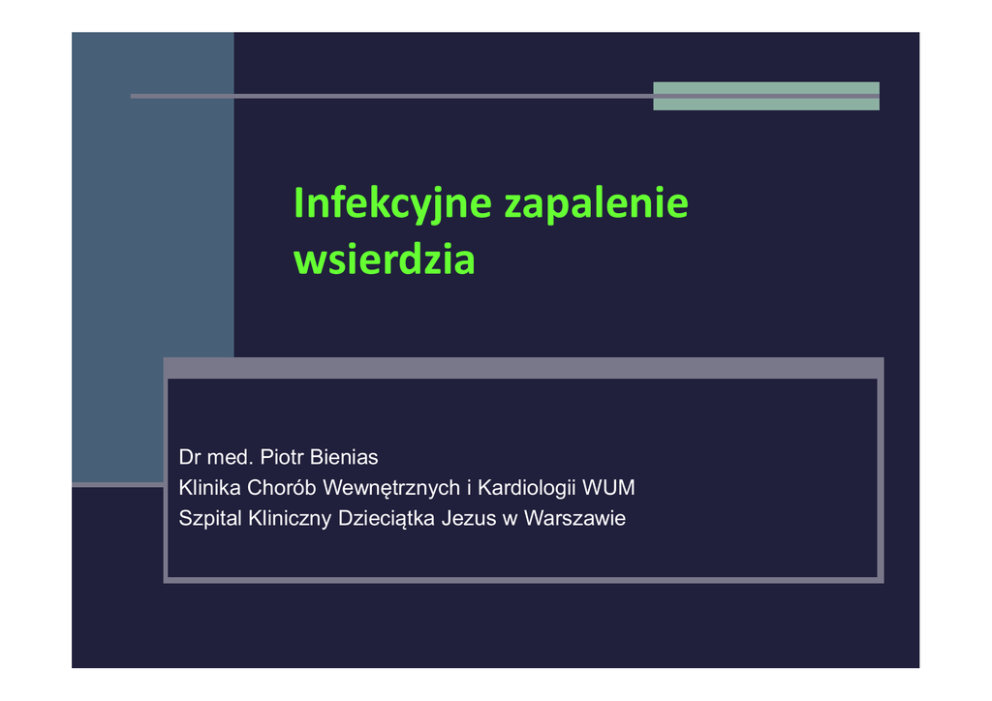 Infekcyjne zapalenie wsierdzia Dr med. Piotr Bienias Klinika Chorób Wewnętrznych i Kardiologii WUM Szpital Kliniczny Dzieciątka Jezus w Warszawie IZW Choroba rozwijająca się w wyniku zakażenia i obejmująca: - struktury serca: zastawki, wsierdzie - duże naczynia klatki piersiowej, przewód Bottala, przetoki tętniczo-żylne, koarktacja aorty - obcy materiał: protezy zastawkowe, elektrody stymulatora, kardiowertera, wytworzone połączenia naczyniowe Rozpoznanie kliniczne IZW powinniśmy podejrzewać: - nowy szmer niedomykalności zastawki (u 85%) - epizody zatorowości nieznanego pochodzenia - sepsa o nieznanym źródle (zwłaszcza dot. bakterii typowych dla IZW) - GORĄCZKA - najczęstszy objaw IZW - u 90% (może nie wyst. u os. starszych, po przeleczeniu AB, w immunosupresji, przy atypowych patogenach) gorączka plus… - sztuczny materiał wewnątrzsercowy (protezy, stymulatory, ICD, konduity) - wywiad przebytego IZW wada zastawkowa lub wada wrodzona inna predyspozycja (immunosupresja, nadużywanie leków iv) ostatnio interwencja związana z bakteriemią objawy niewydolności serca, nowe zaburzenia przewodnictwa typowe dodatnie posiewy krwi lub pozytywna serologia dla gorączki Q zjawiska naczyniowe lub immunologiczne: zatorowość obwodowa, plamki Rotha, objaw Janewaya, guzki Oslera, wybroczyny (u ok. 30%) - ogniskowe lub niespecyficzne objawy neurologiczne - objawy zatorowości płucnej (IZW prawego serca) - odległe ropnie (nerki, śledziona, mózg, kręgosłup) o nieznanej przyczynie !! CRP, WBC, OB, anemia, krwinkomocz Powikłania odległe (pozasercowe) Zatory (najczęstsze powikłania pozasercowe) z lewej połowy serca • zatory tętnic mózgu, serca, nerki, śledziony lub jelita • ropnie, jeśli zatory materiałem zakażonym z prawej polowy serca • zatorowość płucna • zapalenie lub ropnie płuc, jeśli zatory materiałem zakażonym Zakażenia przerzutowe • zapalenie opon mózgowordzeniowych, mięśnia sercowego, odmiedniczkowe zapalenie nerek Bakteriemia • zespół rozsianego wykrzepiania wewnątrznaczyniowego (DIC) • rozlane lub ogniskowe kłębuszkowe zapalenie nerek • martwicze zapalenie małych naczyń • tętniaki infekcyjne dużych i średnich tętnic Zabiegi powodujące bakteriemię w obrębie jamy ustnej, dróg oddechowych lub przełyku • ekstrakcja zęba • zabiegi w obrębie przełyku • leczenie kanałowe • usuwanie kamienia nazębnego • implantacja zęba • usunięcie migdałka podniebiennego lub gardłowego • bronchodskopia sztywnym instrumentem • endoskopowe rozszerzenie przełyku Profilaktyka IZW: stany kardiologiczne najwyższego ryzyka 1. Chorzy z protezą zastawkową lub sztucznym materiałem IIa C III C użytym do naprawy zastawek 2. Chorzy z przebytym IZW 3. Chorzy z wrodzoną wadą serca : - siniczą, bez naprawy chirurgicznej, z rezydualnym defektem, z paliatywnymi shuntami lub conduitami - po naprawie, ze sztucznym materiałem zaopatrzoną chirurgicznie lub przezskórnie (do 6 m-cy po zabiegu) - kiedy pozostaje resztkowy defekt w miejscu implantacji sztucznego materiału (protezy) lub urządzenia Profilaktyka AB nie jest zalecana w innych przypadkach chorób natywnych zastawek lub wad wrodzonych (np. BAV, MVP, AS) Profilaktyka IZW: procedury najwyższego ryzyka PROFILAKTYKA KL. POZIOM A. Procedury stomatologiczne - AB powinna być rozważana: w manipulacji przy dziąsłach, zabiegach okołowierzchołkowych i uszkodzeniu śluzówki (scaling, leczenie kanałowe) AB nie zalecana: do znieczulenia msc nie zainfekowanej tkanki, do usuwania szwów, RTG zęba, przy zakładaniu i usuwaniu aparatów ortodontycznych IIa C III C B. Zabiegi na drogach oddechowych: AB nie zalecana: do bronchoskopii, laryngoskopii, przeznosowej i dotchawiczej intubacji (z wyj. ropni itd.) III C C. Zabiegi gastrologiczne i urologiczne III C III C AB nie zalecana: do gastroskopii, kolonoskopii, cystoskopii i TEE D. Skóra i tkanki miękkie AB nie zalecana: do żadnej procedury (np. tatuaż, body-piercing) E. Zabiegi kardiochirurgiczne i naczyniowe- AB rozważana przed i do 48h po zabiegu Profilaktyka IZW: antybiotykoterapia Pojedyncza dawka 30-60 min przed zabiegiem Alergia na penicyliny ANTYBIOTYK dorośli NIE Amoksycylina lub ampicylina * Cefaleksyna iv 2 g p.o. lub i.v. TAK Klindamycyna 600 mg p.o. lub i.v. • Cefalosporyny nie są zalecane w alergii • Dawki pediatryczne am- 50 mg/kg, klin- 20 mg/kg