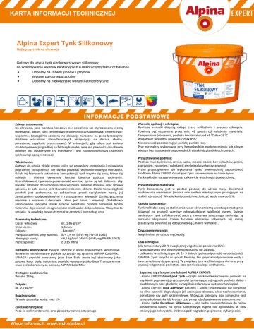 Alpina Expert Tynk Silikonowy Najlepszy tynk na elewacje Gotowy do użycia tynk cienkowarstwowy silikonowy do wykonywania wypraw elewacyjnych o dekoracyjnej fakturze baranka Odporny na rozwój glonów i grzybów Wysoce paroprzepuszczalny Odporny na niekorzystne warunki atmosferyczne Zakres stosowania: Na elewacje, jako warstwa końcowa na: ocieplenia (ze styropianem, wełną mineralną), beton, tynk cementowo-wapienny oraz szpachlówki cementowowapienne. Szczególnie zalecany na elewacje narażone na ponadprzeciętne działanie warunków atmosferycznych (ekspozycja na deszcz, słońce, porastanie, zapylenie przemysłowe). W sytuacjach, gdy celem jest zmiana struktury elewacji z gładkiej na fakturę baranka, a nie ma pewności, czy obecne podłoże jest dyspersyjne czy mineralne - jest najbezpieczniejszą (najmniej ryzykowną) opcją renowacji. Właściwości: Gotowy do użycia, dzięki czemu unika się procedury rozrabiania i ustawiania poprawnej konsystencji; nie trzeba posiadać wolnoobrotowego mieszadła. Dzięki tej fabrycznie ustawionej konsystencji, tynk trzyma się pacy, łatwo się nakłada i ułatwia tworzenie faktury baranka podczas zacierania. Hydrofobowość i paroprzepuszczalność warstwy tynku są tak dobrane, aby uzyskać zdolność do samoosuszania się muru. Idealnie dobrana ilość spoiwa sprawia, że całe ziarno jest równomiernie nim oblane. Dzięki temu ciągłość powłoki jest zachowana, co zabezpiecza przed nasiąkaniem wodą, jej zamarzaniem podpowłokowym i rozsadzaniem elewacji. Zanieczyszczenia niesione z wiatrem i deszczem łatwo jest zmyć z elewacji. Dodatkowo zastosowano specjalne środki przeciw porastaniu. System barwienia Alpina ColorMix, daje niemal nieograniczone możliwości doboru koloru. Wszystko to sprawia, że powłokę łatwo utrzymać w czystości przez długi czas. Parametry techniczne: Ciężar właściwy: Uziarnienie: Faktura: Przepuszczalność pary wodnej: Absorpcja wody: Przyczepność: ok. 1,85 g/cm3 1,5 mm „baranek” Sd < 1,4 m; (kl V2 wg PN-EN 1062) <0,5 kg/(m2 . 24h0,5) (kl W2 wg PN-EN 1062) ≥ 0,35 MPa Dostępna kolorystyka: tysiące kolorów z wielu popularnych wzorników. Barwienie natychmiast w punkcie sprzedaży wg systemu ALPINA ColorMix. UWAGA: produkt oznaczony jako Baza Biała może być stosowany jako gotowy kolor biały, natomiast produkt oznaczony jako Baza Transparentna musi być zabarwiony za pomocą ALPINA ColorMix. Dostępne opakowania: Wiadro 25 kg. Zużycie: ok. 2,7 kg/m2 Rozcieńczanie: W razie potrzeby wodą: max 1% Zalecane narzędzia: Paca ze stali nierdzewnej oraz paca z tworzywa sztucznego Warunki aplikacji i schnięcia: Poniższe warunki dotyczą całego czasu nakładania i procesu schnięcia. Powinny być utrzymane przez min. 48 godzin od nałożenia materiału. Temperatura (otoczenia, podłoża i materiału): od +5 0C do +25 0C Wilgotność względna powietrza: max 85%; Nie stosować podczas mgły i poniżej punktu rosy. Prac nie należy wykonywać przy bezpośrednim nasłonecznieniu lub silnym wietrze bez stosowania odpowiednich siatek lub plandek ochronnych. Przygotowanie podłoża: Podłoże musi być równe, czyste, suche, mocne, nośne, bez wykwitów, pleśni, zagrzybień, zwapnień i substancji zmniejszających przyczepność. Przed przystąpieniem do wykonania tynku powierzchnię zagruntować środkiem Alpina EXPERT Grunt pod Tynk zabarwionym na kolor tynku. Tynk nakładać na zagruntowaną, całkowicie wyschniętą powierzchnię. Przygotowanie materiału: Tynk dostarczany jest w postaci gotowej do użycia masy. Zawartość opakowania rozmieszać (można mieszadłem elektrycznym pracującym na niskich obrotach). W razie konieczności rozcieńczyć wodą max do 1 %. Sposób nanoszenia: Tynk nakładać pacą ze stali nierdzewnej równomierną warstwą a następnie ściągnąć na grubość warstwy odpowiadającej wielkości ziaren. Świeżo naniesiony tynk zafakturować pacą z tworzywa sztucznego zacierając ją ruchami okrężnymi. Każde łączenie obszarów roboczych tej samej płaszczyzny powinno się odbyć metodą „mokre w mokre”. Czyszczenie narzędzi: Natychmiast po użyciu myć wodą. Czas schnięcia: (dla temperatury 20 0C i względnej wilgotności powietrza 65%): - warstwa tynku jest powierzchniowo sucha po 24 godz. - całkowite wyschnięcie po ok. 2 - 3 dniach (pełna odporność na obciążenia) UWAGA: Tynk zasycha w sposób fizyczny, tzn. poprzez odparowanie wody i tworzenie błony dyspersyjnej. W związku z tym w chłodniejsze dni oraz przy wyższej wilgotności powietrza czas schnięcia ulega wydłużeniu. Zapoznaj się z innymi produktami ALPINA EXPERT: - Alpina EXPERT Grunt pod Tynk – dzięki piaskowi kwarcowemu pozwala na uzyskanie poprawnej przyczepności tynku dyspersyjnego do podłoży słabo- i niechłonnych oraz gładkich; szczególnie zalecany w systemach ociepleń. - Alpina EXPERT Tynk Akrylowy Baranek 1,5mm – na elewacje nie narażone na silne czynniki degradujące jak zacinające deszcze, silne nasłonecznienie, porastanie czy pyły przemysłowe. Wówczas zalecany gdy konieczna jest szersza kolorystyka lub krótszy czas pracy lub dopasowanie ekonomiczne. - Alpina Farba Fasadowa Silikonowa – jako farba nawierzchniowa do celów odświeżenia koloru na tynku silikonowym Alpina lub aplikowana w celu zmiany jego kolorystyki. Dobrana pod względem poprawnej dyfuzyjności. Warstwy klejów zbrojonych siatką w Systemach Ociepleń: Nowe, mineralne (zawierające cement): - nanieść Alpina EXPERT Grunt pod Tynk Nowe, dyspersyjne (nie zawierające cementu): - choć nie wymagane, zalecamy nanieść Alpina EXPERT Grunt pod Tynk Stare, zwietrzałe (np. z powodu przestoju prac elewacyjnych zimą): - nanieść Alpina EXPERT Grunt pod Tynk Tynki cementowe i cementowo-wapienne Nowe tynki lub szpachlówki - sezonować minimum 2-4 tygodnie (zależnie od grubości warstwy) - nanieść Alpina EXPERT Grunt pod Tynk Stare tynki porowate, chłonne, lekko piaszczące: - zagruntować