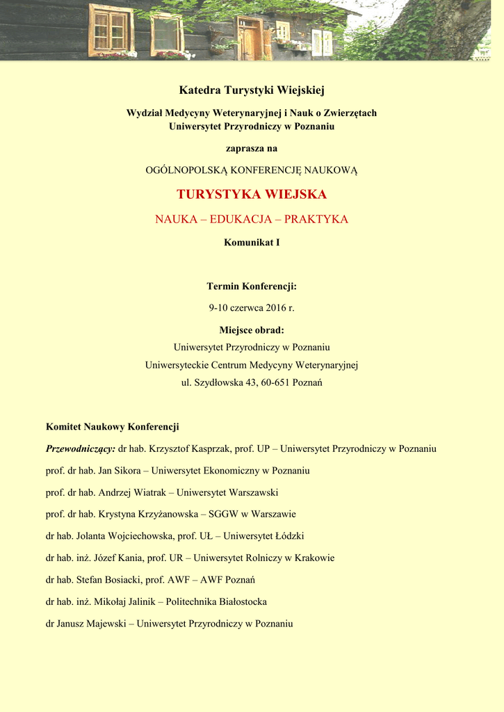 Katedra Turystyki Wiejskiej Wydział Medycyny Weterynaryjnej i Nauk o Zwierzętach Uniwersytet Przyrodniczy w Poznaniu zaprasza na OGÓLNOPOLSKĄ KONFERENCJĘ NAUKOWĄ TURYSTYKA WIEJSKA NAUKA – EDUKACJA – PRAKTYKA Komunikat I Termin Konferencji: 9-10 czerwca 2016 r. Miejsce obrad: Uniwersytet Przyrodniczy w Poznaniu Uniwersyteckie Centrum Medycyny Weterynaryjnej ul. Szydłowska 43, 60-651 Poznań Komitet Naukowy Konferencji Przewodniczący: dr hab. Krzysztof Kasprzak, prof. UP – Uniwersytet Przyrodniczy w Poznaniu prof. dr hab. Jan Sikora – Uniwersytet Ekonomiczny w Poznaniu prof. dr hab. Andrzej Wiatrak – Uniwersytet Warszawski prof. dr hab. Krystyna Krzyżanowska – SGGW w Warszawie dr hab. Jolanta Wojciechowska, prof. UŁ – Uniwersytet Łódzki dr hab. inż. Józef Kania, prof. UR – Uniwersytet Rolniczy w Krakowie dr hab. Stefan Bosiacki, prof. AWF – AWF Poznań dr hab. inż. Mikołaj Jalinik – Politechnika Białostocka dr Janusz Majewski – Uniwersytet Przyrodniczy w Poznaniu Komitet Organizacyjny Konferencji Przewodniczący: dr Anna Jęczmyk Zastępca przewodniczącego: dr inż. Jarosław Uglis Członkowie: dr inż. Sylwia Graja-Zwolińska dr Magdalena Maćkowiak dr inż. Aleksandra Spychała dr inż. Stanisława Krystianiak Emilia Dolska Zakres Konferencji Konferencja to okazja do podsumowania dwudziestu lat kształcenia w zakresie agroturystyki i turystyki wiejskiej na Uniwersytecie Przyrodniczym w Poznaniu. Będzie ona również możliwością wymiany doświadczeń z pracownikami innych uczelni wyższych, szkół średnich oraz ośrodków prowadzących szeroko rozumianą działalność edukacyjną w tym zakresie. Mamy nadzieję, że spotkanie przyczyni się do wzajemnego poznania, integracji i współpracy. Tematyka Konferencji dotyczyć będzie ujęcia teoretycznego i praktycznego rozważanej problematyki w zakresach: edukacji na poziomach średnim i wyższym w turystyce wiejskiej i agroturystyce, edukacji pozaformalnej i nieformalnej w turystyce wiejskiej i agroturystyce, doradztwa w turystyce wiejskiej i agroturystyce, innowacyjności w turystyce wiejskiej i agroturystyce, przedsiębiorczości w turystyce wiejskiej i agroturystyce, roli parków narodowych i krajobrazowych w edukacji w turystyce wiejskiej i agroturystyce, obszarów przyrodniczo cennych w turystyce wiejskiej i agroturystyce, marketingu w turystyce wiejskiej i agroturystyce. Ważne daty Ze względu na ograniczoną liczbę miejsc, jak również wcześniejszy druk publikacji, prosimy o przestrzeganie terminów: – zgłoszenia udziału w Konferencji oraz nadsyłania tytułu i streszczenia artykułów – 10.01.2016 r. – nadsyłania pełnych tekstów artykułów – 28.02.2016 r. – wnoszenia opłaty za udział w Konferencji – 28.02.2016 r. Opłaty: – za udział w Konferencji – 150 zł, – za publikację artykułu w monografii – 200 zł, – za udział w Konferencji i publikację artykułu w monografii – 350 zł. Opłata konferencyjna obejmuje uczestnictwo w obradach i imprezach towarzyszących. Koszty podróży i noclegu uczestnicy pokrywają we własnym zakresie lub przez instytucję delegującą. Organizatorzy ze swej strony deklarują możliwość pomocy przy rezerwacji zakwaterowania na czas trwania Konferencji. Szczegóły zostaną przekazane w następnym komunikacie. Opłaty konferencyjne należy przekazywać na konto: 29 1090 1362 0000 0000 3601 7894 z dopiskiem: subkonto 293.51.142 i „Turystyka Wiejska” Uniwersytet Przyrodniczy w Poznaniu ul. Wojska Polskiego 28 60-637 Poznań Zgłoszenie prosimy przesyłać na adres: [email protected] Sekretariat Konferencji Katedra Turystyki Wiejskiej ul. Witosa 45/114B 61-693 Poznań Tel. 61 846 62 20 www.merlin.up.poznan.pl/ktw/ dr Anna Jęczmyk, e-mail: [email protected], 606 242 457 (sprawy organizacyjne) dr inż. Jarosław Uglis, e-mail: [email protected], 692 416 721 (w kwestii artykułów) Informacje dla autorów tekstów, które będą zamieszczone w monografii Artykuł powinien zawierać: imię i nazwisko, nazwę jednostki, tytuł, wstęp, rozwinięcie, podsumowanie, wykaz piśmiennictwa; tytuł, streszczenie i słowa kluczowe w języku angielskim. Objętość artykułu: maksymalnie 15 stron (20000 znaków ze spacjami). Cytowania: system harwardzki. Czcionka: Times New Roman 12 pkt. tekst artykułu, interlinia 1,5 pkt. (tytuł i podrozdziały wytłuszczone – bold).