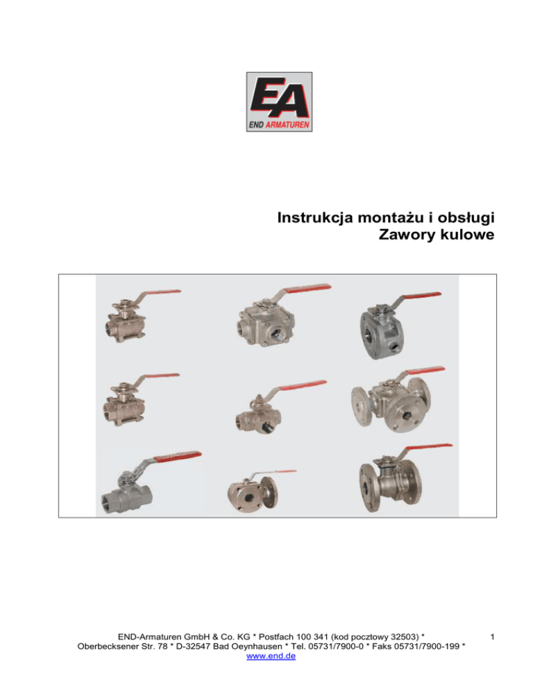 Instrukcja montażu i obsługi Zawory kulowe END-Armaturen GmbH & Co. KG * Postfach 100 341 (kod pocztowy 32503) * Oberbecksener Str. 78 * D-32547 Bad Oeynhausen * Tel. 05731/7900-0 * Faks 05731/7900-199 * www.end.de 1 Od wydawcy © END-Armaturen GmbH & Co. KG Firma END-Armaturen GmbH & Co. KG posiada prawa autorskie do tej dokumentacji. Bez zgody firmy END-Armaturen GmbH & Co. KG nie wolno tej dokumentacji zmieniać, rozszerzać, kopiować lub przekazywać osobom trzecim. W celu zamówienia tego dokumentu należy zwrócić się do firmy END-Armaturen GmbH & Co. KG. Dane w tej dokumentacji oznaczają specyfikację produktów, ale nie zapewnienie ich właściwości. Część rysunków w tej dokumentacji przedstawia opcje lub wyposażenie dodatkowe dostępne za dopłatą. END-Armaturen GmbH & Co. KG Oberbecksener Strasse 78 D-32547 Bad Oeynhausen Telefon: 05731/7900-0 Faks: 05731/7900-199 www.end.de Mail: [email protected] Data wydania: 10/10 Zmiany wzornictwa i urządzeń zastrzeżone. END-Armaturen GmbH & Co. KG * Postfach 100 341 (kod pocztowy 32503) * Oberbecksener Str. 78 * D-32547 Bad Oeynhausen * Tel. 05731/7900-0 * Faks 05731/7900-199 * www.end.de 2 Spis treści 1. Wstęp 2. 2.1. 2.2. 2.3. 2.4. 2.5. Ogólne wskazówki Ważność Kontrola przy dostawie Reklamacje Gwarancja Symbole i ich znaczenie 3. 3.1. 3.1.1. 3.1.2. 3.1.3. 3.2. Wskazówki dotyczące bezpieczeństwa Ochrona ludzi Wskazówki bezpieczeństwa dotyczące montażu Wskazówki bezpieczeństwa dotyczące ustawień / uruchomienia Wskazówki bezpieczeństwa dotyczące konserwacji / napraw Bezpieczeństwo urządzenia 4. Tabliczka znamionowa 5. Zawory kulowe 5.1. Ogólnie 5.2. Zastosowanie zgodnie z przeznaczeniem 5.3. Obsługa 5.4. Montaż / Demontaż 5.4.1. Montaż z połączeniem gwintowanym 5.4.2. Montaż z końcówkami spawanymi 5.4.2.1. Demontaż części środkowej zaworu kulowego 5.4.2.2. Końcówki spawane przyłączy 5.4.2.3. Montaż części środkowej zaworu kulowego 5.4.3. Montaż z połączeniem kołnierzowym 5.5. Konserwacja i przeglądy 5.5.1. Regulacja uszczelnienia trzpienia 5.5.2. Wymiana czopu kulowego i zestawu uszczelek 5.5.2.1. 3-częściowe zawory kulowe z końcówkami gwintowanymi lub spawanymi 5.5.2.2. Wieloczęściowe zawory kulowe kołnierzowe 6. Deklaracja zgodności w rozumieniu dyrektywy w sprawie urządzeń ciśnieniowych 97/23/WE END-Armaturen GmbH & Co. KG * Postfach 100 341 (kod pocztowy 32503) * Oberbecksener Str. 78 * D-32547 Bad Oeynhausen * Tel. 05731/7900-0 * Faks 05731/7900-199 * www.end.de 3 1. Wstęp Szanowny Kliencie / Monterze / Użytkowniku! Ta instrukcja montażu i obsługi ma przekazać konieczne informacje w celu umożliwienia szybkiego i prawidłowego montażu i ustawienia armatury i zaworów. Prosimy o staranne zapoznanie się z tą instrukcją i przestrzeganie zwłaszcza wskazówek i ostrzeżeń. Instrukcję należy starannie przechowywać na wypadek ewentualnych pytań. Armaturę i zawory mogą montować, instalować lub konserwować tylko przeszkoleni i wykwalifikowani pracownicy. Jesteśmy do Państwa dyspozycji w sprawie zapytań dotyczących armatury i zaworów. Na karcie tytułowej podajemy nasz numer telefonu. Wasza END-Armaturen GmbH & Co. KG END-Armaturen GmbH & Co. KG * Postfach 100 341 (kod pocztowy 32503) * Oberbecksener Str. 78 * D-32547 Bad Oeynhausen * Tel. 05731/7900-0 * Faks 05731/7900-199 * www.end.de 4 2. Ogólne wskazówki 2.1. Ważność Ta instrukcja montażu i obsługi dotyczy standardowych wersji armatury i zaworów oraz ich odmian. 2.2. Kontrola przy dostawie Bezpośrednio przy dostawie należy skontrolować armaturę i zawory pod kątem ewentualnych uszkodzeń transportowych i wad, a na podstawie załączonego dokumentu dostawy – ilość części. Nie pozostawić w opakowaniu żadnych części. 2.3. Reklamacje Roszczenia odszkodowawcze odnoszące się do szkód transportowych mogą być dochodzone tylko po ich niezwłocznym zgłoszeniu u przewoźnika. Dla przesyłki zwrotnej (uszkodzenia transportowe / naprawy) należy sporządzić protokół szkody i przesłać do zakładu wytwórczego części – w miarę możliwości w oryginalnym opakowaniu. Do przesyłki zwrotnej należy dołączyć następujące informacje: • nazwa i adres odbiorcy • numer rzeczowy / zamówienia / części • opis awarii. 2.4. Gwarancja Na armaturę i zawory udzielamy gwarancji zgodnie z umową kupna/sprzedaży. Obowiązują ogólne postanowienia w sprawie gwarancji i rękojmi firmy END-Armaturen GmbH & Co. KG. 2.5. Symbole i ich znaczenie Teksty oznaczone tym symbolem zawierają bardzo ważne wskazówki, między innymi również w celu niedopuszczenia do zagrożeń dla zdrowia! Koniecznie należy stosować się do tych tekstów! Teksty oznaczone tym symbolem zawierają bardzo ważne wskazówki, między innymi również w celu niedopuszczenia do szkód rzeczowych! Koniecznie należy stosować się do tych tekstów! Ten symbol wskazuje na teksty zawierające komentarze / wskazówki lub porady. Ten symbol oznacza opisy czynności, które muszą być wykonane przez Klienta. END-Armaturen GmbH & Co. KG * Postfach 100 341 (kod pocztowy 32503) * Oberbecksener Str. 78 * D-32547 Bad Oeynhausen * Tel. 05731/7900-0 * Faks 05731/7900-199 * www.end.de 5 3. Wskazówki dotyczące bezpieczeństwa W zależności od technicznych warunków i chwili montażu, ustawienia i uruchomienia armatury i zaworów trzeba mieć na uwadze odpowiednie szczególne aspekty bezpieczeństwa! W przypadku, gdy np. armatura / zawór jest zamontowany w gotowym do pracy urządzeniu chemicznym, aspekty niebezpieczeństwa przy uruchomieniu mają zupełnie inny wymiar, niż gdyby chodziło o uruchomienie do celów testowych w „suchej” części urządzenia w hali montażowej! Nie możemy znać wszystkich okoliczności chwili montażu / ustawiania / uruchomienia, dlatego w poniższych opisach zamieszczamy wskazówki o niebezpieczeństwach, które nie muszą dotyczyć konkretnego urządzenia. Należy stosować s