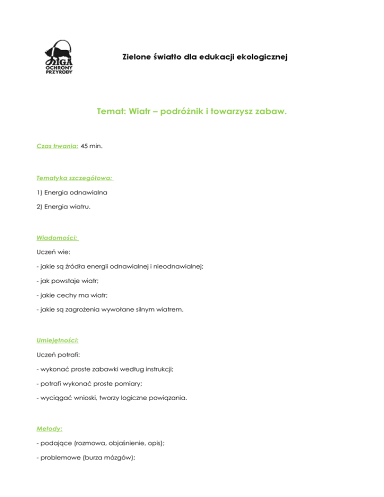 Temat: Wiatr – podróżnik i towarzysz zabaw. Czas trwania: 45 min. Tematyka szczegółowa: 1) Energia odnawialna 2) Energia wiatru. Wiadomości: Uczeń wie: - jakie są źródła energii odnawialnej i nieodnawialnej; - jak powstaje wiatr; - jakie cechy ma wiatr; - jakie są zagrożenia wywołane silnym wiatrem. Umiejętności: Uczeń potrafi: - wykonać proste zabawki według instrukcji; - potrafi wykonać proste pomiary; - wyciągać wnioski, tworzy logiczne powiązania. Metody: - podające (rozmowa, objaśnienie, opis); - problemowe (burza mózgów); - eksponujące (obserwacja, pokaz); - poszukujące (zabawa). Formy: - praca w grupach. Środki dydaktyczne: - duże opakowanie chrupek kukurydzianych; - balony lub woreczki foliowe; - ilustracje/zdjęcia wskazujące sposoby wykorzystania różnych źródeł energii; - karty pracy; - materiały do produkcji zabawek i urządzeń pomiarowych (m.in. papier, kora, druciki, pinezki, patyczki i inne w zależności od potrzeb). Miejsce zajęć: - sala lekcyjna. PRZEBIEG LEKCJI: Nauczyciel mówi dzieciom, że będą udawać roboty na baterie, symbolem baterii będzie chrupek kukurydziany (lub paluszek), dzieci dostają chrupka i jedząc go poruszają się jak roboty. Żeby mogły poruszać się cały czas, muszą co chwilę „doładowywać baterie”, czyli zjadać kolejnego chrupka (rozstawić w sali chrupki w kilku punktach). W momencie kiedy kończą się chrupki dzieci zatrzymują się. Nauczyciel mówi, że „baterie” = chrupki skończyły się i roboty już nie będą mogły funkcjonować, ale wymyślono inny model robotów, które do swojego działania potrzebują powietrza – każde dziecko dostaje balonik (lub woreczek foliowy), nadmuchuje go, chodząc wypuszcza powietrze, znowu pompuje itd. Nauczyciel po chwili przerywa zabawę i pyta, czy takie roboty też kiedyś przestaną działać, czy zabraknie im energii (powietrza)? Nie, bo powietrze się nie kończy. Nauczyciel objaśnia, że tak jest w rzeczywistości. Są takie źródła energii jak węgiel, ropa, gaz, których zasoby są ograniczone, i w miarę jak zużywa się je w elektrowniach, fabrykach itp. to ich ubywa – tak jak ubyło chrupek, aż się w końcu skończą. Ale są też takie źródła energii, które się tak szybko się nie wyczerpią: promienie słoneczne, wiatr, woda – odpowiednie urządzenia (balonik/torebka foliowa był symbolem urządzenia wykorzystującego powietrze) potrafią wykorzystać je do produkcji prądu, napędzać samochody, ogrzewać domy itd. Dodatkowo, kiedy używa się energii odnawialnej to nie powstają… (krzyżówka) zanieczyszczenia. 1. Dla króla domem jest… 2. Gdy nie było samochodów, ludzie jeździli wozami, które ciągnęły… 3. Człowiek widzi świat ponieważ ma… 4. Kot miauczy, a pies… 5. Gdy babcia Anna była małą dziewczynką, wszyscy wołali na nią zdrobniale… Człowiek potrafi wykorzystywać energię już od dawna – skąd się bierze energią, którą wykorzystują następujące urządzenia/człowiek? Nauczyciel podaje przykłady lub pokazuje ilustracje/zdjęcia, np.: wiatrak, żaglówka, balon – wiatr kalkulator na baterie słoneczne – słońce płynący kajak – woda piec – węgiel samochód, samolot, autobus – benzyna kuchenka gazowa – gaz itp. Jedną z możliwości pozyskania energii daje wiatr. Jak on powstaje? Karta pracy (KARTA PRACY 1) pokazuje jak powstaje wiatr oraz inne rodzaje energii odnawialnej. Nauczyciel dzieli dzieci na grupy: dzieci według przygotowanych przez nauczyciela prostych instrukcji (z gotowych elementów) budują proste przedmioty: urządzenia pomiarowe - wiatrowskaz, anemometr oraz zabawki z papieru (do wyboru) - wiatraczek, żaglówka, spadochron, latawiec, samolot. Następnie dzieci wykorzystując zbudowane urządzenia wykonują pomiar wiatru oraz wypróbowują zabawki (część można wykorzystać na późniejszych zajęciach, część od razu. Oczywiście trzeba zapewnić odpowiednie warunki do ich wykorzystania). W trakcie eksperymentów dzieci odpowiadają na pytania: Jakie cechy ma wiatr? Jak można opisać wiatr? Jak można go wykorzystać? Komentarz: do produkcji energii wykorzystuje się wiatraki, kiedy ich skrzydła się obracają, napędzają turbiny, które pozwalają by w innym urządzeniu powstał prąd. Nauczyciel pokazuje zdjęcia z huraganu, połamane drzewa itp. i rozmawia z dziećmi na temat „czy wiatr może być niebezpieczny?”. Nauczyciel przygotowuje zestaw zdań prawdziwych i fałszywych dotyczących przeprowadzonej lekcji, dzieci muszą odpowiednio pogrupować zdania. W zdaniach fałszywych wskazują co jest błędem. Jako zadanie na dłuższy czas można zaproponować, żeby dzieci, na wzór harcerskich zadań, zdobywały „sprawności” tematycznie związane z energią. Dzieci wspólnie projektują wzór odznaki (z możliwością powielenia dla każdego dziecka). Żeby otrzymać odznakę i tytuł muszą wykonać kilka określonych zadań, część z nich może sprawdzić nauczyciel, a niektóre może potwierdzić rodzic, np.: odznaka: ŁOWCA WIATRU Zadanie dla dziecka: Dowiedz się co to jest: bryza, halny, huragan, pasat, monsun, harmattan; odszukaj wiatrak – zrób zdjęcia lub rysunki, wykonaj samodzielnie zabawkę wykorzystującą siłę wiatru; wykonaj i podaruj komuś wiatraczek; zaobserwuj, w którym kierunku najczęściej wieją wiatry w twojej okolicy; powiedz jak należy się ubrać w wietrzny dzień; przeprowadź obserwacje w wietrzny dzień – jak wpływa wiatr na drzewa, ptaki, ludzi – opisz to lub wykonaj zdjęcia/ilustracje.