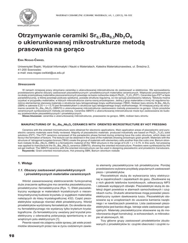 MATERIA£Y CERAMICZNE /CERAMIC MATERIALS/, 64, 1, (2012), 98-102 www.ptcer.pl/mccm Otrzymywanie ceramiki Sr0,7Ba0,3Nb2O6 o ukierunkowanej mikrostrukturze metodą prasowania na gorąco EWA NOGAS-ûWIKIEL Uniwersytet ĝląski, Wydziaá Informatyki i Nauki o Materiaáach, Katedra Materiaáoznawstwa, ul. ĝnieĪna 2, 41-200 Sosnowiec e-mail: [email protected] Streszczenie W ramach niniejszej pracy otrzymano ceramikĊ o ukierunkowanej mikrostrukturze do zastosowaĔ w elektronice. We wprowadzeniu przedstawiono gáówne obszary zastosowaĔ piezoelektrycznych i piroelektrycznych materiaáów ceramicznych. WiĊkszoĞü produkowanych na skalĊ przemysáową materiaáów piezoceramicznych powstaje na bazie roztworów staáych Pb(Zr1-xTix)O3 (PZT). Ceramika typu PZT w fazie paraelektrycznej, w której powstaje podczas spiekania, posiada strukturĊ regularną, co nie sprzyja powstawaniu tekstury. TeksturĊ moĪna uzyskaü w przypadku materiaáów, w których mikrostrukturze ziarna rosną anizotropowo. Jedną z grup materiaáów o innej niĪ regularna komórce elementarnej stanowią materiaáy o strukturze typu tetragonalnego brązu wolframowego (TBW). Niobian baru strontu SrxBa1-xNb2O6 (SBN) w zakresie 0,25 < x < 0,75 jest ferroelektrykiem o strukturze typu tetragonalnego brązu wolframowego. W niniejszej pracy do otrzymania ceramiki Sr0,7Ba0,3Nb2O6 (SBN70) o ukierunkowanej mikrostrukturze zastosowano metodĊ prasowania na gorąco. UĪyto proszków ceramicznych syntezowanych metodą zol-Īelową. Ceramika SBN70 o ukierunkowanej mikrostrukturze moĪe byü zastosowana do budowy przetworników piezoelektrycznych i piroelektrycznych. Sáowa kluczowe: ceramika o ukierunkowanej mikrostrukturze, prasowanie na gorąco, SBN, niobian baru strontu MANUFACTURING OF Sr0.7Ba0.3Nb2O6 CERAMICS WITH ORIENTED MICROSTRUCTURE BY HOT PRESSING Ceramics with the oriented microstructure were obtained for electronic applications. Main application areas of piezoelectric and pyroelectric ceramic materials were ¿rstly reviewed. Majority of piezoelectric materials produced industrially are based on Pb(Zr1-xTix)O3 solid solutions (PZT). The PZT ceramics composed of the paraelectric phase formed during sintering have the cubic structure, which does not favour the formation of texture. The texture can be obtained in the case of the materials showing anisotropic grain growth. Materials with the structure of tetragonal tungsten bronze (TBW) create the group of materials with elementary cells another than the cubic one. Barium strontium niobate SrxBa1-xNb2O6 (SBN) is a ferroelectric material of the TBW structure in the range of 0.25 < x < 0.75. In this work, hot pressing was applied to manufacture the Sr0.7Ba0.3Nb2O6 ceramics (SBN70), showing the oriented microstructure. Powders were synthesized by the sol-gel method. The SBN70 ceramics with the oriented microstructure can be used in designing piezoelectric and piroelectric transducers. Keywords: Grain-oriented microstructure, Hot pressing SBN, Barium strontium niobate 1. WstĊp 1.1. Obszary zastosowaĔ piezoelektrycznych i piroelektrycznych materiaáów ceramicznych WĞród zaawansowanej elektroceramiki funkcjonalnej duĪe znaczenie aplikacyjne ma ceramika piezoelektryczna, piroelektryczna i ferroelektryczna (Rys. 1). Efekt piezoelektryczny wystĊpuje w materiaáach krystalicznych o niecentrosymetrycznej budowie krysztaáu (z wyjątkiem materiaáów naleĪących do klasy krystalogra¿cznej 432). CzĊĞü piezoelektryków wykazuje równieĪ efekt piroelektryczny. WĞród piroelektryków wyróĪniamy ferroelektryki. Do okreĞlenia stanu ferroelektrycznego nie wystarczy tylko kryterium krystalogra¿czne. Za ferroelektryczny uwaĪany jest krysztaá piroelektryczny z odwracalną polaryzacją spontaniczną w zewnĊtrznym polu elektrycznym [1]. Pewnie nawet nie zdajemy sobie sprawy, jak wiele przedmiotów stosowanych przez nas w Īyciu codziennym zawie- 98 ra elementy piezoelektryczne lub piroelektryczne. PoniĪej przedstawiono wybrane przykáady popularnych zastosowaĔ piezo- i piroelektryków. Piezoelektryki sáuĪą do wytwarzania iskry elektrycznej w zapalniczkach i zapalarkach do gazu. Zbudowane są z nich gáoĞniki telefonów komórkowych, odtwarzaczy MP3 i zabawek wydających dĨwiĊki. Piezoelektryki sáuĪą do detekcji drgaĔ powietrza w alarmach samochodowych i czujnikach ruchu. Drukarki atramentowe mogą posiadaü piezoelektryczny system dawkowania tuszu. Piezoelektryki stosowane są w urządzeniach do usuwania kamienia nazĊbnego i w nawilĪaczach powietrza. Lista zastosowaĔ piezoelektryków jest bardzo dáuga. Istnieje wiele zastosowaĔ specjalnych. Materiaáy piezoelektryczne stosowane są do monitorowania drgaĔ konstrukcji, w echosondach, w mikroskopie siá atomowych, itd. Trzy gáówne grupy zastosowaĔ pirodetektorów zbudowanych z piroelektryków to: czujniki obecnoĞci i czujniki ru- OTRZYMYWANIE CERAMIKI Sr0,7Ba0,3Nb2O6 O UKIERUNKOWANEJ MIKROSTRUKTURZE METODĄ PRASOWANIA NA GORĄCO PYROELECTRIC MATERIALS KRYSZTAàY 32 klasy krystalograficzne (grupy punktowe): 11 centrosymetrycznych i 21 niecentrosymetrycznych PIEZOELEKTRYKI 20 niecentrosymetrycznych klas krystalograficznych: 1 ,2, m, 2mm, 222, 4, 4, 42m, 4mm, 422, 3, 3m, 322, 6, 6m2, 6, 6mm, 622, 23, 43m PIROELEKTRYKI 10 niecentrosymetrycznych klas krystalograficznych : 1, 2, m, mm2, 4, 4mm, 3, 3m, 6, 6mm FERROELEKTRYKI University of Silesia x Department of Materials Science x Division of Functional Electroceramics x Sosnowiec x Poland Rys. 1. Miejsce piezoelektryków, piroelektryków i ferroelektryków w rodzinie krysztaáów. Fig. 1. Location of piezoelectrics, pyroelectrics and ferroelectrics in family of crystals. chu, przyrządy do bezkontaktowych pomiarów temperatury oraz termogramy. Przy pomocy przyrządów do bezkontaktowych pomiarów temperatury moĪna bezstresowo oceniü gorączkĊ dziecka, moĪna teĪ wykonaü pomiary temperatury obiektów znajdujących siĊ w duĪej odlegáoĞci, poruszających siĊ, sk
