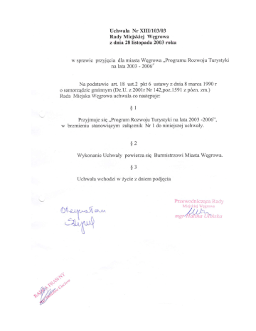 Załącznik Nr 1. Program rozwoju turystyki Miasta Węgrowa na lata 2003 – 2006 _________________________Węgrów, listopad 2003 r.________________________ Spis treści: 1. Wstęp ........................................................................................ str.3 2. Ogólna charakterystyka miasta Węgrowa ................................... str.4 3. Diagnoza aktualnego stanu turystyki wraz z wpływającym na nią otoczeniem gospodarczym, społecznym i infrastrukturalnym .... str.4 4. Główne priorytety i cele oraz sposoby ich realizowania ............................................................................... str.7 Chcemy zapewnić turystom i gościom odwiedzającym Węgrów i okolice miłe spędzenie czasu w naszych gospodarstwach i ośrodkach, wśród bogatych lasów, czystych rzek i zbiorników wodnych, tak aby corocznie wracali do nas z sentymentem. I. Wstęp Celem niniejszego opracowania jest sformułowanie „Programu Rozwoju Turystyki miasta Węgrowa do 2006 roku” Program ten stanowi część ogólnej strategii rozwoju miasta Węgrowa. Gospodarka turystyczna staje się jedną z największych gałęzi gospodarki nie tylko w Polsce, ale i na całym świecie. Wpływy z podróży stanowią dziś prawie 13% światowych wpływów z eksportu, a wartość inwestycji związanych z podróżami i turystyką ponad 9% wszystkich inwestycji na świecie. Turystyka i podróże mają ogromny wpływ na dochody budżetu państw, miast, gmin itp. Dlatego też chcemy aby i Węgrów stał się ośrodkiem wypoczynkowym i rekreacyjnym województwa mazowieckiego. Program działań rozwoju turystki na lata 2003 – 2006 będzie się koncentrować wokół następujących celów strategicznych: 1. Upowszechnianie wizerunku Węgrowa jako miasta atrakcyjnego turystycznie pod względem kulturowym i przyrodniczym. 2. Stworzenie systemu promocji turystycznej na szczeblu lokalnym i regionalnym oraz rozwój produktu turystycznego. 3. Stworzenie podstaw i zasad funkcjonowania nowoczesnego systemu informacji turystycznej. II. Ogólna charakterystyka miasta Węgrów. Węgrów jest jednym z najstarszych miast województwa mazowieckiego. Pierwsza osada powstała na skrzyżowaniu ważnych szlaków handlowych ze wschodu na zachód i z północy na południe – na prawym brzegu rzeki Liwiec. W 1441 roku książę mazowiecki Bolesław IV nadał osadzie prawa miejskie. Z historią Węgrowa związane są dzieje słynnych rodów m.in. Radziwiłłów, Kiszków, Krasińskich. Obecnie Węgrów to trzynastotysięczne miasto położone w środkowo – wschodniej części województwa mazowieckiego, leży ok. 80 km na wschód od Warszawy. Powierzchnia miasta wynosi 35 km2. Miasto nasze jest członkiem Związku Miast Polskich oraz Związku Powiatów i Gmin Nadbużańskich. Wskutek reformy administracyjnej państwa w 1998 roku, Węgrów ponownie stał się miastem powiatowym. W mieście mają siedzibę wszystkie urzędy i instytucje niezbędne do funkcjonowania jako ośrodka powiatowego. Węgrów jest prężnym ośrodkiem administracyjnym, oświatowym, kulturalnym i gospodarczym regionu. III. Diagnoza aktualnego stanu turystyki wraz z wpływającym na nią otoczeniem gospodarczym, społecznym i infrastrukturalnym. Węgrów jako jedno z najstarszych miast województwa mazowieckiego ma bardzo atrakcyjne położenie geograficzne. Leży w ciągu drogi krajowej nr 62 Strzelno – Drohiczyn oraz drogi wojewódzkiej nr 637 Warszawa – Węgrów. Węgrów znajduje się w środkowo- wschodniej części województwa mazowieckiego. Położony jest w obrębie tzw. „Niecki Mazowieckiej”, w otulinie rzeki Liwiec i prawego dopływu Bugu. Miasto leży w odległości ok. 80 km na wschód od Warszawy, przy ważnym szlaku komunikacyjnym łączącym stolicę Polski z Drohiczynem, przy trasie na Siedlce oraz do Wyszkowa nad Bugiem. Naturalnym powiązanie między obszarem siedleckim i Doliną Dolnego Bugu jest Dolina Liwca – między Węgrowem, a Łochowem – sklasyfikowana w systemie ECONET – PL, jako korytarz ekologiczny o znaczeniu krajowym, aktualnie nie objęta prawna formą ochrony. Na zasoby środowiska przyrodniczego w Węgrowie składają się: - rzeźba i krajobraz, - zasoby wodne, - szata roślinna, - klimat lokalny Najcenniejszymi kompleksami krajobrazowymi Węgrowa są doliny rzek: Liwca, Czerwonki i Ady, które mają decydujący wpływ na strukturę przestrzenną miasta, na warunki klimatu lokalnego oraz są elementem systemu wymiany i regeneracji powietrza w centralnej części Węgrowa. Jedną z ważnych dziedzin, która może przyczynić się do rozwoju miasta jest turystyka. Na rozwój turystyki oraz wypoczynku wskazuje m,in. ulokowanie miasta w obszarze Zielonych Płuc Polski oraz w otulinie Nadbużańskiego Parku Narodowego. Okolice Węgrowa zachowały w wielu miejscach nietkniętą cywilizację, a więc nieskażone środowisko, naturalne krajobrazy i świeże powietrze. Nie brakuje w okolicach lasów, zaś rzeka Liwiec przepływająca przez Węgrów jest stosunkowo czysta. Atrakcyjne położenie Węgrowa (niedaleko stolicy Polski oraz granicy wschodniej, a także od trasy Berlin – Moskwa) daje predyspozycje do rozwoju przemysłu i rynków zbytu. Dlatego też potencjalni inwestorzy, zainteresowani możliwościami inwestowania znajda w Węgrowie odpowiednie warunki. Teren miasta Węgrowa charakteryzuje mnogość zabytków kultury materialnej i niematerialnej. Szczególną role odgrywają też zabytki architektury: Bazylika Mniejsza – Kościół z XVIII w. pod wezwaniem Wniebowzięcia Najświętszej Marii Panny oraz Świętych Piotra, Pawła, Andrzeja i Katarzyny. Usytuowany jest przy wschodniej pierzei rynku, Zespół Poreformacki z XVIII w – złożony z klasztoru, budynków browaru i tkalni oraz otaczającego je muru, położony przy ulicy Kościuszki, Kościół Ewangelicko – Augsburski pod wezwaniem św. Trójcy oraz zabytkowy Kościółek na cmentarzu z XVII w - położony przy ulicy Narutowic