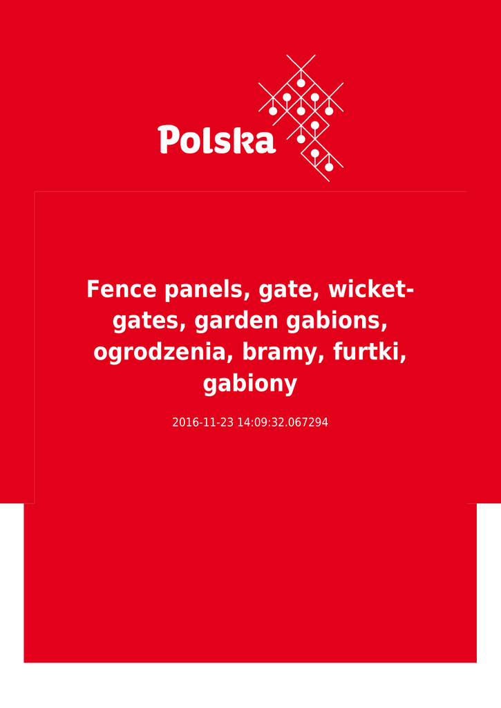 Fence panels, gate, wicketgates, garden gabions, ogrodzenia, bramy, furtki, gabiony 2016-11-23 14:09:32.067294 2 3 Ta oferta nie stanowi informacji handlowej Adres instytucji/firmy ogłaszającej ofertę Firma Fischer 97-215 Inowłódz (wieś), Ul. Spalska 25 , Polska Osoba kontaktowa Martyna Rybak [email protected] Tel: www.ogrodzeniafischer.com.plwww.karniszefischer.com.pl Opis przedmiotu zamówienia We offer two types of fence panels: INDUSTRIAL and FORTE. Fence panels have a form of mats welded from vertical and horizontal bars of 4 mm, 5 mm, 6 mm and 8 mm diameter, depending on the model. They have different technical parameters enabling the optimal selection of a fence model for particular applications in order to meet our clients’ requirements. An obvious complement to a fencing is a gate and wicket. We recommend double-leaf and slide gates (self-supported) filled with a panel or closed profile. What distinguishes our company is an individual approach to our clients’ needs. Apart from standard fencing elements, we can also provide tailormade fences and gates according to technical specifications presented by the client. CPV ● ● Konstrukcje i materiały budowlane', 'wyroby pomocnicze dla budownictwa (z wyjątkiem aparatury elektrycznej) Materiały konstrukcyjne i elementy podobne 4 ● ● Wyroby konstrukcyjne Różne produkty gotowe i elementy z nimi związane Załączniki 20.jpg 66.jpg 17.jpg Typ oferty Sprzedaż Termin składania ofert 01.05.2017 Ważna od 23.11.2016 5 Branże Produkcja metalowych wyrobów gotowych Nabywcy poza granicami kraju NIE 6
