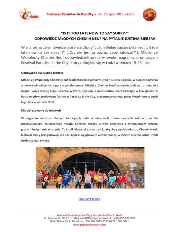 Festiwal Paradise in the City • 19 - 25 lipca 2016 • Łódź "IS IT TOO LATE NOW TO SAY SORRY?" ODPOWIEDŹ MŁODYCH CHEMIN NEUF NA PYTANIE JUSTINA BIEBERA W znanej na całym świecie piosence „Sorry” Justin Bieber zadaje pytanie: „Is it too late now to say sorry ?” („Czy nie jest za poźno, żeby żałować?”). Młodzi ze Wspólnoty Chemin Neuf odpowiedzieli na nie w swoim nagraniu, promującym Festiwal Paradise in the City, który odbędzie się w Łodzi w dniach 19-25 lipca. Odpowiedź dla Justina Biebera Młodzi ze Wspólnoty Chemin Neuf zaadaptowali oryginalny utwór Justina Biebera. W swoim nagraniu amerykański piosenkarz pyta o przebaczenie. Młodzi z Chemin Neuf odpowiedzieli na to pytanie i nagrali swoją wersję klipu Biebera, w której śpiewają o miłosierdziu, wprowadzając w ten sposób w hasło międzynarodowego festiwalu Paradise in the City, przygotowywanego przez Wspólnotę w Łodzi tego lata w ramach ŚDM. Klip adresowany do młodych W nagraniu widzimy młodych tańczących ludzi, w ubraniach o intensywnych kolorach, na tle przemysłowego, zniszczonego miasta. Kontrast między surową dekoracją a dynamicznym tańcem grupy młodych robi wrażenie. To środki do przekazania treści, jaką chcą wysłać młodzi z Chemin Neuf: festiwal, który przygotowują w Łodzi będzie wyjątkowym wydarzeniem, w którym weźmie udział 7000 osób z całego świata. OBEJRZYJ TERAZ Festiwal Paradise in the City | Wspólnota Chemin Neuf ul. Jaracza 11, 90-261 Łódź | [email protected] | +48/602-139-339 Getin Noble Bank SA, r-k nr: 79 1560 0013 2353 6772 1000 0011 www.paradiseinthecity.com Festiwal Paradise in the City • 19 - 25 lipca 2016 • Łódź Organizatorzy: Patroni honorowi: Partnerzy: Festiwal Paradise in the City | Wspólnota Chemin Neuf ul. Jaracza 11, 90-261 Łódź | [email protected] | +48/602-139-339 Getin Noble Bank SA, r-k nr: 79 1560 0013 2353 6772 1000 0011 www.paradiseinthecity.com