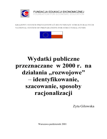 KRAJOWY SYSTEM PRZYGOTOWAŃ DO FUNDUSZY STRUKTURALNYCH NATIONAL SYSTEM OF PREPARATIONS FOR STRUCTURAL FUNDS Wydatki publiczne przeznaczane w 2000 r. na działania „rozwojowe” – identyfikowanie, szacowanie, sposoby racjonalizacji Zyta Gilowska Warszawa październik 2001 Ekspertyza przygotowana przez Fundację Edukacji Ekonomicznej w ramach Krajowego Systemu Przygotowań do Funduszy Strukturalnych. Więcej informacji na stronie www.europa.edu.pl. Spis treści: I. Założenia metodologiczne 1.1. Zakres analizy 1.2. Kryteria identyfikacyjne 1.3. Technika analizy II. Wydatki budżetu państwa 2.1. Analiza układu funkcjonalnego 2.2. Analiza według podstawowych grup wydatków 2.3. Wyniki analizy wydatków budżetu państwa III. Wydatki państwowych funduszy celowych 3.1. Centralny Fundusz Ochrony Gruntów Rolnych 3.2. Narodowy Fundusz Ochrony Środowiska i Gospodarki Wodnej 3.3. Fundusz Pracy 3.4. Fundusz Gwarantowanych Świadczeń Pracowniczych 3.5. Państwowy Fundusz Rehabilitacji Osób Niepełnosprawnych 3.6. Fundusz Promocji Twórczości 3.7. Centralny Fundusz Gospodarki Zasobem Geodezyjnym 3.8. Wynik analizy państwowych funduszy celowych IV. Wydatki jednostek samorządu terytorialnego 4.1. Wydatki gmin 4.2. Wydatki powiatów 4.3. Wydatki miast na prawach powiatów 4.3. Wydatki województw 4.4. Samorządowe fundusze celowe 4.5. Wynik analizy wydatków jednostek samorządu terytorialnego V. Inne wydatki publiczne VI. Wynik analizy wydatków publicznych VII. Struktury publicznych wydatków rozwojowych 7.1. Wydatki rozwojowe budżetu państwa w rolnictwie i poza rolnictwem 7.2. Inne centralne publiczne wydatki rozwojowe 7.3. Terenowe publiczne wydatki rozwojowe w rolnictwie i poza rolnictwem 7.4. Publiczne wydatki rozwojowe w rolnictwie i poza rolnictwem VIII. Swoboda alokacyjna publicznych wydatków rozwojowych 8.1. Publiczne wydatki rozwojowe według grup wydatków 8.2. Wydatki majątkowe w publicznych wydatkach rozwojowych 8.3. Dotacje w publicznych wydatkach rozwojowych IX. Podsumowanie 9.1. Konkluzje 9.2. Rekomendacje Fundacja Edukacji Ekonomicznej Aleje Jerozolimskie 30 II p. 00-024 Warszawa tel./fax: +48 (22) 828 06 71, 8284421/22 e-mail: [email protected] 2 Ekspertyza przygotowana przez Fundację Edukacji Ekonomicznej w ramach Krajowego Systemu Przygotowań do Funduszy Strukturalnych. Więcej informacji na stronie www.europa.edu.pl. I. Założenia metodologiczne Przedmiotem ekspertyzy jest oszacowanie łącznej kwoty tej części wydatków publicznych w Polsce, która może być identyfikowana jako „bezpośrednio wpływająca na procesy rozwoju społeczno-gospodarczego”. Podjęcie próby dokonania kompleksowej oceny pro-rozwojowej, instytucjonalnej i proceduralnej „wydajności” polskiego systemu finansów publicznych, wymaga uprzedniego oszacowania poziomu oraz struktury środków publicznych wydatkowanych w Polsce na wspieranie procesów rozwoju społeczno-gospodarczego. 1.1. Zakres analizy Ponieważ obowiązująca klasyfikacja wydatków publicznych w żadnej podziałce nie odnosi się wprost do „działań rozwojowych”, to wykonanie postawionego w niniejszej ekspertyzie zadania wymaga przyjęcia założeń umożliwiających przeprowadzenie dochodzeń statystycznych. Założenie kompleksowego rozważania wydatków publicznych przeznaczanych w Polsce na działania „rozwojowe” oznacza konieczność objęcia analizą następujących instytucji: 1) budżet państwa, 2) państwowe fundusze celowe, 3) budżety jednostek samorządu terytorialnego, 4) samorządowe fundusze celowe, 5) wojewódzkie fundusze ochrony środowiska i gospodarki wodnej. Analiza jest przeprowadzona oddzielnie dla powyżej wskazanych instytucji, począwszy od wydatków centralnych (ujmowanych w planach finansowych instytucji wymienionych w pkt 1 – 3), poprzez wydatki lokalne i regionalne (ujmowane w planach instytucji wymienionych w pkt 4 – 5). 1.2. Kryteria identyfikacyjne Z powodu braku jednoznacznych kryteriów klasyfikacyjnych, pozwalających na stosunkowo łatwe „wyszukiwanie” wydatków publicznych przeznaczanych na działania „rozwojowe”, a także z powodu nieostrości pojęcia „rozwojowy”, konieczne jest aprioryczne przyjęcie założeń o stosowanych kryteriach identyfikacyjnych. Jeżeli nie ma pewności, ani też zgody co do wydatków uważanych za „rozwojowe”, to nieuniknione jest nieco intuicyjne ich identyfikowanie. W niniejszej ekspertyzie przyjęto następujące założenia w tej sprawie: 1) wydatki przeznaczane na działania „rozwojowe” – dalej określane skrótem „wydatki rozwojowe” – mogą być kwalifikowane w dwóch, metodologicznie odmiennych obszarach; 2) obszar pierwszy dotyczy „prorozwojowych” działań pośrednich, niezbędnych do „zaistnienia” procesów rozwojowych, zwłaszcza w sferze gospodarczej, i skupia się na inwestycjach infrastrukturalnych (infrastruktura techniczna, drogowa, komunikacyjna, komunalna) o charakterze „pre-ekonomicznym”; Fundacja Edukacji Ekonomicznej Aleje Jerozolimskie 30 II p. 00-024 Warszawa tel./fax: +48 (22) 828 06 71, 8284421/22 e-mail: [email protected] 3 Ekspertyza przygotowana przez Fundację Edukacji Ekonomicznej w ramach Krajowego Systemu Przygotowań do Funduszy Strukturalnych. Więcej informacji na stronie www.europa.edu.pl. 3) 4) 5) 6) 7) obszar drugi dotyczy „prorozwojowych” działań bezpośrednich, nakierowanych na stymulowanie już trwających procesów rozwojowych, i skupia się na udzielaniu pomocy publicznej podmiotom gospodarczym obszar pierwszy może być interpretowany jako szeroka ingerencja władz publicznych w rozwój infrastruktury i obejmować nie tylko inwestycje wymienione powyżej (pkt 2) lecz również wydatki w sferze infrastruktury edukacyjnej szczebla wyższego – wówczas do identyfikowanej puli powinny być włączone wydatki publiczne ponoszone na utrzymywanie i rozwój państwowych szkół wyższych oraz państwowych placówek badawczo-rozwojowych; wszystkie wy