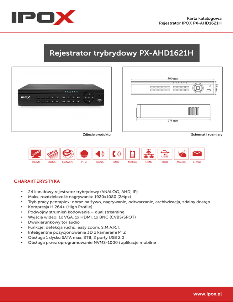 Karta katalogowa Rejestrator IPOX PX-AHD1621H Rejestrator trybrydowy PX-AHD1621H Zdjęcie produktu Schemat i rozmiary CHARAKTERYSTYKA • • • • • • • • • • • 24 kanałowy rejestrator trybrydowy (ANALOG, AHD, IP) Maks. rozdzielczość nagrywania: 1920x1080 (2Mpx) Tryb pracy pentaplex: obraz na żywo, nagrywanie, odtwarzanie, archiwizacja, zdalny dostęp Kompresja H.264+ (High Profile) Podwójny strumień kodowania – dual streaming Wyjścia wideo: 1x VGA, 1x HDMI, 1x BNC (CVBS/SPOT) Dwukierunkowy tor audio Funkcje: detekcja ruchu, easy zoom, S.M.A.R.T. Inteligentne pozycjonowanie 3D z kamerami PTZ Obsługa 1 dysku SATA max. 8TB, 2 porty USB 2.0 Obsługa przez oprogramowanie NVMS-1000 i aplikacje mobilne www.ipox.pl Karta katalogowa Rejestrator IPOX PX-AHD1621H SPECYFIKACJA TECHNICZNA PX-AHD2908EA System Procesor Cortex A9 System operacyjny Linux Tryb pracy Pentaplex Wideo Obsługa kamer 16x AHD / ANALOG + 8x IP Liczba wejść 16x BNC Wyjście 1x HDMI, 1x VGA, 1x BNC (CVBS/SPOT) Audio Kompresja G.711 Dwukierunkowy tor Tak (pierwszy kanał) Wejście 1x RCA Wyjście 1x RCA Wyświetlanie Podział ekranu 1/4/6/8/13/16/25 Rozdzielczość ekranu 1920×1080, 1280×1024, 1280×720, 1024×768, 800×600 Sekwencja Tak OSD Nazwa kamery, czas, zanik wideo, blokada kamery, detekcja ruchu, nagrywanie Język interfejsu angielski, arabski, chiński, chiński uproszczony, czeski, francuski, hiszpański, holenderski, indonezyjski, litewski, niemiecki, norweski, polski, portugalski, rosyjski, słoweński, turecki, węgierski, wietnamski, włoski Nagrywanie Kompresja H.264+ (High Profile) Prędkość i rozdzielczość (na kanał) 12 kl/s @ 2048 × 1536 (3Mpx - IP) 25 kl/s @ 1920 × 1080 (2Mpx - IP) 25 kl/s @ 1280 × 720 (1Mpx - IP) 12 kl/s @ 1920 × 1080 (2Mpx - AHD) 25 kl/s @ 960 × 1080 (1Mpx - AHD) 25 kl/s @ 1280 × 720 (1Mpx - AHD) 25 kl/s @ 960 × 576 (960H) 25 kl/s @ 704 × 576 (D1) 25 kl/s @ 352 × 288 (CIF) Strumienie Zapis strumienia głównego Analog: 400kl/s (960H/D1/CIF) Zapis strumienia głównego AHD: 200kl/s (1080p), 400kl/s (1080p LITE/720p) Zapis strumienia głównego IP: 100kl/s (3Mpx), 200kl/s (1080p/720p) Zapis extra strumienia: 400kl/s (CIF) Bitrate 768Kbps ~ 8Mbpsps (na kanał), wej. 24Mbps, wyj. 24Mbps (dla kamer IP) Jakość nagrań CBR, VBR (1 ~ 6 poziomów) Tryby nagrań Ręczne, Czasowy, Ruch Detekcja, strefy prywatności i alarm Wyzwalanie zdarzeń Nagrywanie, PTZ, Trasa, Email, FTP, Buzzer i komunikaty ekranowe Detekcja Ruchu 396 stref (22x18) Czułość detekcji 1~6 Strefy prywatności Definiowalne 4 strefy detekcji na każdym kanale Archiwizacja i odtwarzanie Odtwarzanie 16 kanałów analogowych / AHD lub 1 kanał IP Tryb szukania Czas / data / kalendarz, wydarzenia Funkcje odtwarzania Odtwarzanie, wstrzymanie, przewijanie do przodu i do tyłu, cyfrowy zoom Archiwizacja USB / wewnętrzny dysk HDD / ściąganie przez sieć Tryb zapisu Ręczny, ciągły, detekcji ruchu, alarmowy www.ipox.pl Karta katalogowa Rejestrator IPOX PX-AHD1621H Sieć Ethernet 1x RJ45 10/100 Base-T Obsługiwane protokoły ONVIF, HTTP, TCP/IP, IPv4, IPv6, UPNP, UDP, SMTP, NTP, DHCP, DNS, IP Filter, PPPoE, DDNS, FTP Max. liczba użytkowników 10 (jednocześnie) Zdalne sterowanie CMS (NVMS1000), www (IE, Fx), urządzenia mobilne iOS; Android (SuperLivePlus) Dyski HDD Obsługa 1x SATA (max. 8TB), odczyt technologii S.M.A.R.T. Zarządzanie Hibernacja, wykrywanie błędów Dodatkowe porty USB 2x (ver. 2.0) RS485 1x (PTZ/klawiatura) Pozostałe Zasilanie DC 12V Pobór prądu <8W (bez HDD) Wilgotność 10 ~ 90% Temperatura pracy -10°C ~ 50°C Wymiary 300x275x65mm www.ipox.pl