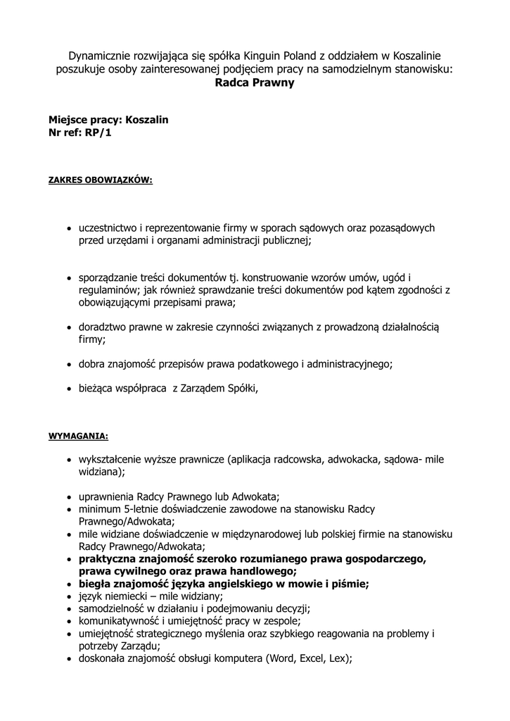 Dynamicznie rozwijająca się spółka Kinguin Poland z oddziałem w Koszalinie poszukuje osoby zainteresowanej podjęciem pracy na samodzielnym stanowisku: Radca Prawny Miejsce pracy: Koszalin Nr ref: RP/1 ZAKRES OBOWIĄZKÓW: uczestnictwo i reprezentowanie firmy w sporach sądowych oraz pozasądowych przed urzędami i organami administracji publicznej; sporządzanie treści dokumentów tj. konstruowanie wzorów umów, ugód i regulaminów; jak również sprawdzanie treści dokumentów pod kątem zgodności z obowiązującymi przepisami prawa; doradztwo prawne w zakresie czynności związanych z prowadzoną działalnością firmy; dobra znajomość przepisów prawa podatkowego i administracyjnego; bieżąca współpraca z Zarządem Spółki, WYMAGANIA: wykształcenie wyższe prawnicze (aplikacja radcowska, adwokacka, sądowa- mile widziana); uprawnienia Radcy Prawnego lub Adwokata; minimum 5-letnie doświadczenie zawodowe na stanowisku Radcy Prawnego/Adwokata; mile widziane doświadczenie w międzynarodowej lub polskiej firmie na stanowisku Radcy Prawnego/Adwokata; praktyczna znajomość szeroko rozumianego prawa gospodarczego, prawa cywilnego oraz prawa handlowego; biegła znajomość języka angielskiego w mowie i piśmie; język niemiecki – mile widziany; samodzielność w działaniu i podejmowaniu decyzji; komunikatywność i umiejętność pracy w zespole; umiejętność strategicznego myślenia oraz szybkiego reagowania na problemy i potrzeby Zarządu; doskonała znajomość obsługi komputera (Word, Excel, Lex); prawo jazdy kat. B; OFERUJEMY: stabilne i atrakcyjne warunki zatrudnienia w oparciu o umowę o pracę (wynagrodzenie adekwatne do posiadanych umiejętności); pracę w rozwijającej się, renomowanej, międzynarodowej firmie; doskonałą możliwość zdobywania nowych doświadczeń i rozwoju zawodowego; możliwość uczestniczenia w ciekawych projektach o zasięgu krajowym i międzynarodowym; WYMAGANE DOKUMENTY: CV + list motywacyjny Kandydaci spełniający powyższe wymagania i zainteresowani współpracą z naszą firmą proszeni są o przesłanie aplikacji wraz z ze zgodą na przetwarzanie danych osobowych na adres: [email protected] Prosimy o zamieszczenie w dokumentach aplikacyjnych następującego oświadczenia: „Wyrażam zgodę na przetwarzanie moich danych osobowych zawartych w mojej ofercie pracy przez Kinguin Poland Sp. z o.o. z siedzibą w Warszawie, dla potrzeb niezbędnych do realizacji procesu rekrutacji zgodnie z ustawą z 29.08.1997 o ochronie danych osobowych Dz. U. z 2014 r. poz. 1182 z późn. zm. Informuję, że niniejsza zgoda obejmuje aktualną rekrutację, jak i wszystkie kolejne prowadzone przez Kinguin Poland Sp. z o.o. .” Oferty w których kandydat nie wyrazi zgody na przetwarzanie przez Kinguin Poland Sp. z o.o., danych osobowych w celach rekrutacyjnych nie będą rozpatrywane. Prosimy o wpisanie numeru referencyjnego w tytule maila: Nr ref: RP/1 Uprzejmie informujemy, że skontaktujemy się tylko z wybranymi kandydatami.