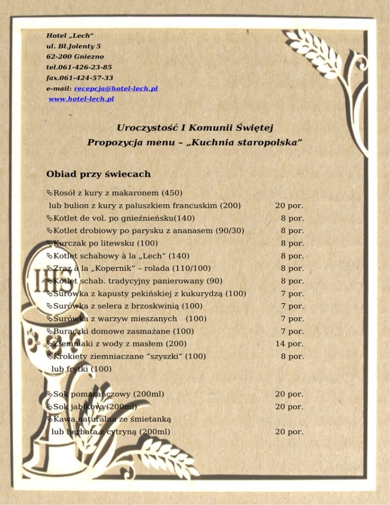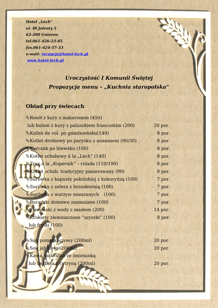 Propozycja menu - Hotel Lech, Hotel Gniezno