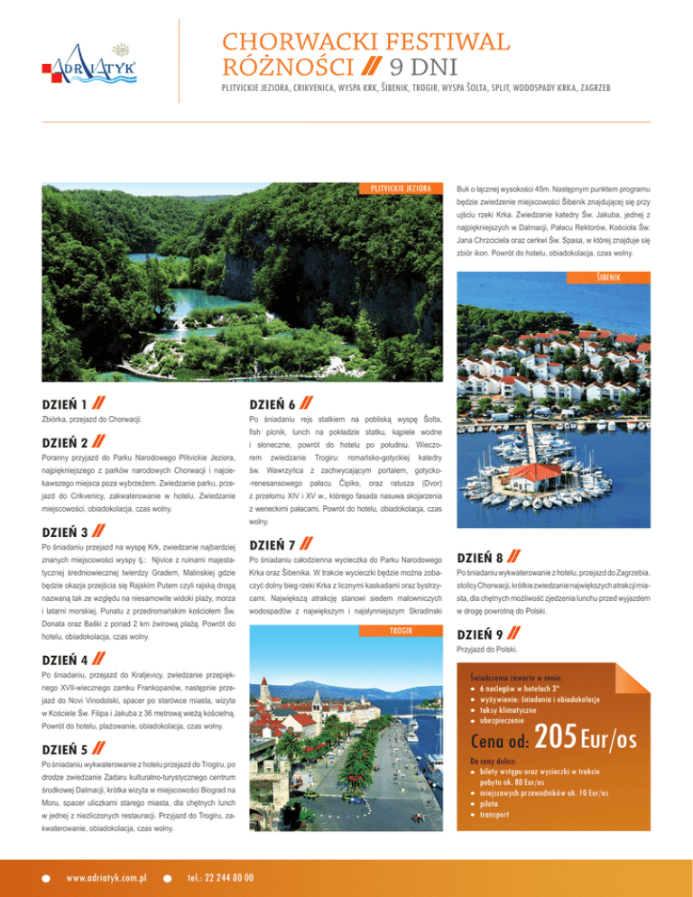 CHORWACKI FESTIWAL RÓŻNOŚCI 9 DNI PLITVICKIE JEZIORA, CRIKVENICA, WYSPA KRK, ŠIBENIK, TROGIR, WYSPA ŠOLTA, SPLIT, WODOSPADY KRKA, ZAGRZEB PLITVICKIE JEZIORA Buk o łącznej wysokości 45m. Następnym punktem programu będzie zwiedzenie miejscowości Šibenik znajdującej się przy ujściu rzeki Krka. Zwiedzanie katedry Św. Jakuba, jednej z najpiękniejszych w Dalmacji, Pałacu Rektorów, Kościoła Św. Jana Chrzciciela oraz cerkwi Św. Spasa, w której znajduje się zbiór ikon. Powrót do hotelu, obiadokolacja, czas wolny. ŠIBENIK DZIEŃ 1 DZIEŃ 6 Zbiórka, przejazd do Chorwacji. Po śniadaniu rejs statkiem na pobliską wyspę Šolta, fish picnik, lunch na pokładzie statku, kąpiele wodne DZIEŃ 2 i słoneczne, powrót do hotelu po południu. Wieczo- Poranny przyjazd do Parku Narodowego Plitvickie Jeziora, rem najpiękniejszego z parków narodowych Chorwacji i najcie- św. Wawrzyńca z zachwycającym portalem, gotycko- zwiedzanie Trogiru: romańsko-gotyckiej katedry kawszego miejsca poza wybrzeżem. Zwiedzanie parku, prze- -renesansowego pałacu Čipiko, oraz ratusza (Dvor) jazd do Crikvenicy, zakwaterowanie w hotelu. Zwiedzanie z przełomu XIV i XV w., którego fasada nasuwa skojarzenia miejscowości, obiadokolacja, czas wolny. z weneckimi pałacami. Powrót do hotelu, obiadokolacja, czas wolny. DZIEŃ 3 Po śniadaniu przejazd na wyspę Krk, zwiedzanie najbardziej DZIEŃ 7 znanych miejscowości wyspy tj.: Njivice z ruinami majesta- Po śniadaniu całodzienna wycieczka do Parku Narodowego DZIEŃ 8 tycznej średniowiecznej twierdzy Gradem, Malinskiej gdzie Krka oraz Šibenika. W trakcie wycieczki będzie można zoba- Po śniadaniu wykwaterowanie z hotelu, przejazd do Zagrzebia, będzie okazja przejścia się Rajskim Putem czyli rajską drogą czyć dolny bieg rzeki Krka z licznymi kaskadami oraz bystrzy- stolicy Chorwacji, krótkie zwiedzanie największych atrakcji mia- nazwaną tak ze względu na niesamowite widoki plaży, morza cami. Największą atrakcję stanowi siedem malowniczych sta, dla chętnych możliwość zjedzenia lunchu przed wyjazdem i latarni morskiej, Punatu z przedromańskim kościołem Św. wodospadów z największym i najsłynniejszym Skradinski w drogę powrotną do Polski. Donata oraz Baški z ponad 2 km żwirową plażą. Powrót do hotelu, obiadokolacja, czas wolny. DZIEŃ 9 Przyjazd do Polski. DZIEŃ 4 Po śniadaniu, przejazd do Kraljevicy, zwiedzanie przepięknego XVII-wiecznego zamku Frankopanów, następnie przejazd do Novi Vinodolski, spacer po starówce miasta, wizyta w Kościele Św. Filipa i Jakuba z 36 metrową wieżą kościelną. Powrót do hotelu, plażowanie, obiadokolacja, czas wolny. DZIEŃ 5 Po śniadaniu wykwaterowanie z hotelu przejazd do Trogiru, po drodze zwiedzanie Zadaru kulturalno-turystycznego centrum środkowej Dalmacji, krótka wizyta w miejscowości Biograd na Moru, spacer uliczkami starego miasta, dla chętnych lunch w jednej z niezliczonych restauracji. Przyjazd do Trogiru, zakwaterowanie, obiadokolacja, czas wolny. www.adriatyk.com.pl TROGIR tel.: 22 244 80 00 Świadczenia zawarte w cenie: • 6 noclegów w hotelach 3* • wyżywienie: śniadania i obiadokolacje • taksy klimatyczne • ubezpieczenie Cena od: 205 Eur/os Do ceny dolicz: • bilety wstępu oraz wycieczki w trakcie pobytu ok. 80 Eur/os • miejscowych przewodników ok. 10 Eur/os • pilota • transport