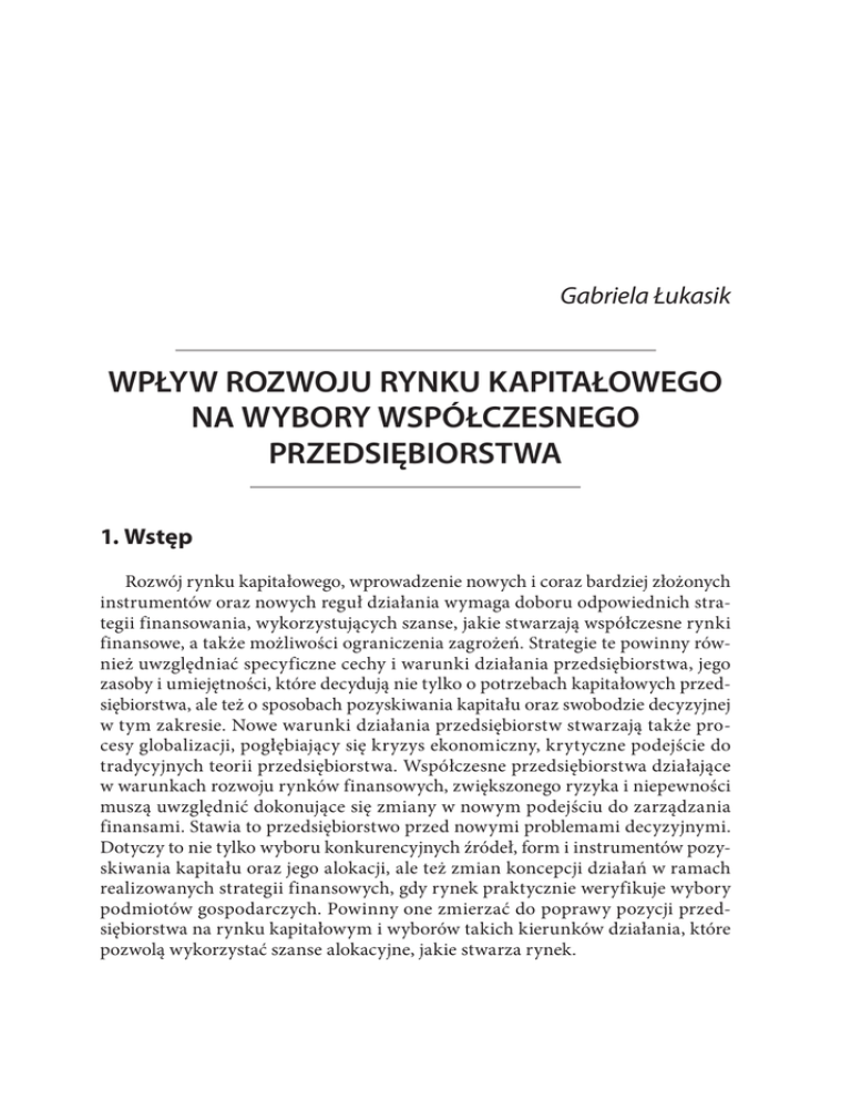 Gabriela Łukasik Wpływ rozwoju rynku kapitałowego na wybory współczesnego przedsiębiorstwa 1. Wstęp Rozwój rynku kapitałowego, wprowadzenie nowych i coraz bardziej złożonych instrumentów oraz nowych reguł działania wymaga doboru odpowiednich stra tegii finansowania, wykorzystujących szanse, jakie stwarzają współczesne rynki finansowe, a także możliwości ograniczenia zagrożeń. Strategie te powinny rów nież uwzględniać specyficzne cechy i warunki działania przedsiębiorstwa, jego zasoby i umiejętności, które decydują nie tylko o potrzebach kapitałowych przed siębiorstwa, ale też o sposobach pozyskiwania kapitału oraz swobodzie decyzyjnej w tym zakresie. Nowe warunki działania przedsiębiorstw stwarzają także pro cesy globalizacji, pogłębiający się kryzys ekonomiczny, krytyczne podejście do tradycyjnych teorii przedsiębiorstwa. Współczesne przedsiębiorstwa działające w warunkach rozwoju rynków finansowych, zwiększonego ryzyka i niepewności muszą uwzględnić dokonujące się zmiany w nowym podejściu do zarządzania finansami. Stawia to przedsiębiorstwo przed nowymi problemami decyzyjnymi. Dotyczy to nie tylko wyboru konkurencyjnych źródeł, form i instrumentów pozy skiwania kapitału oraz jego alokacji, ale też zmian koncepcji działań w ramach realizowanych strategii finansowych, gdy rynek praktycznie weryfikuje wybory podmiotów gospodarczych. Powinny one zmierzać do poprawy pozycji przed siębiorstwa na rynku kapitałowym i wyborów takich kierunków działania, które pozwolą wykorzystać szanse alokacyjne, jakie stwarza rynek. 134 Gabriela Łukasik W pracy uwzględniono główne zagadnienia związane z problemami decyzyj nymi współczesnego przedsiębiorstwa działającego w zmieniającym się otocze niu rynkowym i w warunkach konfliktowych oczekiwań różnych uczestników rynku. 2. Cele i obszary decyzyjne współczesnego przedsiębiorstwa działającego na rynku kapitałowym W strukturze współczesnego przedsiębiorstwa, związanej z jego działalnością na rynku kapitałowym, można wyróżnić trzy główne obszary wyborów, czyli decyzje, związane z: 1)pozyskaniem kapitału i kształtowaniem struktury kapitału, 2)alokacją kapitału, efektywnym jego wykorzystaniem wpływającym mię dzy innymi na zakres i sposób kapitałowego powiązania z innymi podmiotami rynku, 3)zarządzaniem ryzykiem i wykorzystaniem instrumentów rynku kapitało wego zarówno do ograniczenia negatywnych jego konsekwencji, jak i do zwięk szenia wartości przedsiębiorstwa, przez świadome wchodzenie w ryzykowne transakcje. Pierwsza grupa decyzji wiąże się z wyborem struktury pozyskiwanego kapi tału, jego optymalizacją i ograniczeniem kosztu kapitału. W tym obszarze prze jawia się konkurencyjność sektora bankowego wobec rynku papierów wartościo wych. Druga grupa decyzji związana jest z wyborem kierunku alokacji kapitału z uwzględnieniem oczekiwanej stopy zwrotu i akceptowanego poziomu ryzyka. Trzeci z wyróżnionych obszarów decyzyjnych pozwala na elastyczne działanie przedsiębiorstwa i wymaga szczególnego wyróżnienia w powiązaniu z cechami współczesnych przedsiębiorstw. W każdym z wymienionych obszarów decyzyj nych występuje konieczność dostosowania wyborów do zmian związanych z roz wojem rynku kapitałowego. Współczesne przedsiębiorstwa wykorzystujące mechanizmy rynku kapitało wego w swoich decyzjach i działaniach cechuje: – wyróżnienie kategorii wartości w strukturze celów działania (ukierunkowa nie na wartość), – działanie w warunkach ryzyka i niepewności, – konieczność podejmowania procesów adaptacyjnych do zmieniających się warunków otoczenia, – uwzględnienie w dokonywanych wyborach konfliktu interesów różnych uczestników rynku. Wpływ rozwoju rynku kapitałowego... 135 W teorii finansów przedsiębiorstwa wiele miejsca poświęca się próbie zdefinio wania głównego celu jego działalności. Koncepcje teoretyczne zwracają uwagę na różne aspekty działalności przedsiębiorstwa, poszukując najlepszego kryterium decyzyjnego. Dyskusyjny jest wybór kategorii dającej możliwość zobiektywizo wanego kryterium wyboru i oceny przedsiębiorstwa pozwalającego równocześnie na ocenę różnych wariantów działania o różnym poziomie ryzyka i zakresie cza sowym z jednoczesną rynkową wyceną aktywów i ich zdolności do przynoszenia korzyści ekonomicznych. Neoklasyczna teoria przedsiębiorstwa przyjmuje maksymalizację zysku za główny cel działania (utożsamianego z zyskiem księgowym), ustalaną zgodnie z zasadami rachunkowości [Blaug 1995, s. 335 i n.]. Teorie menedżerskie wyróż niają maksymalizację bogactwa właścicieli (interesów właścicieli), którzy, inwe stując środki w działalność przedsiębiorstwa, rezygnują z bieżącej konsumpcji. W tym rozumieniu maksymalizacja wartości przedsiębiorstwa stanowi podsta wowy cel jego działalności. Teorie finansów behawioralnych, oparte na społecz nym modelu przedsiębiorstwa (społecznej odpowiedzialności przedsiębiorstwa), zwracają uwagę na realizację celów różnych grup interesów (interesariuszy) korzy stających z niezakłóconego funkcjonowania przedsiębiorstwa w zmieniającym się otoczeniu. Nie rozwijając szerzej zagadnienia, można uznać, że koncepcje kreowania wartości dla właścicieli i tworzenia wartości dla interesariuszy nie są teoriami konkurencyjnymi, ale komplementarnymi [Noga 2007; Gruszecki 2002]. Cele przedsiębiorstwa powinny więc uwzględniać jego zdolność do: – spełnienia oczekiwań finansowych aktualnych kapitałodawców (zabezpie czenia oczekiwanej stopy zwrotu) w dłuższym okresie, – zabezpieczenia rozwoju i wymaganego poziomu samofinansowania, – utrzymania zdolności do pozyskiwania dodatkowych funduszy zewnętrz nych, tj. wiarygodności wobec potencjalnych inwestorów. Dyskusyjny jest sposób rozumienia kategorii wartości w aspekcie wartości e