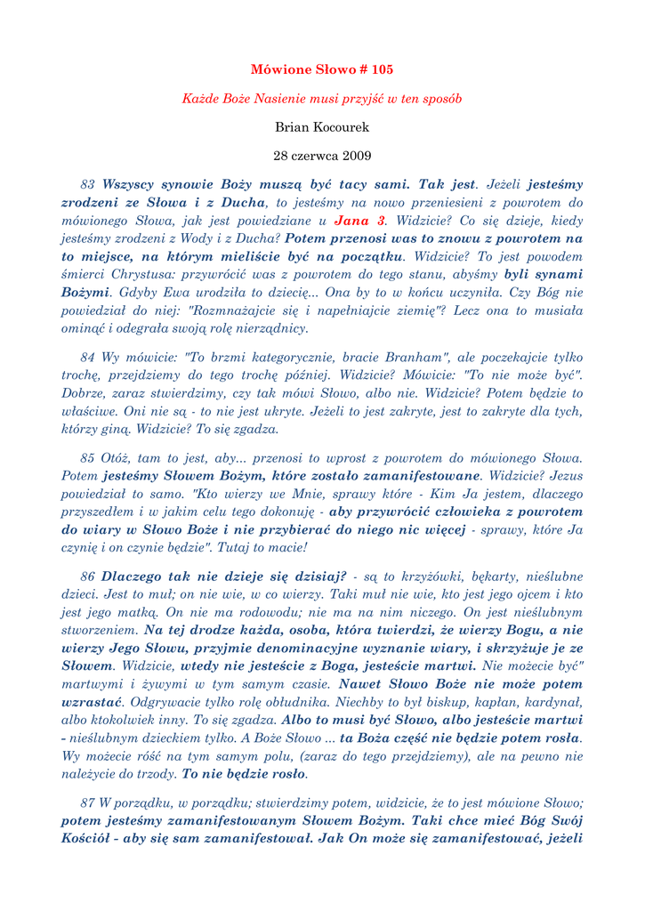 Mówione Słowo # 105 Każde Boże Nasienie musi przyjść w ten sposób Brian Kocourek 28 czerwca 2009 83 Wszyscy synowie Boży muszą być tacy sami. Tak jest. Jeżeli jesteśmy zrodzeni ze Słowa i z Ducha, to jesteśmy na nowo przeniesieni z powrotem do mówionego Słowa, jak jest powiedziane u Jana 3. Widzicie? Co się dzieje, kiedy jesteśmy zrodzeni z Wody i z Ducha? Potem przenosi was to znowu z powrotem na to miejsce, na którym mieliście być na początku. Widzicie? To jest powodem śmierci Chrystusa: przywrócić was z powrotem do tego stanu, abyśmy byli synami Bożymi. Gdyby Ewa urodziła to dziecię... Ona by to w końcu uczyniła. Czy Bóg nie powiedział do niej: "Rozmnażajcie się i napełniajcie ziemię"? Lecz ona to musiała ominąć i odegrała swoją rolę nierządnicy. 84 Wy mówicie: "To brzmi kategorycznie, bracie Branham", ale poczekajcie tylko trochę, przejdziemy do tego trochę później. Widzicie? Mówicie: "To nie może być". Dobrze, zaraz stwierdzimy, czy tak mówi Słowo, albo nie. Widzicie? Potem będzie to właściwe. Oni nie są - to nie jest ukryte. Jeżeli to jest zakryte, jest to zakryte dla tych, którzy giną. Widzicie? To się zgadza. 85 Otóż, tam to jest, aby... przenosi to wprost z powrotem do mówionego Słowa. Potem jesteśmy Słowem Bożym, które zostało zamanifestowane. Widzicie? Jezus powiedział to samo. "Kto wierzy we Mnie, sprawy które - Kim Ja jestem, dlaczego przyszedłem i w jakim celu tego dokonuję - aby przywrócić człowieka z powrotem do wiary w Słowo Boże i nie przybierać do niego nic więcej - sprawy, które Ja czynię i on czynie będzie". Tutaj to macie! 86 Dlaczego tak nie dzieje się dzisiaj? - są to krzyżówki, bękarty, nieślubne dzieci. Jest to muł; on nie wie, w co wierzy. Taki muł nie wie, kto jest jego ojcem i kto jest jego matką. On nie ma rodowodu; nie ma na nim niczego. On jest nieślubnym stworzeniem. Na tej drodze każda, osoba, która twierdzi, że wierzy Bogu, a nie wierzy Jego Słowu, przyjmie denominacyjne wyznanie wiary, i skrzyżuje je ze Słowem. Widzicie, wtedy nie jesteście z Boga, jesteście martwi. Nie możecie być" martwymi i żywymi w tym samym czasie. Nawet Słowo Boże nie może potem wzrastać. Odgrywacie tylko rolę obłudnika. Niechby to był biskup, kapłan, kardynał, albo ktokolwiek inny. To się zgadza. Albo to musi być Słowo, albo jesteście martwi - nieślubnym dzieckiem tylko. A Boże Słowo ... ta Boża część nie będzie potem rosła. Wy możecie róść na tym samym polu, (zaraz do tego przejdziemy), ale na pewno nie należycie do trzody. To nie będzie rosło. 87 W porządku, w porządku; stwierdzimy potem, widzicie, że to jest mówione Słowo; potem jesteśmy zamanifestowanym Słowem Bożym. Taki chce mieć Bóg Swój Kościół - aby się sam zamanifestował. Jak On może się zamanifestować, jeżeli Jego Własne Nasienie nie jest w tej osobie? Jak możecie użyć waszych własnych myśli i zamanifestować Samego Boga we was? Jak możecie wziąć swoją własną wiarę i powiedzieć: "Mój pastor uczy... moje wyznanie mówi, że to... że dni cudów..." Jak możecie tak czynić, a pomimo tego być zamanifestowanym synem Boga? Jak możecie w ten sposób postępować? Wtedy śmierć Jezusa nie była dla was niczym! "Ach, ja Go przyjmuję, mego Zbawcę". Nieprawda! Mówisz, że tak czynisz, ale nie czynisz! Twoje uczynki udowadniają, kim jesteś. Jezus powiedział to samo. "Jeżeli sądzicie, że Ja jestem nieślubnie narodzony..." Oni mówili: "Jesteśmy synami Abrahama, nie potrzebujemy nikogo, kto by nas uczył". ON rzekł: "Gdybyście byli dziećmi Abrahama, poznalibyście Mnie". Widzicie? ON rzekł: "Kto z was może mi zarzucać grzech (niewiarę)? Pokażcie mi jedną rzecz, którą Bóg obiecał odnośnie mnie, a która się nie wypełniła. Pokażcie mi jedną rzecz, którą obiecał Ojciec, a której Ja nie wypełniłem. Grzech jest niewiarą. Zobaczymy więc, czy to potraficie przedłożyć". To ich rozbroiło. Widzicie? Naturalnie. On rzekł: "Kto może mnie oskarżyć? Któż może mnie potępić z grzechu i niewiary?" Widzicie? "Jeżeli ja nie wierzę, to dlaczego Ojciec działa przeze mnie tak, jako działa wypełnia każde Słowo, które On obiecał. Pozwólcie mi zobaczyć, gdzie możecie się tym wykazać?" Oto, co mówi brat Branham nam tutaj, a mianowicie że jesteśmy przeznaczeni do tego, aby odzwierciedlać obraz oryginalnego nasienia. A to nie mogłoby nastać, dopóki nie mielibyśmy życia, które było w pierworodnym nasieniu. Bo jeżeli mamy życie, wtedy mamy naturę, bo dwaj są jedno w takim sensie, kiedy natura życia jest odzwierciedlonymi atrybutami i zamanifestowanym charakterem życia w nasieniu. Więc przyjrzyjmy się bliżej dzisiejszego poranka słowom brata Branhama, które tutaj przeczytaliśmy. Bo to wszystko rozpoczęło się przed założeniem świata, jak apostoł Paweł powiedział w Efezjan 1:3, że Bóg wybrał nas w Nim przed założeniem świata. A jeżeli byliśmy w Nim, mieliśmy część Bożego Życia, które także było w Nim. Bo zakon życia mówi, że każde nasienie musi zrodzić według swego rodzaju. Efezjan 1:3 Błogosławiony niech będzie Bóg i Ojciec Pana naszego Jezusa Chrystusa, (więc widzimy, że Jezus miał i Boga i Ojca) Błogosławiony niech będzie Bóg i Ojciec Pana naszego Jezusa Chrystusa, (a teraz on zamierza nam powiedzieć coś o tym Bogu i Ojcu naszego Pana Jezusa Chrystusa), który (zauważcie, on mówi ciągle o tym, który jest i Bogiem i Ojcem naszego Pana Jezusa Chrystusa) który (Bóg, Ojciec Jezusa) nas ubłogosławił (więc on mówi o nas tutaj. Który nas błogosławił) w Chrystusie wszelkim duchowym błogosławieństwem niebios; Więc, co albo kto jest tym Chrystusem, o którym tutaj czytamy? Zawsze pamiętajcie, kiedy widzicie słowo Chrystus, ono pochodzi od rdzenia słowa Chrio, co oznacza, pomazany, i dlatego on mówi bądź o tym, który namaszcza, albo o tym, kto 