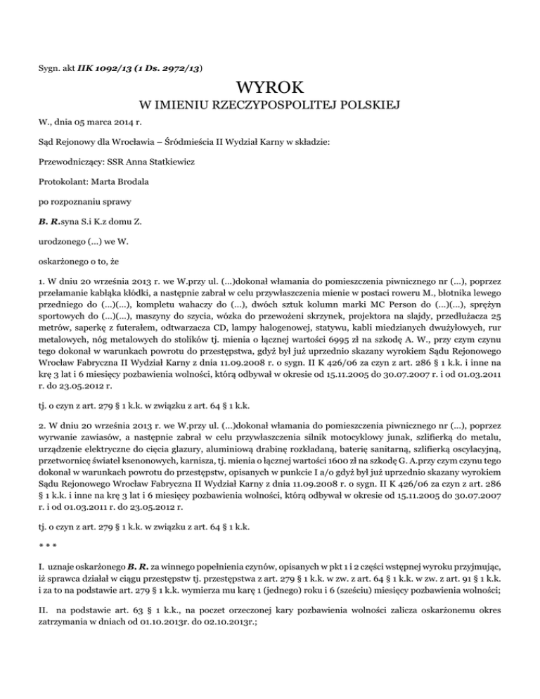 Sygn. akt IIK 1092/13 (1 Ds. 2972/13) WYROK W IMIENIU RZECZYPOSPOLITEJ POLSKIEJ W., dnia 05 marca 2014 r. Sąd Rejonowy dla Wrocławia – Śródmieścia II Wydział Karny w składzie: Przewodniczący: SSR Anna Statkiewicz Protokolant: Marta Brodala po rozpoznaniu sprawy B. R.syna S.i K.z domu Z. urodzonego (...) we W. oskarżonego o to, że 1. W dniu 20 września 2013 r. we W.przy ul. (...)dokonał włamania do pomieszczenia piwnicznego nr (...), poprzez przełamanie kabłąka kłódki, a następnie zabrał w celu przywłaszczenia mienie w postaci roweru M., błotnika lewego przedniego do (...)(...), kompletu wahaczy do (...), dwóch sztuk kolumn marki MC Person do (...)(...), sprężyn sportowych do (...)(...), maszyny do szycia, wózka do przewożeni skrzynek, projektora na slajdy, przedłużacza 25 metrów, saperkę z futerałem, odtwarzacza CD, lampy halogenowej, statywu, kabli miedzianych dwużyłowych, rur metalowych, nóg metalowych do stolików tj. mienia o łącznej wartości 6995 zł na szkodę A. W., przy czym czynu tego dokonał w warunkach powrotu do przestępstwa, gdyż był już uprzednio skazany wyrokiem Sądu Rejonowego Wrocław Fabryczna II Wydział Karny z dnia 11.09.2008 r. o sygn. II K 426/06 za czyn z art. 286 § 1 k.k. i inne na krę 3 lat i 6 miesięcy pozbawienia wolności, którą odbywał w okresie od 15.11.2005 do 30.07.2007 r. i od 01.03.2011 r. do 23.05.2012 r. tj. o czyn z art. 279 § 1 k.k. w związku z art. 64 § 1 k.k. 2. W dniu 20 września 2013 r. we W.przy ul. (...)dokonał włamania do pomieszczenia piwnicznego nr (...), poprzez wyrwanie zawiasów, a następnie zabrał w celu przywłaszczenia silnik motocyklowy junak, szlifierką do metalu, urządzenie elektryczne do cięcia glazury, aluminiową drabinę rozkładaną, baterię sanitarną, szlifierką oscylacyjną, przetwornicę świateł ksenonowych, karnisza, tj. mienia o łącznej wartości 1600 zł na szkodę G. A.przy czym czynu tego dokonał w warunkach powrotu do przestępstw, opisanych w punkcie I a/o gdyż był już uprzednio skazany wyrokiem Sądu Rejonowego Wrocław Fabryczna II Wydział Karny z dnia 11.09.2008 r. o sygn. II K 426/06 za czyn z art. 286 § 1 k.k. i inne na krę 3 lat i 6 miesięcy pozbawienia wolności, którą odbywał w okresie od 15.11.2005 do 30.07.2007 r. i od 01.03.2011 r. do 23.05.2012 r. tj. o czyn z art. 279 § 1 k.k. w związku z art. 64 § 1 k.k. *** I. uznaje oskarżonego B. R. za winnego popełnienia czynów, opisanych w pkt 1 i 2 części wstępnej wyroku przyjmując, iż sprawca działał w ciągu przestępstw tj. przestępstwa z art. 279 § 1 k.k. w zw. z art. 64 § 1 k.k. w zw. z art. 91 § 1 k.k. i za to na podstawie art. 279 § 1 k.k. wymierza mu karę 1 (jednego) roku i 6 (sześciu) miesięcy pozbawienia wolności; II. na podstawie art. 63 § 1 k.k., na poczet orzeczonej kary pozbawienia wolności zalicza oskarżonemu okres zatrzymania w dniach od 01.10.2013r. do 02.10.2013r.; III. zwalnia oskarżonego od ponoszenia kosztów sądowych, w tym opłaty, zaliczając je na rachunek Skarbu Państwa. II K 1092/13 UZASADNIENIE Na podstawie całokształtu okoliczności ujawnionych w toku postępowania jurysdykcyjnego Sąd Rejonowy ustalił następujący stan faktyczny istotny dla rozstrzygnięcia: W dniu 20 września 2013 r. B. R. zszedł do piwnicy mieszczącej się w budynku, w którym mieszka tj. przy ul. (...) we W.. Znalazł tam metalową rurkę, którą złamał kłódkę na drzwiach jednego z boksów piwnicznych. Do drugiego boksu dostał się po zdjęciu drzwi z zawiasów. Wyjaśnił, że z jednego pomieszczenia zabrał silnik, czarny rzutnik i różne części, których nie jest w stanie dokładnie określić. Z drugiego pomieszczenia natomiast zabrał przyrządy elektryczne. Część ze skradzionych przedmiotów sprzedał przypadkowo spotkanym osobom, pozostałe ukrył. Pieniądze przeznaczył na żywność, ponieważ nie pracuje i nie ma innego źródła utrzymania oprócz niewielkiej pomocy finansowej brata. D.: wyjaśnienia oskarżonego k.31, 72 A. W.jest użytkownikiem boksu piwnicznego o numerze (...) w budynku mieszkalnym przy ulicy (...)we W.. 20 września 2013 roku, opuszczając to pomieszczenie, zamknął je na kłódkę. Gdy udał się tam ponownie w dniu 30 września 2013 r., kłódka była złamana. W piwnicy brakowało następujących przedmiotów: roweru M., błotnika lewego przedniego, sprężyn sportowych oraz kompletu wahaczy do samochodu marki A. (...), dwóch kolumn marki MC Person, maszyny do szycia, wózka do przewożenia skrzynek, projektora do wyświetlania slajdów, przedłużacza, saperki z futerałem, odtwarzacza CD, lampy halogenowej, statywu, kabli miedzianych dwużyłowych, rur metalowych, nóg metalowych od stolika. Łączna wartość przedmiotów wynosi 6995 zł. dowód: zeznania świadka A. W. k. 2-3, 17-18, 72 G. A., użytkownik pomieszczenia piwnicznego w budynku mieszkalnym przy ul. (...) we W., w dniu 20 września 2013 zauważył, że drzwi do pomieszczenia zostały zdjęte z zawiasów. W boksie brakowało następujących przedmiotów: silnika motocyklowego Junak, szlifierki do metalu, urządzenia elektrycznego do cięcia glazury, aluminiowej drabiny rozkładanej, baterii sanitarnej, szlifierki oscylacyjnej, przetwornicy świateł ksenon oraz karnisza. Łączna wartość przedmiotów wynosi 1600 zł. dowód: zeznania świadka G. A. k. 20-22, 72 Maszyna do szycia, wózek do przewożenia skrzynek, przedłużacz, nogi od stolika, projektor, futerał od saperki, przetwornica świateł ksenon oraz silnik zostały odnalezione w boksie piwnicznym o numerze (...), którego użytkownikiem był B. R.. dowód: zeznania świadka A. W. k. 2-3, 17-18, 72 protokół przeszukania k. 13-16 Oskarżony B. R. jest bezdzietnym kawalerem. Posiada wykształcenie podstawowe. Nie pracuje. Pozostaje na utrzymaniu brata. dowód: dane osobopoznawcze k. 30-31 B. R. był wcześniej karany sądownie. Prawomocnym wyrokiem Sądu rejonowego dla Wrocł