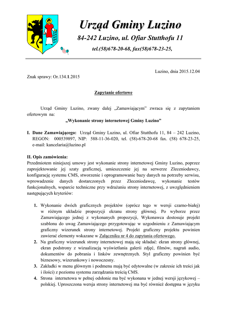 Urząd Gminy Luzino 84-242 Luzino, ul. Ofiar Stutthofu 11 tel.(58)678-20-68, fax(58)678-23-25, Luzino, dnia 2015.12.04 Znak sprawy: Or.134.1.2015 Zapytanie ofertowe Urząd Gminy Luzino, zwany dalej „Zamawiającym” zwraca się z zapytaniem ofertowym na: „Wykonanie strony internetowej Gminy Luzino” I. Dane Zamawiającego: Urząd Gminy Luzino, ul. Ofiar Stutthofu 11, 84 – 242 Luzino, REGON: 000539897, NIP: 588-11-36-020, tel. (58)-678-20-68 fax. (58) 678-23-25, e-mail: [email protected] II. Opis zamówienia: Przedmiotem niniejszej umowy jest wykonanie strony internetowej Gminy Luzino, poprzez zaprojektowanie jej szaty graficznej, umieszczenie jej na serwerze Zleceniodawcy, konfigurację systemu CMS, stworzenie i oprogramowanie bazy danych na potrzeby serwisu, wprowadzenie danych dostarczonych przez Zleceniodawcę, wykonanie testów funkcjonalnych, wsparcie techniczne przy wdrażaniu strony internetowej, z uwzględnieniem następujących kryteriów: 1. Wykonanie dwóch graficznych projektów (oprócz tego w wersji czarno-białej) w różnym układzie propozycji ekranu strony głównej. Po wyborze przez Zamawiającego jednej z wykonanych propozycji, Wykonawca dostosuje projekt szablonu do uwag Zamawiającego przygotowując w uzgodnieniu z Zamawiającym graficzny wizerunek strony internetowej. Projekt graficzny projektu powinien zawierać elementy wskazane w Załączniku nr 4 do zapytania ofertowego. 2. Na graficzny wizerunek strony internetowej mają się składać: ekran strony głównej, ekran podstrony z wizualizacją wyświetlania galerii zdjęć, filmów, nagrań audio, dokumentów do pobrania i linków zewnętrznych. Styl graficzny powinien być biznesowy, wizerunkowy i nowoczesny. 3. Zakładki w menu głównym i podmenu mają być edytowalne (w zakresie ich treści jak i ilości) z poziomu systemu zarządzania treścią CMS. 4. Strona internetowa w pełnej odsłonie ma być wykonana w jednej wersji językowej – polskiej. Uproszczona wersja strony internetowej ma być również dostępna w języku angielskim i niemieckim (tłumaczenie do 10 stron formatu A4, przy założeniu do 1800 znaków/strona dla każdego z wymienionych języków). 5. Strona zostanie wykonana w oparciu o standardy HTML 5 i CSS 3, które będą poprawnie wyświetlane również na urządzeniach mobilnych (pełna responsywność). 6. Strona musi być zgodna z wymogami CEIDG oraz wytycznymi WCAG 2.0 opracowanymi przez konsorcjum W3C (http://www.w3.org/TR/WCAG/, http://dostepnestrony.pl/wcag-2-0-w-skrocie/). 7. Stworzenie kontrastowej wersji strony dla osób słabo widzących oraz umożliwienie zmniejszania/zwiększania tekstu przez użytkownika. 8. Strona internetowa ma być przystosowana do przeglądania na komputerze w rozdzielczości 1024x768 i wyższej. 9. Strona ma być zoptymalizowana pod wyszukiwarki internetowe (SEO). 10. Wykonawca zapewni poprawne funkcjonowanie serwisu w przeglądarkach: Internet Explorer 8+, Mozilla Firefox 20.x+, Opera 11.5+, Google Chrome 26.x+. 11. Strona musi być zabezpieczona przed włamaniami oraz posiadać obrazki zabezpieczające CAPTCHA w wymaganych miejscach np. przy zapisywaniu się do newsletterów, które blokują roboty-automaty. 12. Strona powinna zawierać zabezpieczenie strony logowania. 13. Strona powinna mieć zainstalowany firewall oraz oprogramowanie wykrywające próbę instalacji niewłaściwego kodu php itp. 14. Strona www powinna być zainstalowana na serwerze utrzymywanym przez Zleceniodawcę z bazą danych MySQL wer.5.5 lub PostgreSQL 9.3. 15. Strona powinna posiadać następujące funkcjonalności: a) przeglądanie dokumentów i artykułów PDF na stronie interneetowej, b) wyszukiwanie dokumentów w serwisie, c) automatyczne tworzenia metatagów na podstawie tytułu i treści dodanego komunikatu na stronie, d) automatyczne tworzenie kopii zapasowej strony (backup), e) tworzenia szczegółowych statystyk, f) automatyczne tworzenie newslettera i automatyczna wysyłka do zasubskrybowanych osób (np. po uzbieraniu 3 nowych newsów następuje wysyłka), g) wydruk dowolnego artykułu przez użytkownika serwisu poprzez wygenerowany automatycznie szablon, h) możliwość tworzenia dowolnej ilości formularzy kontaktowych, i) edytor WYSIWIG który m.in. zawiera następujące opcje: zapewnienie możliwości dodawania plików (zdjęć, dokumentów do pobrania itp.) do artykułu z poziomu edytora WYSIWIG, łatwe dodawanie plików multimedialnych (np. z YouTube) bez konieczności uploadu pliku multimedialnego na serwer www strony. Multimedia powinny być uzupełnione o przyciski HTML, które powinny dobrze działać we wszystkich czytnikach ekranu oraz przy użyciu do obsługi strony internetowej, samej klawiatury, o możliwość przeklejania treści z programu MS Word z zachowaniem odpowiedniego formatowania, o upload plików (zdjęciowych, filmowych, 2 radiowych oraz dokumentów w odpowiednich formatach), o możliwość edycji kodu HTML, o możliwość tworzenia wewnętrznych odnośników pomiędzy stronami, j) umożliwienie integracji z serwisami: YouTube, Twitter, Facebook z automatyczną publikacją dodanych newsów na Facebooku oraz spersonalizowanym ekranem wyświetlania playlisty YouTube na stronie głównej, k) interaktywna przeglądarka biuletynu informacyjnego Rady i Wójta Gminy, l) kalendarium imprez i wydarzeń, m) strona będzie w czytelny sposób przekierowywać do konta Gminy Luzino na Facebooku, YouTube, Twitterze oraz do serwisu Geomapa dla Gminy Luzino, Biuletynu Informacji Publicznej Gminy Luzino, e-PUAP i elektronicznej skrzynki podawczej, wirtualnego spaceru po Gminie Luzino, oraz stron jednostek pomocniczych, organizacyjnych, instytucji kultury podległych Gminie Luzino, stowarzyszeń i związków międzygminnych, do których należy Gmina Luzino oraz do innych wskazanych przez Zamawiającego miejsc w internecie. 16. Wykonawca zainstaluje i skonfiguruje serwis na serwerze Zamawiającego pod kątem zapewnienia wysokiego poziomu bezpieczeńst