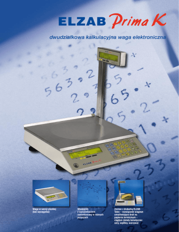 dwudziałkowa kalkulacyjna waga elektroniczna Waga w wersji płaskiej (bez wysięgnika) Wysięgnik z wyświetlaczem zamontowany w różnych pozycjach Zestaw z drukarką ELZAB Talos – rozwiązanie wagowe umożliwiające druk na papierze termicznym – ciągłym (działy tematyczne: sery, wędliny, warzywa) CECHY UŻYTKOWE Cechy i zalety użytkowe Waga elektroniczna ELZAB Prima K jest dwudziałkową wagą kalkulacyjną realizującą typowe funkcje dokładnego pomiaru masy oraz wyliczenie należności za zważony towar. Dodatkowo waga ELZAB Prima K posiada szereg cech i udogodnień wyróżniających ją spośród szerokiej oferty rynkowej. Są to m.in.: • możliwość korzystania z bazy towarowej kasy rejestrującej marki ELZAB oraz z bazy towarowej (32 510 PLU) zapisanej w pamięci wagi, • generowanie na kasach marki ELZAB pozycji sprzedaży dla towarów ważonych i nieważonych, • przesyłanie wyniku ważenia w trybie emulacji kodu kreskowego. Jedną z podstawowych zalet wagi ELZAB Prima K jest łatwość ustawienia jej parametrów do współpracy z wybraną kasą marki ELZAB. Po wybraniu modelu kasy spośród wymienionych w menu wagi, waga „prowadzi” użytkownika przez kolejne etapy konfiguracji. Użytkownik nie musi znać poszczególnych parametrów, aby poprawnie skonfigurować wagę dla wybranego sposobu pracy, gdyż waga robi to samodzielnie. Istnieje także możliwość „ręcznej” konfiguracji wagi do współpracy z urządzeniami innych producentów. Waga ELZAB Prima K może pracować samodzielnie, a także z kasą rejestrującą lub komputerem. Istnieje również możliwość jednoczesnego podłączenia wagi ELZAB Prima K do kasy rejestrującej oraz komputera. Dodatkowo waga ELZAB Prima K współpracuje z drukarką ELZAB Talos, na której wykonywane mogą być wydruki zawierające nazwy ważonych produktów, ich ceny jednostkowe, ilość i wartość oraz kody kreskowe. Waga ELZAB Prima K produkowana jest w wersji z wysięgnikiem o zmiennym położeniu oraz w wersji płaskiej. Wersja płaska wyposażona jest w dwa wyświetlacze umieszczone w obudowie wagi. W wersji z wysięgnikiem wyświetlacz operatora umieszczony jest w korpusie wagi, a wyświetlacz klienta znajduje się na wysięgniku. Alfanumeryczne, podświetlane wyświetlacze LCD mogą wyświetlać nie tylko cenę, należność oraz wagę produktów, ale także ich nazwy. Wysoka jakość zastosowanych wyświetlaczy zapewnia doskonałą czytelność przy różnym oświetleniu. Odporna na wilgoć klawiatura składa się z 28 klawiszy. Sześć klawiszy (V1-V6) może być wykorzystanych do bezpośredniego dostępu do towarów lub sumowania należności (dla sześciu operatorów jednocześnie). Ponadto dostępne są klawisze nawigacji po menu wagi, tarowania i zerowania, a także klawisze wprowadzania ceny, numeru PLU, ilości oraz kasowania wprowadzonej wartości. Dodatkowo waga posiada klawisz przeliczania na inną walutę. Przeznaczenie Uniwersalność wagi ELZAB Prima K sprawia, że znajduje ona bardzo szerokie zastosowanie w placówkach handlowych różnego typu, zarówno jako urządzenie wolnostojące, jak i podłączona do kasy rejestrującej lub komputera. Dzięki możliwości generowania pozycji paragonowych podczas współpracy z podłączoną kasą ELZAB, stanowi ona niezbędne wyposażenie tych placówek, gdzie szybkość obsługi klienta jest priorytetowa. Waga ELZAB Prima K wspomaga sprzedawców obsługujących działy tematyczne (sery, wędliny, warzywa itp.) także ze względu na możliwość podłączenia zewnętrznej drukarki ELZAB Talos. Wydruki generowane przez drukarkę, zawierają m.in. kody kreskowe, zdecydowanie ułatwiają i przyśpieszają rozliczenia handlowe z klientem przy stanowisku kasowym. Waga ELZAB Prima K może także być wykorzystywana jako typowa waga kontrolna do pomiarów masy oraz może ułatwiać konfekcjonowanie różnych towarów w hurtowniach i magazynach. Znajduje również zastosowanie w zakładach przetwórczych i produkcyjnych. Gwarancja jakości Waga ELZAB Prima K spełnia wszystkie przepisy metrologiczne w zakresie stosowania wag do bezpośredniego rozliczania obrotów handlowych. Urządzenie posiada certyfikat zatwierdzenia typu WE i podlega legalizacji według przepisów UE przed dopuszczeniem do obrotu. Proces produkcyjny odbywa się pod nadzorem procedur systemu jakości ISO 9001. DANE TECHNICZNE Typ: dwudziałkowa kalkulacyjna waga elektroniczna Wewnętrzna baza towarów: 32 510 towarów Wyświetlacze: alfanumeryczne wyświetlacze LCD z podświetleniem, 2 linie po 20 znaków (wyświetlacz dla kasjera w obudowie, wyświetlacz klienta na wysięgniku o zmiennym położeniu lub w obudowie) Klawiatura: 28 klawiszy, w tym: • 6 klawiszy bezpośredniego dostępu do towarów lub sumowania należności • klawisze tarowania i zerowania • klawisze wprowadzania ceny, numeru PLU, ilości • klawisz przeliczania na inną walutę • klawisze nawigacji po menu wagi • klawisz kasowania wprowadzonej wartości • klawisz zatwierdzenia zważenia towaru lub wybranej pozycji menu, przesłania wyniku do kasy, zapamiętania wyniku ważenia w celu dodania do rachunku Wskaźniki: zero, netto, stała tara Interfejsy: • szeregowy RS232 (złącze RJ12) • wyjście emulacji szeregowego lub klawiaturowego czytnika kodów kreskowych (złącze RJ45) • podłączenie komputera PC (złącze RJ45) Obciążenie maksymalne: 15kg Obciążenie minimalne: 40g Wartość działki legalizacyjnej e=: 2g w zakresie 0-6kg / 5g w zakresie 6-15kg Wartość działki 2g w zakresie 0-6kg / 5g w zakresie 6-15kg elementarnej d=e=: Zakłady Urządzeń Komputerowych ELZAB SA ul. Kruczkowskiego 39, 41-813 Zabrze tel.: +48 (32) 272 20 21, fax: +48 (32) 272 25 83 Liczba działek legalizacyjnych: 3 000 Górna granica tary odejmującej T=: - 15 kg Klasa dokładności: III Zakres temperatur pracy: + 0° C ÷ + 40° C Zasilanie: zewnętrzny zasilacz 12V = 1A Moc pobierana przez wagę: 10W Wymiary użytkowe sz