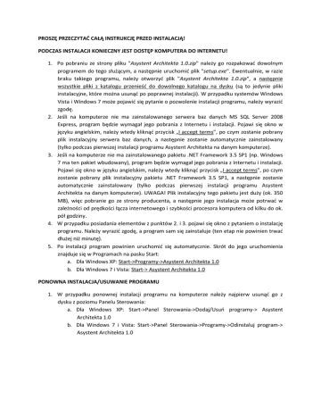 PROSZĘ PRZECZYTAĆ CAŁĄ INSTRUKCJĘ PRZED INSTALACJĄ! PODCZAS INSTALACJI KONIECZNY JEST DOSTĘP KOMPUTERA DO INTERNETU! 1. Po pobraniu ze strony pliku "Asystent Architekta 1.0.zip" należy go rozpakować dowolnym programem do tego służącym, a następnie uruchomić plik "setup.exe". Ewentualnie, w razie braku takiego programu, należy otworzyć plik "Asystent Architekta 1.0.zip", a następnie wszystkie pliki z katalogu przenieść do dowolnego katalogu na dysku (są to jedynie pliki instalacyjne, które można usunąć po poprawnej instalacji). W przypadku systemów Windows Vista i Windows 7 może pojawić się pytanie o pozwolenie instalacji programu, należy wyrazić zgodę. 2. Jeśli na komputerze nie ma zainstalowanego serwera baz danych MS SQL Server 2008 Express, program będzie wymagał jego pobrania z Internetu i instalacji. Pojawi się okno w języku angielskim, należy wtedy kliknąć przycisk „I accept terms”, po czym zostanie pobrany plik instalacyjny serwera baz danych, a następnie zostanie automatycznie zainstalowany (tylko podczas pierwszej instalacji programu Asystent Architekta na danym komputerze). 3. Jeśli na komputerze nie ma zainstalowanego pakietu .NET Framework 3.5 SP1 (np. Windows 7 ma ten pakiet wbudowany), program będzie wymagał jego pobrania z Internetu i instalacji. Pojawi się okno w języku angielskim, należy wtedy kliknąć przycisk „I accept terms”, po czym zostanie pobrany plik instalacyjny pakietu .NET Framework 3.5 SP1, a następnie zostanie automatycznie zainstalowany (tylko podczas pierwszej instalacji programu Asystent Architekta na danym komputerze). UWAGA! Plik instalacyjny tego pakietu jest duży (ok. 350 MB), więc pobranie go ze strony producenta, a następnie jego instalacja może potrwać w zależności od prędkości łącza internetowego i szybkości procesora komputera od kilku do ok. pół godziny. 4. W przypadku posiadania elementów z punktów 2. i 3. pojawi się okno z pytaniem o instalację programu. Należy wyrazić zgodę, a program sam się zainstaluje (ten etap nie powinien trwać dłużej niż minutę). 5. Po instalacji program powinien uruchomić się automatycznie. Skrót do jego uruchomienia znajduje się w Programach na pasku Start: a. Dla Windows XP: Start->Programy->Asystent Architekta 1.0 b. Dla Windows 7 i Vista: Start-> Asystent Architekta 1.0 PONOWNA INSTALACJA/USUWANIE PROGRAMU 1. W przypadku ponownej instalacji programu na komputerze należy najpierw usunąć go z dysku z poziomu Panelu Sterowania: a. Dla Windows XP: Start->Panel Sterowania->Dodaj/Usuń programy-> Asystent Architekta 1.0 b. Dla Windows 7 i Vista: Start->Panel Sterowania->Programy->Odinstaluj program-> Asystent Architekta 1.0