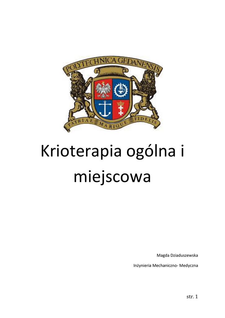 Krioterapia ogólna i miejscowa Magda Dziaduszewska Inżynieria Mechaniczno- Medyczna str. 1 Spis treści 1 Co to jest Krioterapia? 3 1.1 Wskazania do krioterapii....................................................................... 3 2 Krioterapia miejscowa 4 2.1Metody krioterapii miejscowej................................................................ 4 2.1.1Przykłady metod prostych stosowanych w krioterapii miejscowej................................................................... 4 2.1.2Przykłady metod złożonych stosowanych w krioterapii miejscowej................................................................... 5 3 Krioterapia ogólna 7 3.1Rodzaje kriokomór................................................................................... 8 4 Podsumowanie 11 5 Literatura 13 str. 2 1 Co to jest Krioterapia? Krioterapie możemy rozumieć jako formę zimnolecznictwa z zastosowaniem temperatur poniżej 0 °C. Wyróżnia się a) Krioterapia miejscowa (kriodestrukcja) b) Krioterapia ogólna (kriostymulacja) Krioterapię stosuje się dla wywołania i wykorzystania fizjologicznych i ustrojowych reakcji na zimno w celu wspomagania leczenia podstawowego i ułatwienia leczenia ruchem. 1.1 Wskazania do krioterapii Krioterapię możemy stosować m.in. w przypadkach: świeże urazy ( stłuczenia, skręcenia, zwichnięcia, naderwania mięśni, uszkodzenia ścięgien) przeciążeniowe odczyny zapalne stawów, ścięgien i mięśni uszkodzenie łąkotki choroby zwyrodnieniowe stawów zmiany zapalne stawów o podłożu metabolicznym (np. dna moczanowa) przewlekłe zapalenie kręgosłupa szyjnego zespół bolesnego barku wszystkie choroby reumatoidalne i reumatyczne narządów ruchu, stwardnienie rozsiane, profilaktyka osteoporozy niedowłady i przykurcze spastyczne kończyn w przebiegu porażenia połowicznego zwalczanie przewlekłego i patologicznego bólu (metoda zachowawcza) u przemęczonych fizycznie i psychicznie osób dorosłych u sportowców wyczynowych zespoły bólu mięśniowo-powięziowego cellulitis depresje odnowa biologiczna i odchudzanie łuszczycowe zapalenie stawów zmian skórnych łagodnych i złośliwych (np. brodawki skórne, choroba Bowena). str. 3 2 Krioterapia miejscowa Polega na przyłożeniu bardzo niskiej temperatury do miejsca zmienionego chorobowo w celu wywołania destrukcji chorej tkanki. Zabieg zamrażania i rozmrażania powtarza się w jednym cyklu kilkakrotnie. Doprowadza to do zamarzania zawartości komórek, pękania błon biologicznych i w konsekwencji destrukcji tkanki. Pacjent, poddany zabiegowi krioterapii odczuwa przez kilkanaście sekund paradoksalnie ciepło, co jest skutkiem skurczu naczyń. Potem następuje szybkie rozszerzenie naczyń krwionośnych (może osiągnąć nawet czterokrotnie większą wartość niż przed zabiegiem) i przyspieszenie przepływu krwi, utrzymujące się przez 3-4 godziny. Przekrwienie jest tym większe, im znaczniejsze było oziębienie. Kilkugodzinne przekrwienie w obrębie tkanek sprzyja nie tylko lepszej przemianie materii, ale i eliminacji nagromadzonych tam szkodliwych produktów przemiany materii. Efektem zabiegu jest długotrwałe ogrzanie wybranego fragmentu ciała, bardziej korzystne niż ogrzanie energią cieplną z zewnątrz. Po kilku godzinach zmniejszają sie obrzęki chłodzonych tkanek, poprawia się też przepływ i oczyszczanie chłonki w układzie limfatycznym. Zastosowanie bardzo niskich temperatur pozwala skrócić czas zabiegu i osiągnąć trwalszy oraz pełniejszy efekt terapeutyczny miejscowego chłodzenia. Pociąga to za sobą znaczny wzrost ukrwienia narządów wewnętrznych. Rys. Brodawka-zmiana skórna kwalifikowana do usunięcia za pomocą krioterapii miejscowej. str. 4 2.1 Metody krioterapii miejscowej Wyróżniamy wiele różnych metod krioterapii miejscowej. Możemy tutaj zaliczyć zarówno metody proste, które możemy zastosować sami , bez nadzoru lekarza czy fizjoterapeuty , jak i metody nieco bardziej złożone. Do tych drugich niezbędna jest pomoc osób doświadczonych, gdyż otrzymywane zimno będzie pochodziło od specjalistycznych urządzeń . 2.1.1 Przykłady metod prostych stosowanych w krioterapii miejscowej A. Okłady Pierwszym prostym rozwiązaniem wykorzystującym miejscowe leczenie zimnem jest okład z wykorzystaniem woreczków z lodem lub zamrożonym żelem silikonowym ew. roztworem soli (rys .1a). Okłady możemy wykonywać stosując także specjalistyczne kompresy cieplno-zimne (rys.1b), oraz jednorazowy lód syntetyczny (rys. 1c), który pod wpływem zadziałania siły(przełamanie woreczka) wywołuje reakcję mieszania się wody ze specjalna substancją z natychmiastowym efektem zimna. Rys. 1. Okłady: a) z wykorzystaniem woreczka, b) kompres cieplno- zimny, c) jednorazowy lód syntetyczny B. Częściowa kąpiel w wodzie z lodem Kąpiele wykonujemy w wannach o różnych kształtach i rozmiarach, w zależności od miejsca, które chcemy poddać krioterapii. Rys. 2. Krioterapia z wykorzystaniem specjalistycznej wanny z lodem. str. 5 C. Masaż lodem D. Zraszanie sprayem oziębiającym Do tej metody możemy wykorzystać lód syntetyczny w aerozolu (rys3.), którego działanie polega na uśmierzeniu bólu przez błyskawiczne obniżenie temperatury ciała w miejscu kontuzji. Bezfreonowy, zawiera naturalne olejki eteryczne zmniejszające uczucie bólu. Jego dużą zaleta jest fakt, że nie posiada on terminu ważności, dzięki czemu może stać nawet latami w domowej apteczce. Rys. 3. Lód syntetyczny w aerozolu. 2.1.2 Przykłady metod złożonych stosowanych w krioterapii miejscowej Kolejne metody miejscowej krioterapii wykonuje się przy użyciu specjalistycznych urządzeń. A. Ochładzanie metodą kontaktową Zimno uzyskuje się za pomocą urządzenia termoelektrycznego (rys.4), które posiada wymienne końcówki: mankiety, aplikatory, głowice mrożące. Rys. 4. Przykład urządzenia termoelektryczne str. 6 B. Ochładzanie z wykorzystaniem dysz nadmuchowych Właści