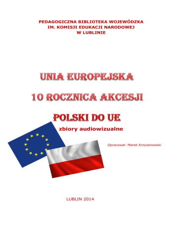 PEDAGOGICZNA BIBLIOTEKA WOJEWÓDZKA IM. KOMISJI EDUKACJI NARODOWEJ W LUBLINIE zbiory audiowizualne Opracował: Marek Krzyżanowski LUBLIN 2014 Multimediaa 1. ANIMOWANA DEBATA [Dokument elektroniczny] / red. Michał Bagrowski, Krzysztof Tusiewicz ; tł.: [z angielskiego] Katarzyna Rostocka, [z rumuńskiego] Simona Capaton, [z włoskiego] Salvatore Calamera .- Bielsko Biała : Bielskie Stowarzyszenie Artystyczne "Teatr Grodzki", 2005. - 1 dysk optyczny (CD-ROM) : dźw. , kolor ; 12 cm. Przewodnik jest prezentacją międzynarodowego projektu "Animowana Debata" - warsztaty animacji komputerowej dla grup dysfunkcyjnych w perspektywie rozwijania europejskiej współpracy zrealizowanego w ramach programu Socrates Minerva. W przewodniku znajduje się prezentacja najważniejszych doświadczeń procesu warsztatowego, kolejnych etapów i efektów pracy oraz zbiór praktycznych wskazówek dla realizatorów, rozważań natury pedagogicznej nad zastosowaną metodologią oraz analiza efektów pracy. Wymagania sprzętowe: Procesor Pentium 200 MHz ; 32 MB RAM ; Windows 95/98/2000/XP/NT ; Windows Media Player 7. CD-ROM. 352 2. DOTACJE UNIJNE [Dokument elektroniczny] : instytucje sfery budżetowej i edukacyjnej . - Zabrze : Sea Star, 2005 . - 1 dysk optyczny (CD-ROM) : dźw. ; kolor ; 12 cm. (PROGRAMY POMOCOWE UNII EUROPEJSKIEJ DLA MAŁYCH I ŚREDNICH PRZEDSIĘBIORSTW) Minimalne wymagania sprzętowe : Procesor Pentium II, 64 MB RAM, CD-ROM, karta grafiki SVGA 2 MB ; Windows 98/NT/2000/XP. CD-ROM 143 3. EUROPA NA CO DZIEŃ [Dokument elektroniczny] / scen. Kamila Bartoszewicz . + Warszawa : Centralny Ośrodek Doskonalenia Nauczycieli, 1998 . + 1 dysk optyczny (CD-ROM) : dźw., kolor ; 12 cm + podręcznik dla nauczyciela + podręcznik ucznia + kaseta VHS. 2 Uruchomienie programu pozwala wejść do jednej z trzech części: 1. Państwa Europy. 2. Instytucje europejskie - Parlament Europejski, Rada Unii Europy, Komisja Europejska itp. 3. Ojcowie Europy życiorysy polityków: Konrada Adenauera, Roberta Schumana. Program dla szkół gimnazjalnych i średnich. CD-ROM. 1 4. EUROPA NA CO DZIEŃ [Film] / reż. Klara Kopcińska ; muz. Krzesimir Dębski . - Warszawa : Centralny Ośrodek Doskonalenia Nauczycieli, 1998 . - 1 dysk DVD (120 min): dźw. stereo, wersja językowa: polski, obraz 4:3, kolor, interaktywne menu + podręcznik dla nauczyciela + podręcznik ucznia + program komputerowy CD-ROM. Pakiet multimedialny. Zawiera 12 filmów : 1. Dzieje Europy. 2. Przestrzeń Europy. 3. Kultura europejska. 4. System prawa w Europie. 5. Gospodarka rynkowa w Europie. 6. Instytucje demokratyczne w Europie. 7. Organizacje integracji europejskiej. 8. System bezpieczeństwa europejskiego. 9. Człowiek a środowisko naturalne Europy. 10. Europa regionów. 11. Państwa Europy. 12. Europa wobec świata. Program dla szkół gimnazjalnych i średnich. DVD 2346 5. GÓRNY ŚLĄSK - SILESIA [Dokument elektroniczny] / scen. Henryk Urbanek . - Katowice : Górnośląska Agencja Przekształceń Przedsiębiorstw, 1997 . - 1 dysk optyczny (CD-ROM) : dźw. , kolor ; 12 cm. Program zawiera informacje ogólne o regionie, plany przebudowy, historię, gospodarkę, strukturę aglomeracji oraz warunki komunikacji w regionie. CD-ROM jest wydany w języku polskim i angielskim. Zawiera zdjęcia, grafikę, filmy, mapy i muzykę. 3 Wymagania systemowe: Procesor 486 DX ; Pamięć 8 MB RAM ; podwójny CD- ROM ; Pentium 75 lub szybszy z 16/24 bit kolorami ; Windows 95. CD-ROM. 4 6. KONSTYTUCJE [Dokument elektroniczny]. - Warszawa : Infor, 2005 . - 1 dysk optyczny (CD-ROM) : dźw., kolor ; 12 cm. Program multimedialny zawiera : 1. Konstytucja Rzeczypospolitej Polskiej z dnia 2 kwietnia 1997 r. 2. Konstytucja 3 Maja. 3. Konstytucje w polskiej historii. 4. Konstytucja Unii Europejskiej. 5. Konstytucja Stanów Zjednoczonych Ameryki. Wymagania systemowe: Procesor 166 MHz ; System Windows 98/ME ; Internet Explorer. CD-ROM. 40 7. MŁODY EUROPEJCZYK [Dokument elektroniczny] ; MŁODY EUROPEJCZYK [Film] . - Będzin : Inter-Biznes, 2008 . - 1 dysk optyczny CD-ROM ; 4 dyski DVD (300 min) : dźw. DD 5.1 , kolor ; obraz 4:3 + interaktywne funkcje DVD. Komplet zawiera: PROGRAM KOMPUTEROWY (1 CD-ROM) wprowadza w świat zjednoczonej Europy. Zawiera: prezentację 27 państw członkowskich, hymny państwowe, zestaw łamigłówek, układanek, kart pracy przygotowanych do wydruku. W komplecie znajdują się ponadto 4 DYSKI DVD zawierające ponad 5 godzin prezentacji państw członkowskich UE. Wymagania systemowe: Procesor PIII 1 GHz ; Pamięć 512 MB ; Karta dźwiękowa ; 2 GB wolnego miejsca na dysku ; napęd DVD ; Net Framework 2.0, Flash Player 9 ; Windows Media Player 10 lub nowszy ; Adobe Reader 8.1.2 lub nowszy. CD-ROM. 1386 /1 ; DVD. 1386 /2-5 4 8. NIEZBĘDNIK EUROPEJSKI : vademecum - polskie źródła informacji o UE / oprac. Anna Kierzkowska, Elżbieta Ławor ; Departament Dokumentacji Europejskiej Urzędu Komitetu Integracji Europejskiej . Warszawa : Urząd Komitetu Integracji Europejskiej ; Departament Dokumentacji Europejskiej, 2004. - 10 dysków optycznych (CD-ROM) : dźw. , kolor ; 12 cm + Informator : 46 s. Niezbędnik jest swoistą kontynuacją "Vademecum - źródła informacji o UE". Informacje pogrupowane są w 31 działach tematycznych na 10 dyskach CD-ROM. Zakres tematyczny dysków zawiera: DYSK 1: Polska a Unia Europejska, historia UE, rozszerzenie UE ; DYSK 2: Obywatelstwo europejskie, sprawiedliwość i sprawy wewnętrzne ; DYSK 3: Edukacja, kultura, sport, społeczeństwo informacyjne, polityka audiowizualna ; DYSK 4: Podatki, stosunki zewnętrzne, unia celna ; DYSK 5: Konsumenci, środowisko, zdrowa żywność ; DYSK 6: Badania naukowe, biotechnologia, przestrzeń kosmiczna, energia ; DYSK 7: Konkurencja, przedsiębiorstwo, unia gospodarcza i walutowa, transport ; DYSK 8: Rynek wewnętrzny ; DYSK 9: Polityka socjalna ; DYSK 10: Rolnictwo, rybołówstwo, regiony. Publikacja przedstawia spis adresów internetowych stron www instytucji Unii Europejskiej, po