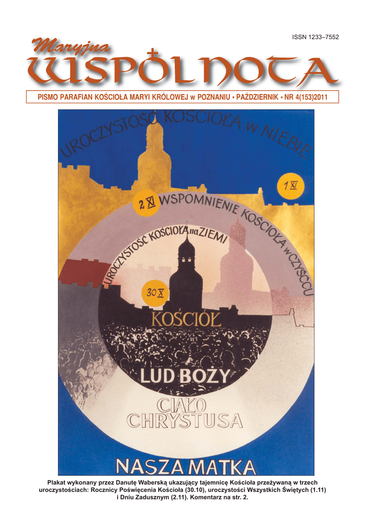 ISSN 1233–7552 PISMO PARAFIAN KOŒCIO£A MARYI KRÓLOWEJ w POZNANIU • PAŹDZIERNIK • NR 4(153)2011 Plakat wykonany przez Danutę Waberską ukazujący tajemnicę Kościoła przeżywaną w trzech uroczystościach: Rocznicy Poświęcenia Kościoła (30.10), uroczystości Wszystkich Świętych (1.11) i Dniu Zadusznym (2.11). Komentarz na str. 2. KOŚCIÓŁ NA ZIEMI Drodzy Parafianie! Liturgia przełomu października i listopada w trzech uroczystościach ukazuje nam tajemnicę Kościoła Katolickiego, który Chrystus założył, w którym Chrystus nas zbawia i do którego mamy łaskę od chrztu świętego należeć. Najpierw, w ostatnią niedzielę październi- ka, w uroczystość Rocznicy Poświęcenia Kościoła parafialnego wspominamy Kościół pielgrzymujący przez ziemię, to znaczy nas. 1 listopada, w uroczystość Wszystkich Świętych obchodzimy święto Kościoła chwalebnego w niebie. Wreszcie, 2 listopada, w Dzień Zaduszny wspominamy Kościół cierpiący w czyśćcu. Niech zamieszczone po- Kościół na stadionie Wspomnienie jednego z naszych ministrantów, uczestników spotkania z Benedyktem XVI w Berlinie starszych kleryków o jego powołaniu, oraz konferencji Księdza Proboszcza na temat papieży i papiestwa, zwłaszcza w ubiegłym stuleciu. Po południu, około 14:00 przyjechaliśmy do Berlina. Na zwiedzanie nie mogliśmy poświęcić wiele czasu, jako że najpóźniej o 17:00 musieliśmy już być na stadionie; mimo to zdążyliśmy się posilić i zwiedzić pozostałości XIX-wiecznego kościoła koronacyj- Fot. archiwum ASD Poznań 22 września, o 9:30 rano spod papieskiego krzyża na Łęgach Dębińskich wyruszyliśmy autobusem do Berlina. Naszym celem było spotkanie z Ojcem Świętym Benedyktem XVI na liturgii Mszy Świętej na Stadionie Olimpijskim. Oprócz Księdza Proboszcza i 13 ministrantów z naszej parafii, w naszej grupie znaleźli się także poznańscy seminarzyści z ks. Marianem Sikorą, jak również zakonnicy ze Zgroma- Msza Święta na Stadionie Olimpijskim – widok z naszego sektora dzeń Karmelitów i Filipinów. W czasie podróży do stolicy Niemiec wysłuchaliśmy konferencji ks. Mariana, połączonej ze świadectwem jednego ze 2 nego Wilhelma I i późniejszych cesarzy niemieckich. Budowla ta jest przykładem tego, jak bardzo instrumentalnie ówczesna władza traktowała Ko- niżej artykuły ożywią naszą miłość do Kościoła, niech pobudzą nas do większej odpowiedzialności za Niego. Pozdrawiam wszystkich Parafian, proszę o modlitwę za Ojca Świętego Benedykta, za Kościół w Polsce, naszą parafię. Modlę się za Was, zwłaszcza za chorych. ks. prob. Marcin Węcławski ściół Ewangelicki i wiarę chrześcijańską. Nie napotkaliśmy żadnej akcji przeciwko wizycie Ojca Świętego w Jego ojczyźnie, jednak mocno raziły oczy plakaty wyborcze partii nacjonalistycznych. Poruszanie się po tym „najbardziej pogańskim mieście Europy” ułatwiał fakt, iż wejściówki na stadion były jednocześnie biletami kolei miejskiej. Tą właśnie koleją dotarliśmy w pobliże Stadionu Olimpijskiego. To piękna sprawa, że obiekt, który był wybudowany na Igrzyska Olimpijskie w 1936 r., będąc miejscem demonstracji siły i sukcesu nazistów i III Rzeszy został teraz użyty jako miejsce sprawowania Najświętszej Ofiary i wielkiego zgromadzenia ludu Bożego. To pośrednio pokazuje, że Bóg nawet z wielkiego zła potrafi wyprowadzić jeszcze większe dobro i że On, Bóg jest Panem historii. Na stadionie z naszych miejsc mieliśmy dobry, choć odległy, widok na ołtarz, oprócz tego mogliśmy oglądać zbliżenia na telebimach. Obejrzeliśmy transmisję przemówienia Ojca Świętego w Bundestagu, a następnie oczekiwaliśmy Jego przybycia na stadion. W międzyczasie miejsca na trybunach i płycie stadionu zapełniały się – niemal wszystkie z ponad 70 000 miejsc zostały zajęte. Pojawiła się też 1,5-tysięczna grupa niemieckiej służby liturgicznej, w ponad połowie dziewczyn-ministrantek, ale… co kraj, to obyczaj. Spora była również grupa Polaków – zarówno na trybunach, jak i na płycie stadionu (polskie flagi!), a także wśród koncelebrujących dostojników kościelnych. KOŚCIÓŁ W CZYŚĆCU święcona tajemnicy Kościoła. Następnie odbyła się Liturgia Eucharystyczna. Po potężnym śpiewie pieśni Grosser Gott, wir loben dich (śpiewamy ją także w naszym kościele, w języku polskim: Ciebie, Boże chwalimy), pełni radości opuściliśmy stadion zaraz po zakończeniu Eucharystii, ok. 20:15. Jeden z kleryków powiedział: Cieszę się, że wybrałem Kościół Katolicki. Tak, to było wspaniałe przeżycie tego, czym jest tajemnica Kościoła. Bogu dziękuj- Fot. R. Rakowski Wreszcie, około 18:00 doczekaliśmy się: papamobile z Benedyktem XVI wśród oklasków i błysku fleszy okrążył płytę stadionu. Powitalne przemówienie wygłosił nowomianowany arcybiskup Berlina Reinhard Voelki (nazwisko pochodzenia polskiego – „wielki”). Mówił, że Berlin nie jest miastem bez Boga, ale miastem największej liczby chrześcijan męczenników, ofiar nazizmu. Można tu dodać, że nowy arcybiskup Berlina swoją rezydencję oddał na W Berlinie na stacji kolei miejskiej stałe trzem wielodzietnym rodzinom, a sam zamieszkał w mieszkaniu w bloku, po wschodniej stronie miasta, by być bliżej zwyczajnych ludzi. Liturgia Słowa przywołała Księgę Ezechiela – obietnicę darowania nam przez Boga „nowego serca” i „nowego ducha”; oraz słowa Jezusa z Ewangelii, porównującego Siebie do winorośli, a uczniów do winnych gron z Niego wyrastających i od Niego zależnych. Homilia Ojca Świętego była po- Czyściec Bywa, że ludzie umierając nawracają się w ostatniej chwili. Pozostawiają za sobą nienaprawione zło, brak przebaczenia. Umierają też bez umiejętności my za dar papieża Benedykta XVI, Bogu dziękujmy za łaskę należenia do Kościoła Katolickiego! Następnie wróciliśmy miejsk