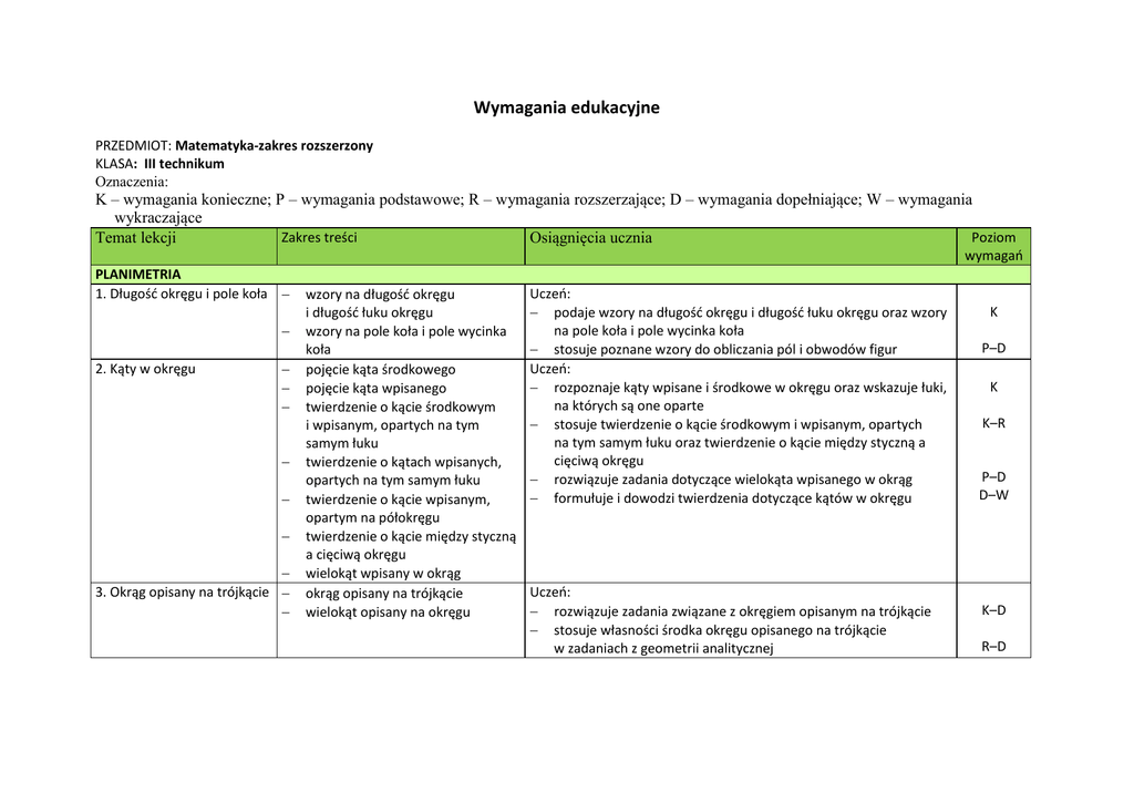 Wymagania edukacyjne PRZEDMIOT: Matematyka-zakres rozszerzony KLASA: III technikum Oznaczenia: K – wymagania konieczne; P – wymagania podstawowe; R – wymagania rozszerzające; D – wymagania dopełniające; W – wymagania wykraczające Zakres treści Poziom Temat lekcji Osiągnięcia ucznia wymagao PLANIMETRIA 1. Długośd okręgu i pole koła 2. Kąty w okręgu 3. Okrąg opisany na trójkącie wzory na długośd okręgu i długośd łuku okręgu wzory na pole koła i pole wycinka koła pojęcie kąta środkowego pojęcie kąta wpisanego twierdzenie o kącie środkowym i wpisanym, opartych na tym samym łuku twierdzenie o kątach wpisanych, opartych na tym samym łuku twierdzenie o kącie wpisanym, opartym na półokręgu twierdzenie o kącie między styczną a cięciwą okręgu wielokąt wpisany w okrąg okrąg opisany na trójkącie wielokąt opisany na okręgu Uczeo: podaje wzory na długośd okręgu i długośd łuku okręgu oraz wzory na pole koła i pole wycinka koła stosuje poznane wzory do obliczania pól i obwodów figur Uczeo: rozpoznaje kąty wpisane i środkowe w okręgu oraz wskazuje łuki, na których są one oparte stosuje twierdzenie o kącie środkowym i wpisanym, opartych na tym samym łuku oraz twierdzenie o kącie między styczną a cięciwą okręgu rozwiązuje zadania dotyczące wielokąta wpisanego w okrąg formułuje i dowodzi twierdzenia dotyczące kątów w okręgu Uczeo: rozwiązuje zadania związane z okręgiem opisanym na trójkącie stosuje własności środka okręgu opisanego na trójkącie w zadaniach z geometrii analitycznej K P–D K K–R P–D D–W K–D R–D 4. Okrąg wpisany w trójkąt 5. Czworokąty wypukłe 6. Okrąg opisany na czworokącie 7. Okrąg wpisany w czworokąt 8. Twierdzenie sinusów 9. Twierdzenie cosinusów Uczeo: rozwiązuje zadania dotyczące okręgu wpisanego w trójkąt prostokątny abc P r , gdzie a , b, c są rozwiązuje zadania związane z okręgiem wpisanym w trójkąt 2 długościami boków tego trójkąta, a przekształca wzory na pole trójkąta i udowadnia je r– długością promienia okręgu wpisanego w ten trójkąt Uczeo: pojęcie figury wypukłej określa własności czworokątów rodzaje czworokątów stosuje własności czworokątów wypukłych do rozwiązywania zadao z planimetrii twierdzenie o okręgu opisanym na Uczeo: czworokącie sprawdza, czy na danym czworokącie można opisad okrąg stosuje twierdzenie o okręgu opisanym na czworokącie do rozwiązywania zadao Uczeo: twierdzenie o okręgu wpisanym w czworokąt sprawdza, czy w dany czworokąt można wpisad okrąg stosuje twierdzenie o okręgu wpisanym w czworokąt do rozwiązywania zadao dowodzi twierdzenia dotyczące okręgu wpisanego w wielokąt Uczeo: twierdzenie sinusów stosuje twierdzenie sinusów do rozwiązywania trójkątów stosuje twierdzenie sinusów do rozwiązywania zdao o kontekście praktycznym przeprowadza dowód twierdzenia sinusów Uczeo: twierdzenie cosinusów stosuje twierdzenie cosinusów do rozwiązywania trójkątów stosuje twierdzenie cosinusów do rozwiązywania zdao o kontekście praktycznym przeprowadza dowód twierdzenia cosinusów okrąg wpisany w trójkąt wzór na pole trójkąta K–P K–D D–W K K–D K–P P–D K–P P–D W K–D P–D W K–D P–D W 10. Powtórzenie wiadomości 11. Praca klasowa i jej omówienie RACHUNEK PRAWDOPODOBIEOSTWA 1. Reguła mnożenia reguła mnożenia ilustracja zbioru wyników doświadczenia za pomocą drzewa 2. Permutacje 3. Wariacje bez powtórzeo 4. Wariacje z powtórzeniami definicja permutacji definicja n! liczba permutacji zbioru n-elementowego definicja wariacji bez powtórzeo liczba k-elementowych wariacji bez powtórzeo zbioru n-elementowego definicja wariacji z powtórzeniami liczba k-elementowych wariacji z powtórzeniami zbioru n-elementowego Uczeo: wypisuje wyniki danego doświadczenia stosuje regułę mnożenia do wyznaczenia liczby wyników doświadczenia spełniających dany warunek przedstawia drzewo ilustrujące zbiór wyników danego doświadczenia Uczeo: wypisuje permutacje danego zbioru oblicza liczbę permutacji danego zbioru przeprowadza obliczenia, stosując definicję silni wykorzystuje permutacje do rozwiązywania zadao Uczeo: oblicza liczbę wariacji bez powtórzeo wykorzystuje wariacje bez powtórzeo do rozwiązywania zadao K–P K–R K–R K K K P–D K–R P–D Uczeo: oblicza liczbę wariacji z powtórzeniami wykorzystuje wariacje z powtórzeniami do rozwiązywania zadao K–R P–D 5. Kombinacje definicja kombinacji liczba k-elementowych kombinacji zbioru n-elementowego symbol Newtona wzór dwumianowy Newtona Uczeo: n oblicza wartośd symbolu Newtona , gdzie n k k oblicza liczbę kombinacji wypisuje k-elementowe kombinacje danego zbioru wykorzystuje kombinacje do rozwiązywania zadao wykorzystuje wzór dwumianowy Newtona do rozwinięcia wyrażeo postaci a b i wyznaczania współczynników wielomianów uzasadnia zależności, w których występuje symbol Newtona K K–R K–P K–D n 6. Kombinatoryka ‒ zadania 7. Zdarzenia losowe Uczeo: reguła dodawania stosuje regułę dodawania do wyznaczenia liczby wyników zestawienie podstawowych pojęd doświadczenia spełniających dany warunek kombinatoryki: permutacje, wariacje i kombinacje wykorzystuje podstawowe pojęcia kombinatoryki do rozwiązywania zadao określenie permutacji z powtórzeniami liczba n-elementowych permutacji z powtórzeniami Uczeo: pojęcie zdarzenia elementarnego określa przestrzeo zdarzeo elementarnych pojęcie przestrzeni zdarzeo elementarnych podaje wyniki sprzyjające danemu zdarzeniu losowemu pojęcie zdarzenia losowego określa zdarzenie niemożliwe i zdarzenie pewne wyniki sprzyjające zdarzeniu wyznacza sumę, iloczyn i różnicę zdarzeo losowych losowemu wypisuje pary zdarzeo przeciwnych i pary zdarzeo zdarzenie pewne, zdarzenie wykluczających się niemożliwe suma, iloczyn i różnica zdarzeo losowych zdarzenia wykluczające się zdarzenie przeciwne W W K–R K–