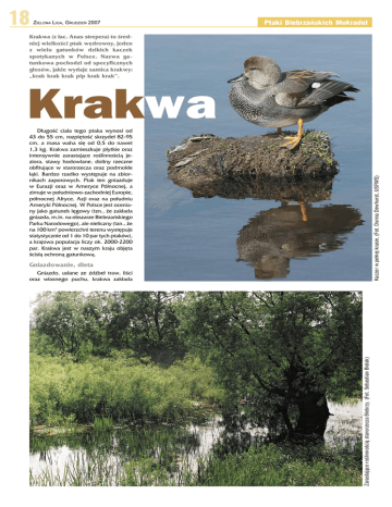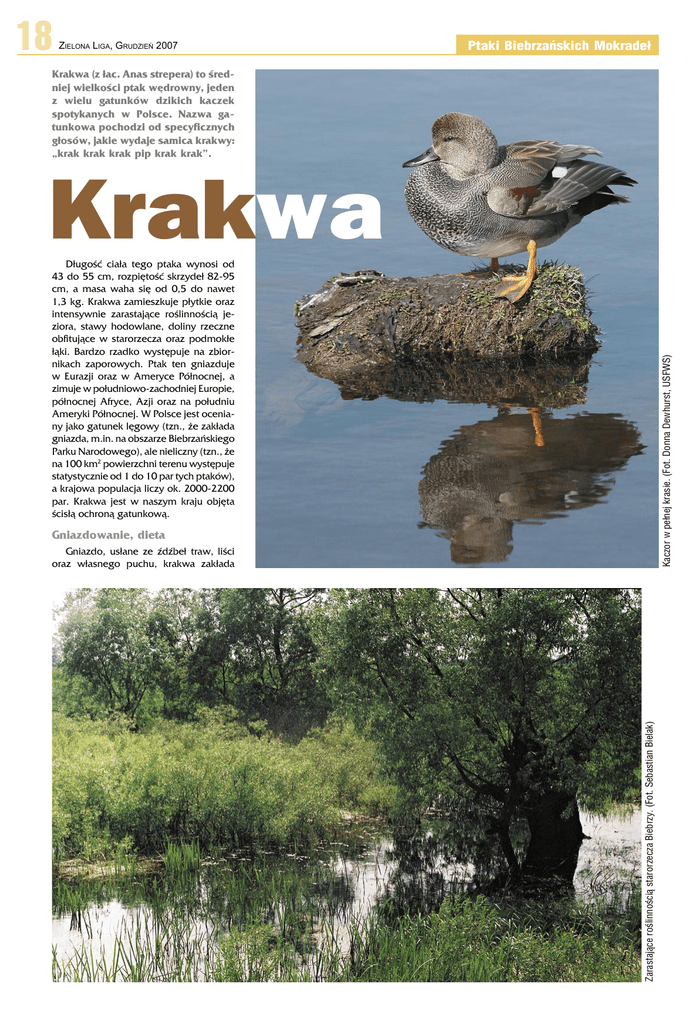18 ZIELONA LIGA, GRUDZIEŃ 2007 Ptaki Biebrzañskich Mokrade³ Krakwa (z łac. Anas strepera) to średniej wielkości ptak wędrowny, jeden z wielu gatunków dzikich kaczek spotykanych w Polsce. Nazwa gatunkowa pochodzi od specyficznych głosów, jakie wydaje samica krakwy: „krak krak krak pip krak krak”. Krakwa Kaczor w pełnej krasie. (Fot. Donna Dewhurst, USFWS) Długość ciała tego ptaka wynosi od 43 do 55 cm, rozpiętość skrzydeł 82-95 cm, a masa waha się od 0,5 do nawet 1,3 kg. Krakwa zamieszkuje płytkie oraz intensywnie zarastające roślinnością jeziora, stawy hodowlane, doliny rzeczne obfitujące w starorzecza oraz podmokłe łąki. Bardzo rzadko występuje na zbiornikach zaporowych. Ptak ten gniazduje w Eurazji oraz w Ameryce Północnej, a zimuje w południowo-zachodniej Europie, północnej Afryce, Azji oraz na południu Ameryki Północnej. W Polsce jest oceniany jako gatunek lęgowy (tzn., że zakłada gniazda, m.in. na obszarze Biebrzańskiego Parku Narodowego), ale nieliczny (tzn., że na 100 km2 powierzchni terenu występuje statystycznie od 1 do 10 par tych ptaków), a krajowa populacja liczy ok. 2000-2200 par. Krakwa jest w naszym kraju objęta ścisłą ochroną gatunkową. Gniazdowanie, dieta Zarastające roślinnością starorzecza Biebrzy. (Fot. Sebastian Bielak) Gniazdo, usłane ze źdźbeł traw, liści oraz własnego puchu, krakwa zakłada Ptaki Biebrzañskich Mokrade³ ZIELONA LIGA, GRUDZIEŃ 2007 19 Samica krakwy. (Fot. Dave Menke, USFWS) Krakwa w Polsce Krakwa jest ptakiem rzadko spotykanym i mało znanym, widuje się ją zazwyczaj na wodzie, wśród gęstej roślinności, natomiast na brzeg schodzi sporadycznie. Nie tworzy zwartych stad, tak jak np. cyraneczka, a w Polsce pojawia się od marca do maja (przelot wiosenny) oraz od września do listopada (przelot jesienny). Na Śląsku niewielkie stadka krakw pozostają czasami aż do drugiej połowy grudnia. Wiosną najwięcej ptaków pojawia się w drugiej połowie kwietnia, a jesienią jest nawet jeszcze liczniejsza. Krakwa występuje w całym kraju i jest gatunkiem, który systematycznie zwiększa swoją liczebność oraz wciąż zasiedla nowe, dotąd niezamieszkane obszary. Najlepszym przykładem jest tutaj Śląsk, a zwłaszcza dolina Baryczy. Jeszcze w latach Samica krakwy z pisklętami. (Fot. John i Karen Hollingsworth, USFWS) Kaczor krakwy w szatach godowych. (Fot. Donna Dewhurst, USFWS) wprost na ziemi, wśród gęstej roślinności przybrzeżnej, ale zawsze w pobliżu wody. Często znajduje się ono na wysepkach pod osłoną krzewów lub drzew. W okresie od kwietnia do lipca samica składa do niego 6-14 kremowożółtych (z odcieniem zielonego) jaj, które następnie wysiaduje przez 27-28 dni. Małymi kaczuszkami opiekuje się tylko samica, opuszczają one gniazdo wkrótce po wylęgu i uzyskują samodzielność po 55 dniach. Zdarza się, że samice wychowujące młode łączą się w niewielkie stadka, zazwyczaj jednak prowadzą bardzo skryty tryb życia. Krakwy wyprowadzają tylko jedno pokolenie potomstwa w ciągu roku. Ich dieta jest bardzo urozmaicona, zjadają zarówno delikatniejsze pędy i liście roślin wodnych, nasiona zbóż, żołędzie jak i też drobny plankton, owady i ich larwy, mniejsze małże, ślimaki, skorupiaki, kijanki, małe żaby, ryby, a nawet polne myszy. 80. XX wieku na całym Śląsku występowało od 300 do 320 par tych ptaków, zlokalizowanych w 50 miejscach, natomiast obecnie tyle ptaków znajduje się tylko w samej doliny Baryczy. Cała śląska populacja oceniana jest na 650-700 par występujących w ponad 100 miejscach, co daje wzrost w przeciągu dwudziestolecia o ok. 120%. W skali całego kraju nastąpił wzrost z ok. 1500 par notowanych na początku lat 80. XX wieku do 2000-2200 par zarejestrowanych pod koniec lat 90. (wzrost o ok. 40%). Niestety, na północy kraju, zwłaszcza na terenach mokradłowych wysychających na skutek spadku zwierciadła wód gruntowych, ptak ten zanika. Prawdopodobnie dlatego, pomimo idealnych warunków siedliskowych, krakwa jest rzadko spotykana na terenie Biebrzańskiego Parku Narodowego. Ptak ten zimuje w naszym kraju nielicznie, choć ostatnio zauważono nasilanie się tego zjawiska – zwłaszcza na Śląsku oraz w Małopolsce. SEBASTIAN BIELAK Zdjęcia (USFWS) zostały udostępnione dzięki uprzejmości United States Fish and Wildlife Service