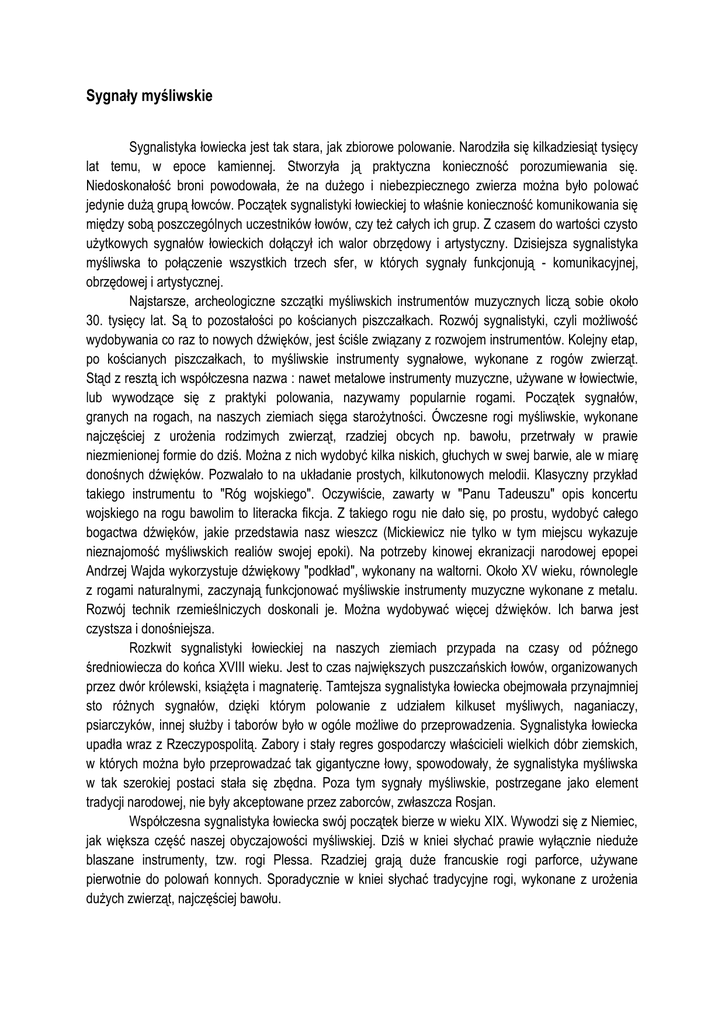 Sygnały myśliwskie Sygnalistyka łowiecka jest tak stara, jak zbiorowe polowanie. Narodziła się kilkadziesiąt tysięcy lat temu, w epoce kamiennej. Stworzyła ją praktyczna konieczność porozumiewania się. Niedoskonałość broni powodowała, że na dużego i niebezpiecznego zwierza można było polować jedynie dużą grupą łowców. Początek sygnalistyki łowieckiej to właśnie konieczność komunikowania się między sobą poszczególnych uczestników łowów, czy też całych ich grup. Z czasem do wartości czysto użytkowych sygnałów łowieckich dołączył ich walor obrzędowy i artystyczny. Dzisiejsza sygnalistyka myśliwska to połączenie wszystkich trzech sfer, w których sygnały funkcjonują - komunikacyjnej, obrzędowej i artystycznej. Najstarsze, archeologiczne szczątki myśliwskich instrumentów muzycznych liczą sobie około 30. tysięcy lat. Są to pozostałości po kościanych piszczałkach. Rozwój sygnalistyki, czyli możliwość wydobywania co raz to nowych dźwięków, jest ściśle związany z rozwojem instrumentów. Kolejny etap, po kościanych piszczałkach, to myśliwskie instrumenty sygnałowe, wykonane z rogów zwierząt. Stąd z resztą ich współczesna nazwa : nawet metalowe instrumenty muzyczne, używane w łowiectwie, lub wywodzące się z praktyki polowania, nazywamy popularnie rogami. Początek sygnałów, granych na rogach, na naszych ziemiach sięga starożytności. Ówczesne rogi myśliwskie, wykonane najczęściej z urożenia rodzimych zwierząt, rzadziej obcych np. bawołu, przetrwały w prawie niezmienionej formie do dziś. Można z nich wydobyć kilka niskich, głuchych w swej barwie, ale w miarę donośnych dźwięków. Pozwalało to na układanie prostych, kilkutonowych melodii. Klasyczny przykład takiego instrumentu to "Róg wojskiego". Oczywiście, zawarty w "Panu Tadeuszu" opis koncertu wojskiego na rogu bawolim to literacka fikcja. Z takiego rogu nie dało się, po prostu, wydobyć całego bogactwa dźwięków, jakie przedstawia nasz wieszcz (Mickiewicz nie tylko w tym miejscu wykazuje nieznajomość myśliwskich realiów swojej epoki). Na potrzeby kinowej ekranizacji narodowej epopei Andrzej Wajda wykorzystuje dźwiękowy "podkład", wykonany na waltorni. Około XV wieku, równolegle z rogami naturalnymi, zaczynają funkcjonować myśliwskie instrumenty muzyczne wykonane z metalu. Rozwój technik rzemieślniczych doskonali je. Można wydobywać więcej dźwięków. Ich barwa jest czystsza i donośniejsza. Rozkwit sygnalistyki łowieckiej na naszych ziemiach przypada na czasy od późnego średniowiecza do końca XVIII wieku. Jest to czas największych puszczańskich łowów, organizowanych przez dwór królewski, książęta i magnaterię. Tamtejsza sygnalistyka łowiecka obejmowała przynajmniej sto różnych sygnałów, dzięki którym polowanie z udziałem kilkuset myśliwych, naganiaczy, psiarczyków, innej służby i taborów było w ogóle możliwe do przeprowadzenia. Sygnalistyka łowiecka upadła wraz z Rzeczypospolitą. Zabory i stały regres gospodarczy właścicieli wielkich dóbr ziemskich, w których można było przeprowadzać tak gigantyczne łowy, spowodowały, że sygnalistyka myśliwska w tak szerokiej postaci stała się zbędna. Poza tym sygnały myśliwskie, postrzegane jako element tradycji narodowej, nie były akceptowane przez zaborców, zwłaszcza Rosjan. Współczesna sygnalistyka łowiecka swój początek bierze w wieku XIX. Wywodzi się z Niemiec, jak większa część naszej obyczajowości myśliwskiej. Dziś w kniei słychać prawie wyłącznie nieduże blaszane instrumenty, tzw. rogi Plessa. Rzadziej grają duże francuskie rogi parforce, używane pierwotnie do polowań konnych. Sporadycznie w kniei słychać tradycyjne rogi, wykonane z urożenia dużych zwierząt, najczęściej bawołu. Do dziś zachowało się w tradycji polowania, wraz z zapisem nutowym, około 60. sygnałów myśliwskich. Spora ich część zatraciła już rację bytu na łowach np. sygnał "Przywołanie kobiet". Na współczesnych polowaniach gra się poniżej 30. sygnałów. Faktyczną popularnością cieszy się zaledwie kilkanaście. Sygnały łowieckie, tak dziś, jak i 300 lat temu, możemy ogólnie podzielić na sygnały informacyjne i obrzędowo-uroczyste. Pierwsze z nich nadal wypełniają rolę przekaźnika praktycznych informacji między uczestnikami polowania. Kolejne podkreślają uroczysty charakter wydarzenia, bądź sytuacji, jakie zaistniały w trakcie łowów. Sygnały, które dziś rozbrzmiewają w polskiej kniei to : Pobudka - budzi myśliwych ze snu np. podczas kilkudniowego polowania Powitanie - sygnał uroczysty. Wita uczestników łowów. Zbiórka myśliwych - wzywa uczestników polowania do odprawy przed polowaniem. Apel na łowy - sygnał natury bardziej obrzędowej, niż praktycznej : Wszystko gotowe, można rozpoczynać polowanie. Naganka naprzód ! - jeden z nielicznych sygnałów, umieszczony w aktualnych przepisach łowieckich. Nakazuje kierownikowi naganki, by ta ruszyła w miot. Informuje myśliwych o rozpoczęciu pędzenia. Do naganki skierowanych może być więcej sygnałów porządkowych - "Naganka szybciej !", "Naganka wolniej!", "Prawe skrzydło naganki szybciej", "Naganka równaj!", "Naganka stój!" itd. Zakaz strzału w miot - kolejny sygnał, zawarty w przepisach łowieckich. Naganka jest za blisko, wolno strzelać wyłącznie poza miot. Koniec pędzenia, rozładuj broń - trzeci i ostatni sygnał, umieszczony w ministerialnym rozporządzeniu o zasadach wykonywania polowania. Oznacza koniec pędzenia i obowiązek rozładowania broni. Myśliwy może opuścić swoje stanowisko. Posiłek - ogłasza przerwę w polowaniu, przeznaczoną na śniadanie-obiad. Kolejna grupa to sygnały grane na śmierć zwierza. Jest ich kilkadziesiąt. Praktycznie gra się kilkanaście, odpowiadających kilkunastu gatunkom zwierzyny. Sygnały te rozbrzmiewają po zakończeniu polowania, przy ułożonym poko