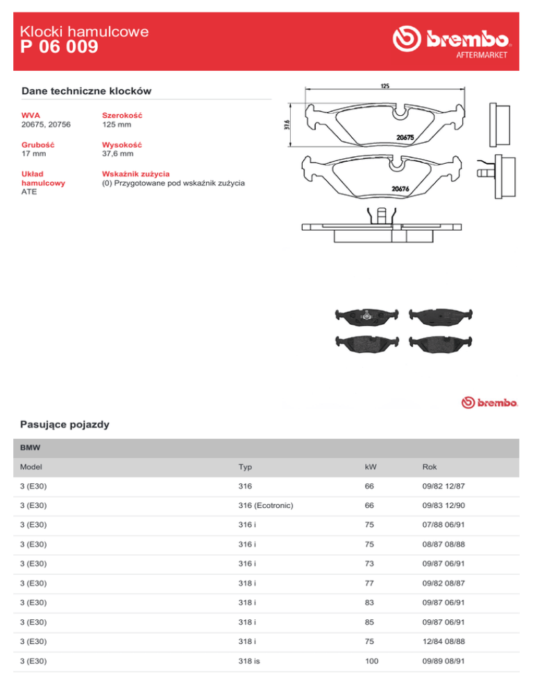 Klocki hamulcowe P 06 009 Dane techniczne klocków WVA 20675, 20756 Szerokość 125 mm Grubość 17 mm Wysokość 37,6 mm Układ hamulcowy ATE Wskaźnik zużycia (0) Przygotowane pod wskaźnik zużycia Pasujące pojazdy BMW Model Typ kW Rok 3 (E30) 316 66 09/82 12/87 3 (E30) 316 (Ecotronic) 66 09/83 12/90 3 (E30) 316 i 75 07/88 06/91 3 (E30) 316 i 75 08/87 08/88 3 (E30) 316 i 73 09/87 06/91 3 (E30) 318 i 77 09/82 08/87 3 (E30) 318 i 83 09/87 06/91 3 (E30) 318 i 85 09/87 06/91 3 (E30) 318 i 75 12/84 08/88 3 (E30) 318 is 100 09/89 08/91 3 (E30) 320 i 92 09/82 12/85 3 (E30) 320 i 110 12/85 06/90 3 (E30) 320 i 95 12/85 06/91 3 (E30) 320 is 141 05/88 12/90 3 (E30) 323 i 102 09/82 08/83 3 (E30) 323 i 110 09/83 08/86 3 (E30) 324 d 63 09/85 08/91 3 (E30) 324 td 85 09/87 08/91 3 (E30) 325 e 2.7 95 01/85 08/87 3 (E30) 325 e 2.7 90 10/83 12/88 3 (E30) 325 i 126 09/83 11/89 3 (E30) 325 i 125 12/86 06/91 3 (E30) 325 i X 126 03/86 12/87 3 (E30) 325 i X 125 12/86 08/91 3 Convertible (E30) 318 i 103 06/88 02/92 3 Convertible (E30) 318 i 83 09/90 10/93 3 Convertible (E30) 320 i 93 04/86 10/93 3 Convertible (E30) 320 i 95 04/86 10/93 3 Convertible (E30) 325 i 125 09/87 10/93 3 Convertible (E30) 325 i 126 12/85 12/87 3 Touring (E30) 316 i 73 09/91 06/94 3 Touring (E30) 316 i 75 09/91 06/94 3 Touring (E30) 318 i 83 04/89 06/94 3 Touring (E30) 318 i 85 09/87 06/91 3 Touring (E30) 320 i 95 01/88 12/91 3 Touring (E30) 324 td 85 01/88 06/93 3 Touring (E30) 325 i 125 07/87 03/93 3 Touring (E30) 325 i X 125 06/88 10/93 5 (E28) 520 i 92 06/81 12/87 5 (E28) 520 i 95 08/85 12/87 5 (E28) 520 i 110 12/86 12/87 5 (E28) 524 d 63 03/86 12/87 5 (E28) 524 td 85 09/83 12/87 5 (E28) 525 e 92 05/83 12/87 5 (E28) 525 e 90 09/81 12/87 5 (E28) 525 e 95 12/84 12/87 5 (E28) 525 i 110 06/81 12/87 5 (E28) 528 i 135 06/81 12/87 5 (E28) 535 i 210 01/85 12/87 5 (E28) 535 i, M 535 i 136 01/85 12/87 5 (E28) 535 i, M 535 i 141 01/85 12/87 5 (E28) 535 i, M 535 i 160 01/85 12/87 5 (E28) M5 211 08/85 12/87 6 (E24) 628 CSi 135 09/79 08/87 6 (E24) 635 CSi 160 06/78 08/88 6 (E24) 635 CSi 155 08/87 04/89 6 (E24) 635 CSi 160 11/81 04/89 6 (E24) 635 CSi 136 12/77 04/89 6 (E24) 635 CSi 141 12/77 04/89 6 (E24) M 635 CSi 191 03/83 04/89 6 (E24) M 635 CSi 210 04/84 12/88 6 (E24) M 635 CSi 191 04/86 02/89 7 (E23) 728 i 135 07/78 08/86 7 (E23) 735 i 136 01/85 08/86 7 (E23) 735 i 141 04/85 08/86 7 (E23) 735 i 160 06/82 06/86 7 (E23) 735 i 160 09/79 08/86 7 (E23) 745 i 185 04/80 04/83 7 (E23) 745 i 185 05/83 08/86 Numery OE Pasujące kody OE BMW 34211153196 BMW 34211153913 BMW 34211154398 BMW 34211154399 BMW 34211154613 BMW 34211154614 BMW 34211155077 BMW 34211156744 BMW 34211156745 BMW 34211156746 BMW 34211156747 BMW 34211156748 BMW 34211156749 BMW 34211157514 BMW 34211157757 BMW 34211157758 BMW 34211157925 BMW 34211157926 BMW 34211158323 BMW 34211158643 BMW 34211158912 BMW 34211159003 BMW 34211159273 BMW 34211159276 BMW 34212226013